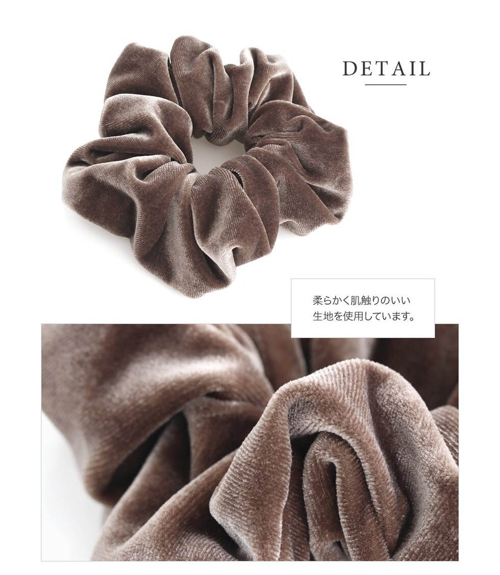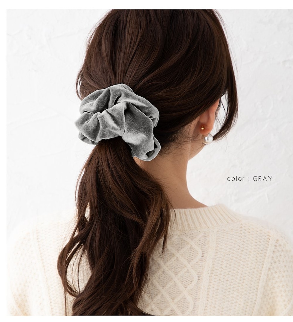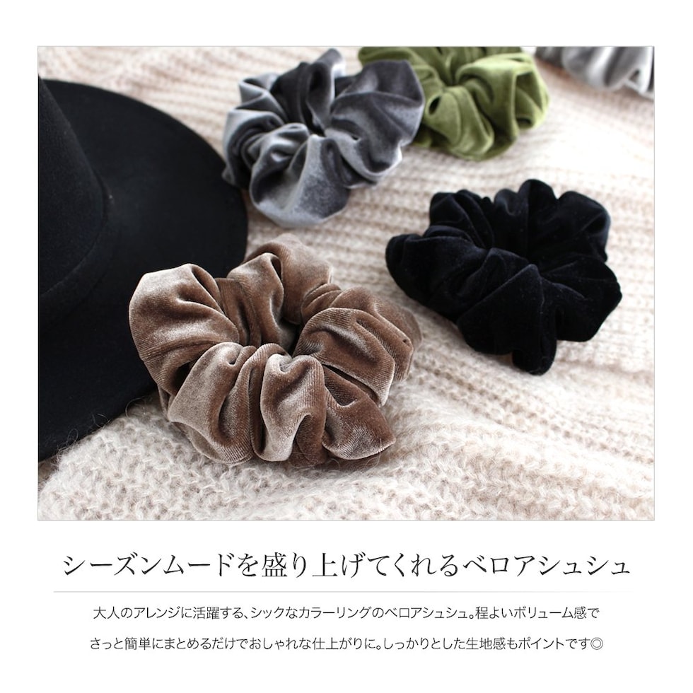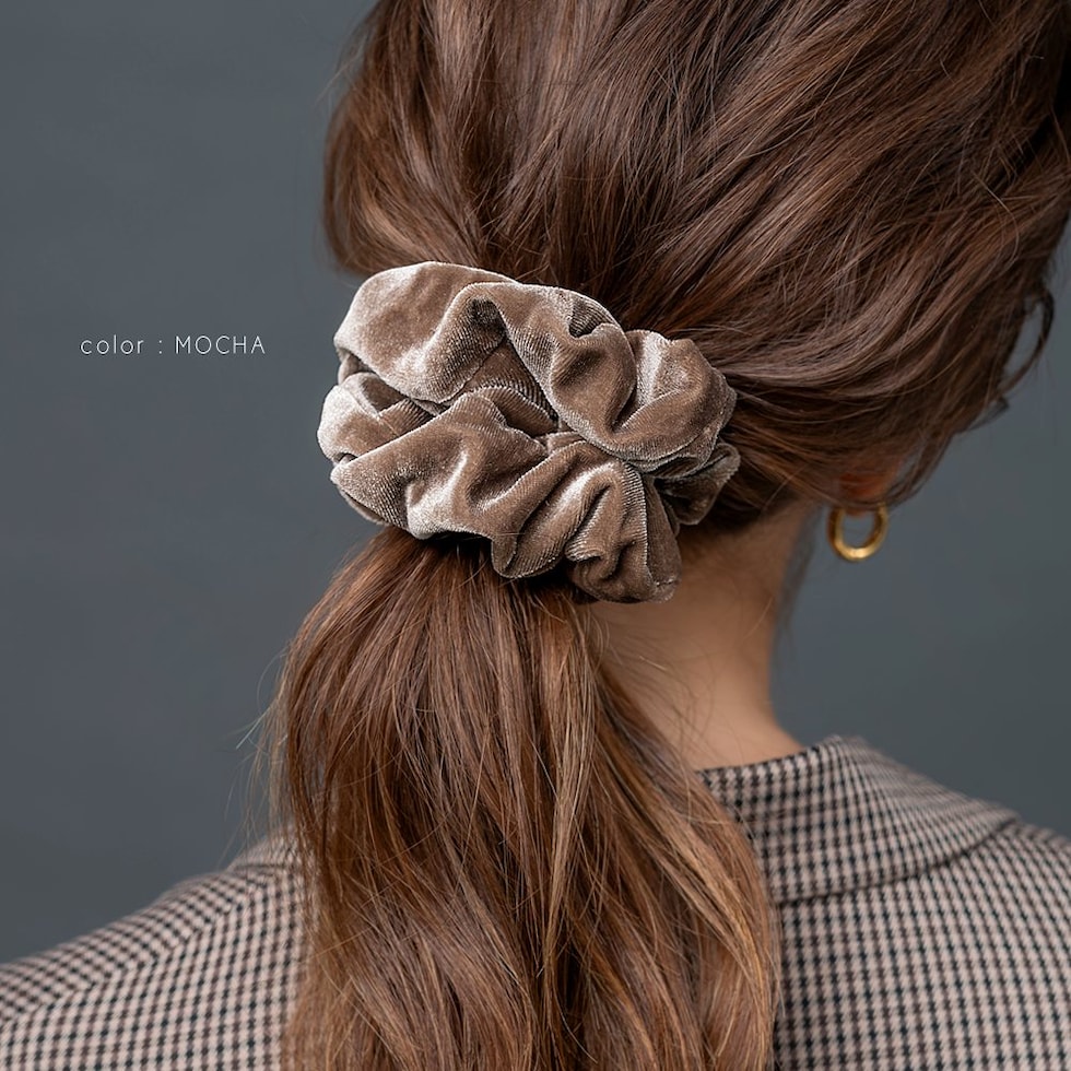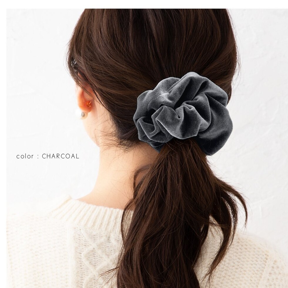 大人のアレンジに活躍する、シックなカラーリングのベロアシュシュ。程よいボリューム感でさっと簡単にまとめるだけでおしゃれな仕上がりに。しっかりとした生地感もポイントです◎
