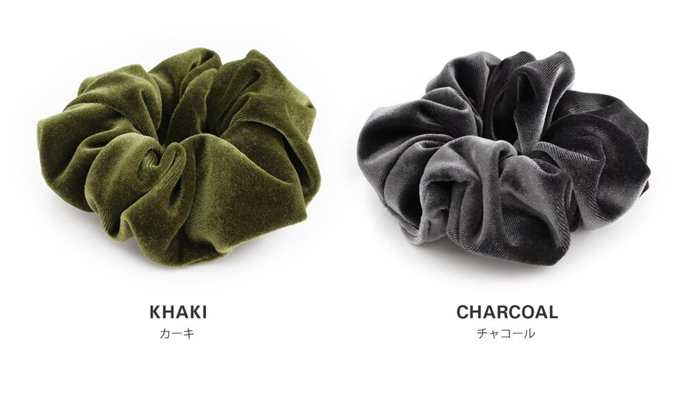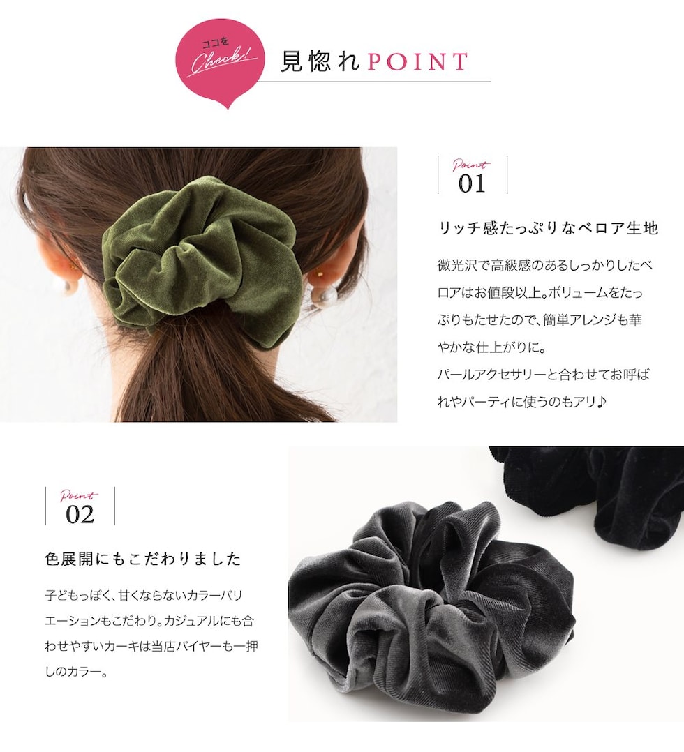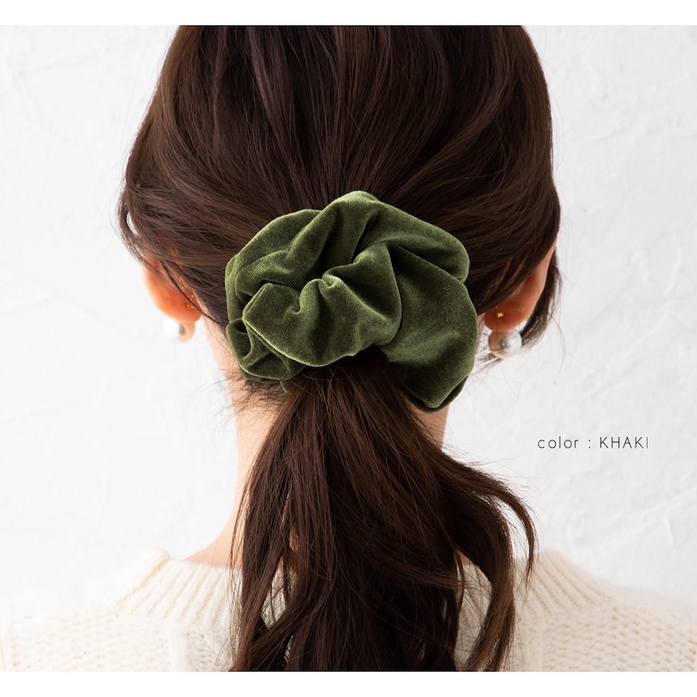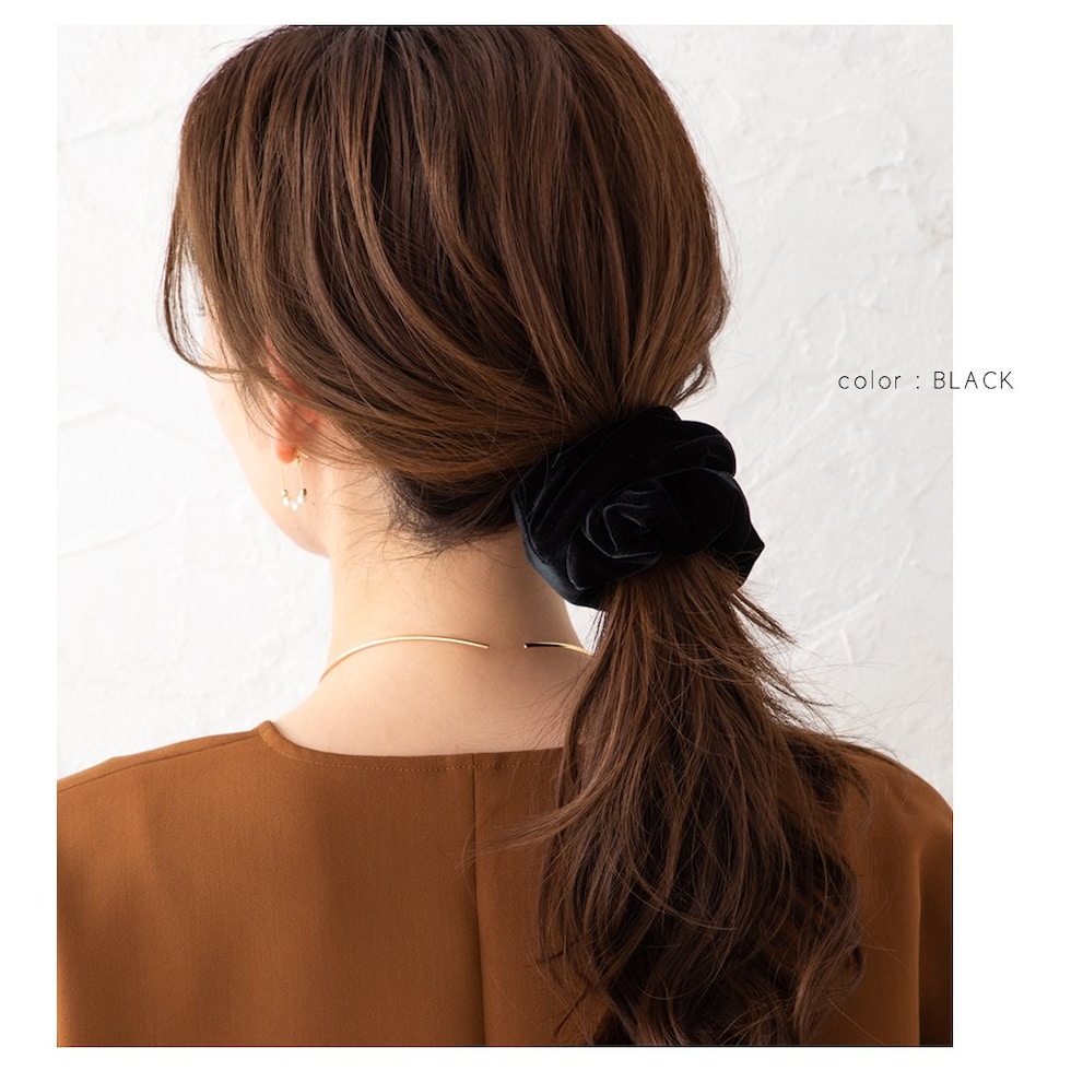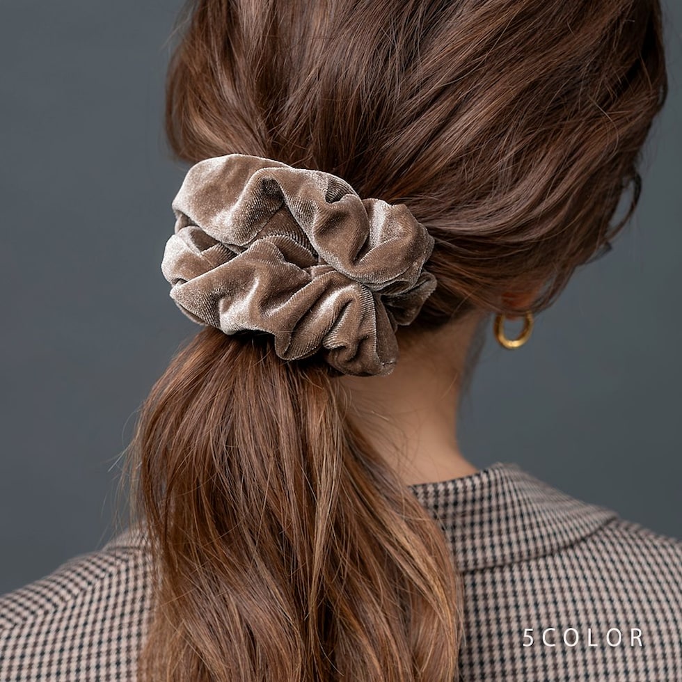 大人のアレンジに活躍する、シックなカラーリングのベロアシュシュ。程よいボリューム感でさっと簡単にまとめるだけでおしゃれな仕上がりに。しっかりとした生地感もポイントです◎