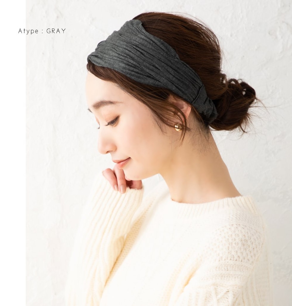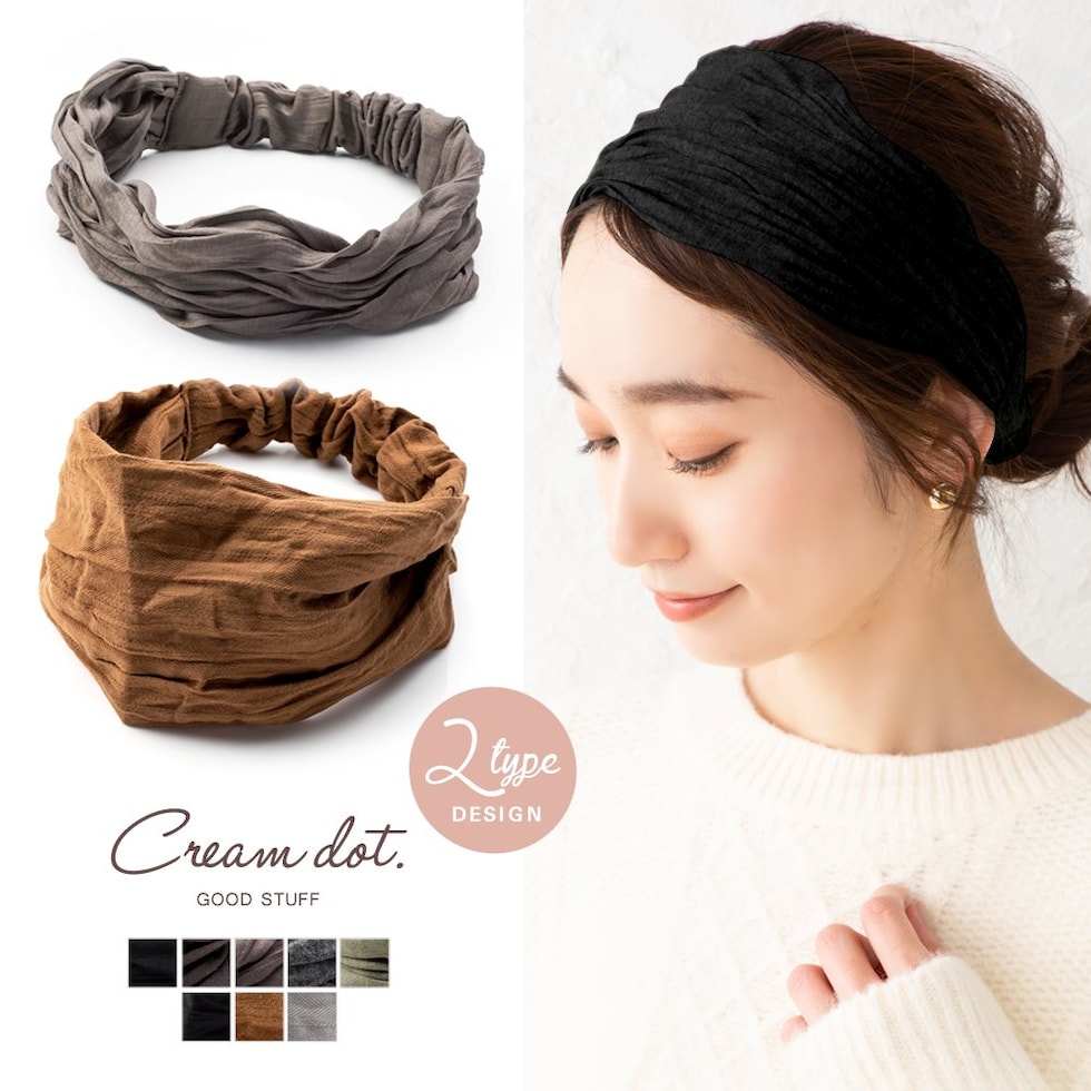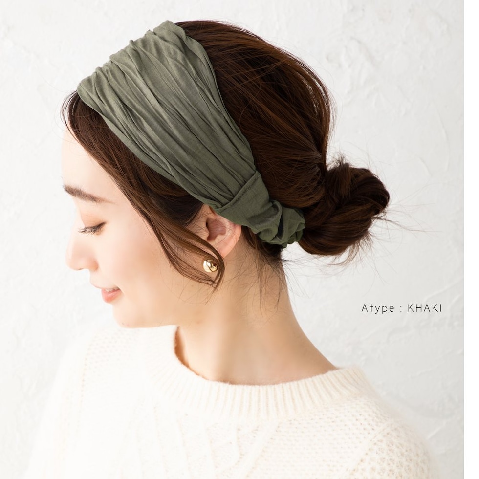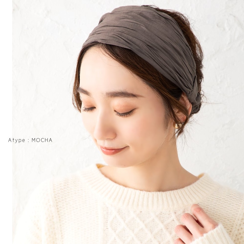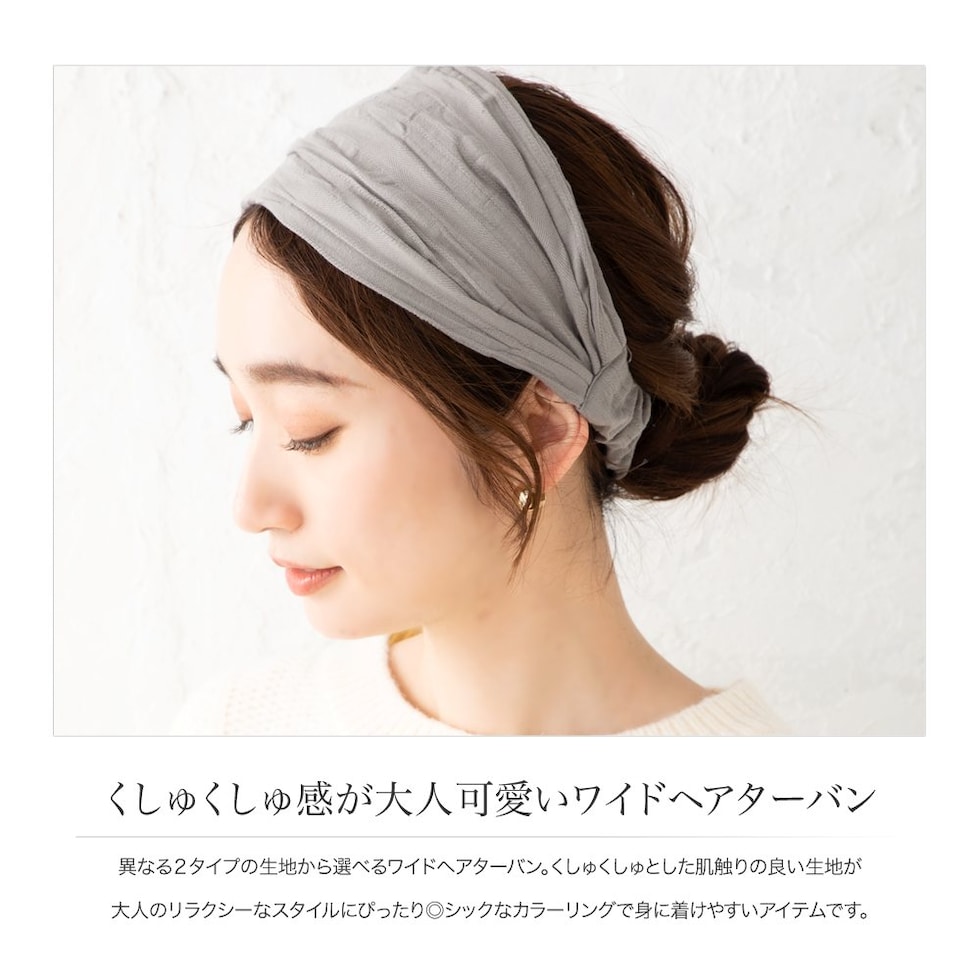 異なる2タイプの生地から選べるワイドヘアターバン。くしゅくしゅとした肌触りの良い生地が大人のリラクシーなスタイルにぴったり◎シックなカラーリングで身に着けやすいアイテムです。