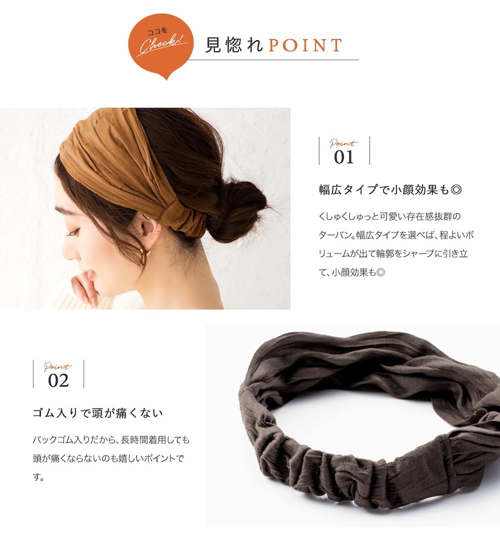 くしゅくしゅっと可愛い存在感抜群のターバン。幅広タイプを選べば、程よいボリュームが出て輪郭をシャープに引き立て、小顔効果も◎