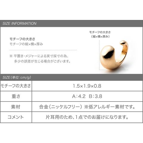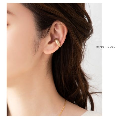 ドロップのように片側をぷっくりとさせたフォルムが愛らしい片耳用メタルイヤーカフ。