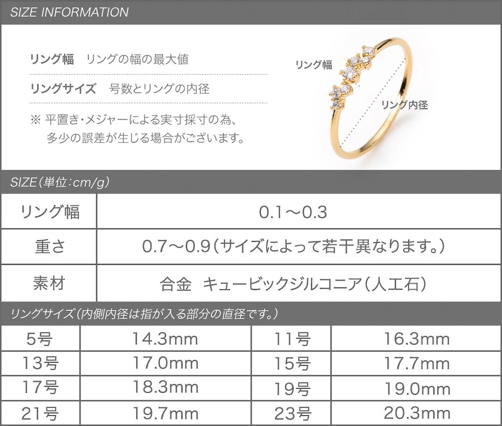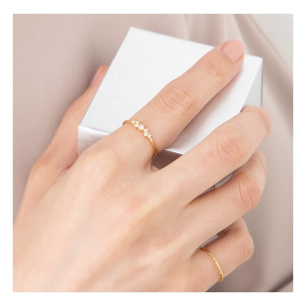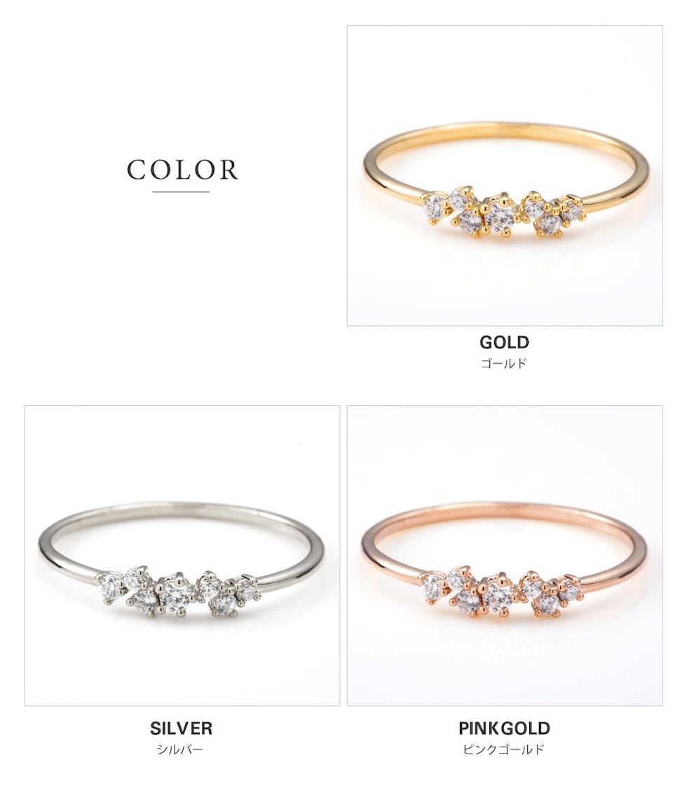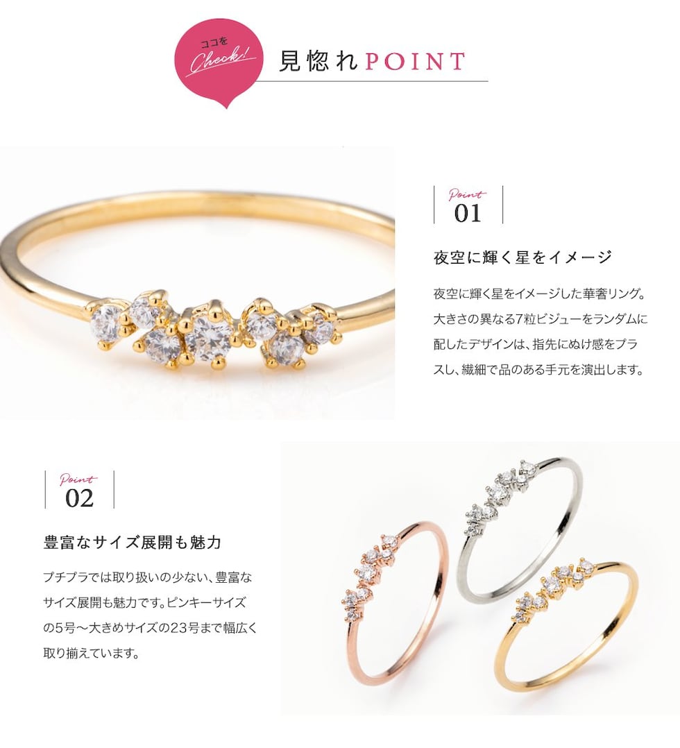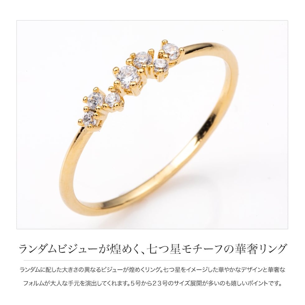 ランダムに配した大きさの異なるビジューが煌めくリング。七つ星をイメージした華やかなデザインと華奢なフォルムが大人な手元を演出してくれます。5号から23号のサイズ展開が多いのも嬉しいポイントです。