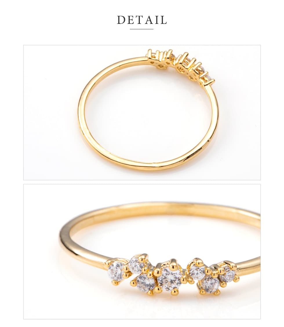 夜空に輝く星をイメージした華奢リング。大きさの異なる7粒ビジューをランダムに配したデザインは、指先にぬけ感をプラスし、繊細で品のある手元を演出します。
