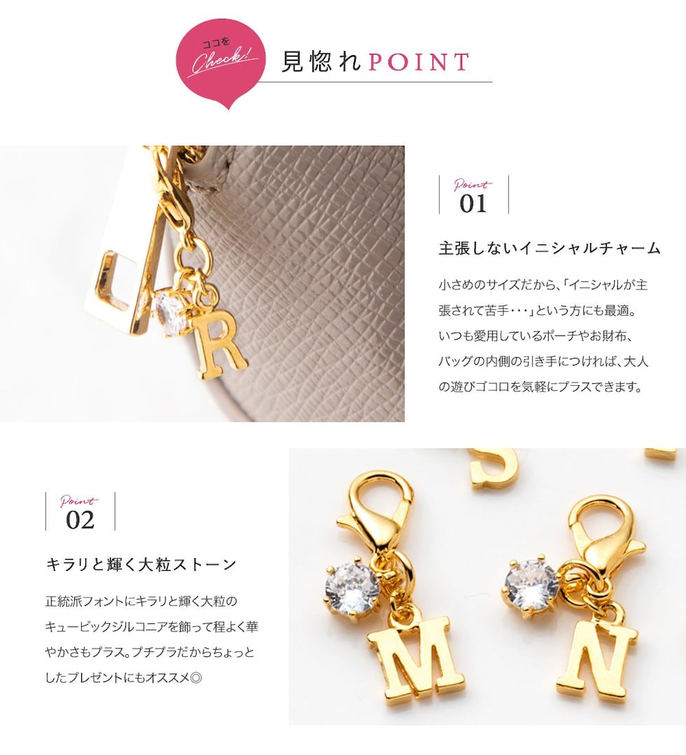 小さめのサイズだから、「イニシャルが主張されて苦手・・・」という方にも最適。いつも愛用しているポーチやお財布、バッグの内側の引き手につければ、大人の遊びゴコロを気軽にプラスできます。