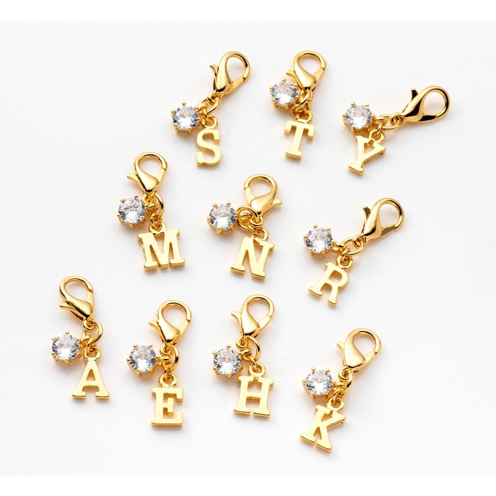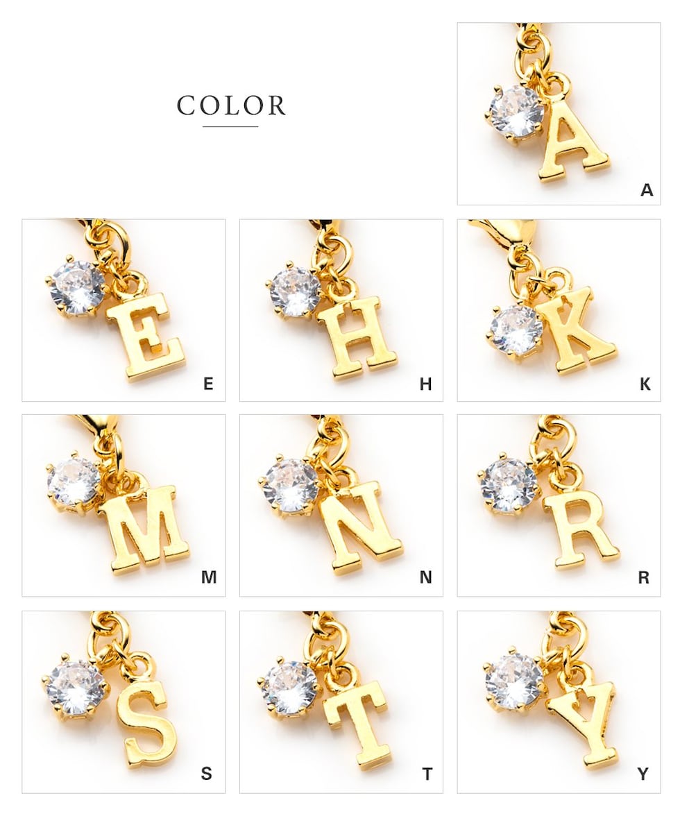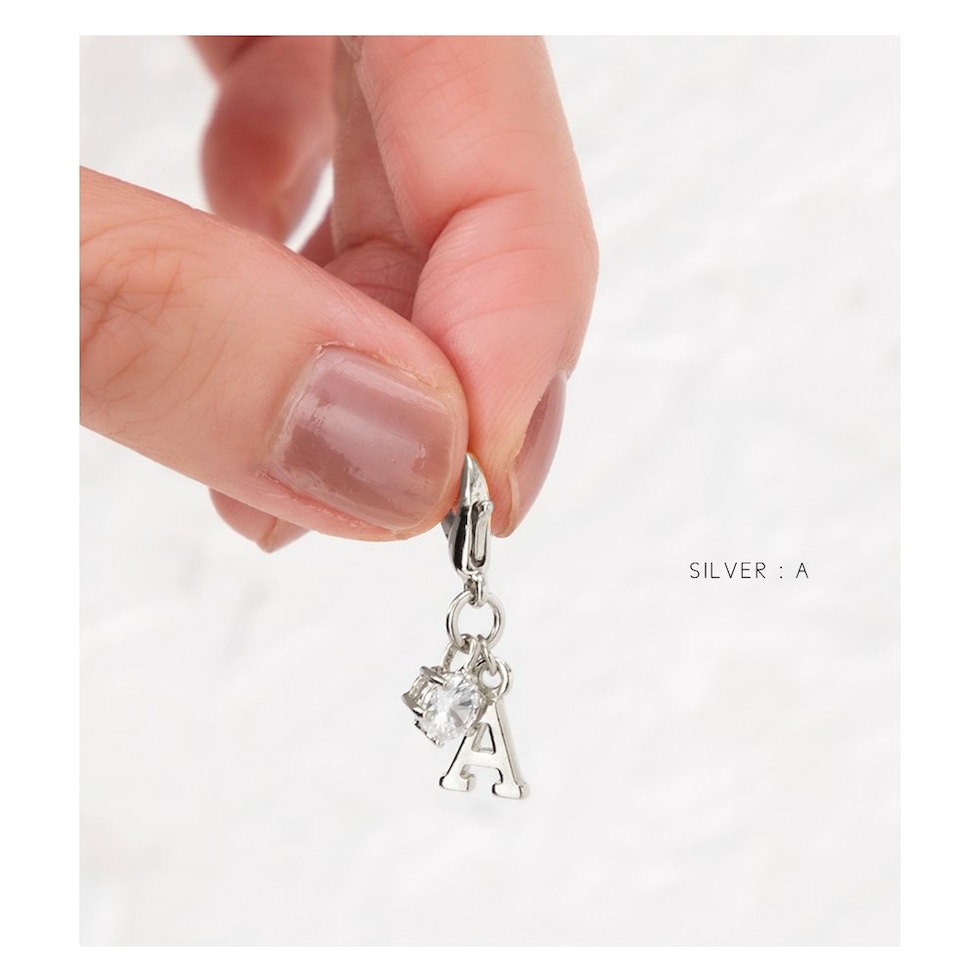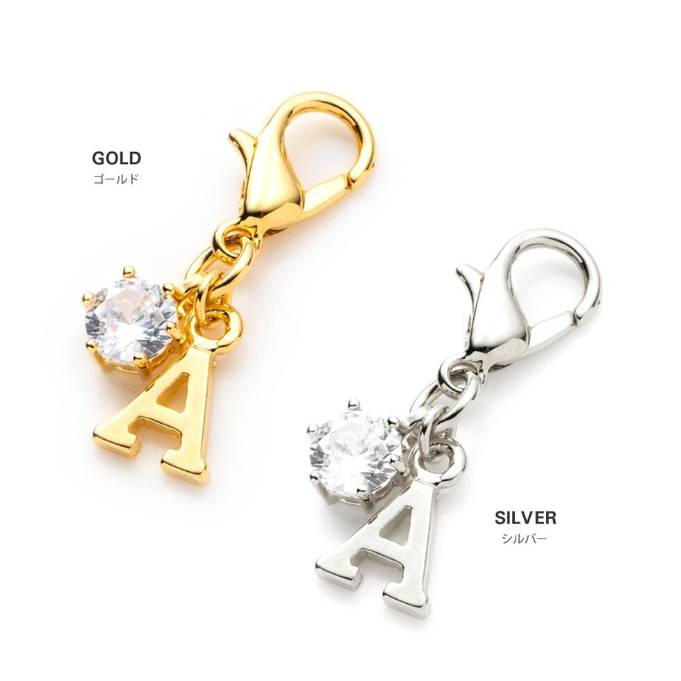 アルファベットのモチーフと一粒ビジューが可愛いイニシャルチャーム。小さめのサイズで主張しすぎないから、ポーチやお財布、バッグのさりげないワンポイントにぴったり。