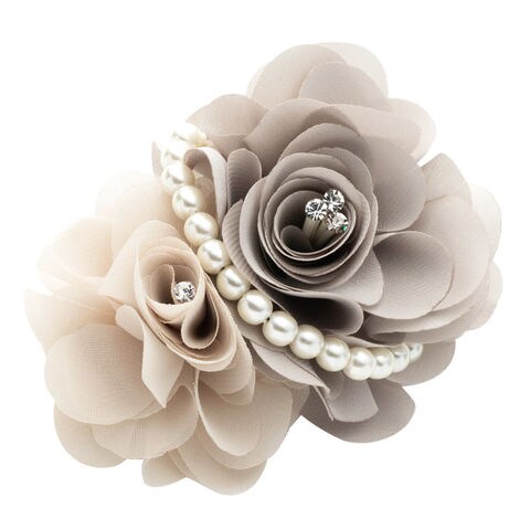 落ち着いた色合いのバイカラーフラワーにパールラインとチュール合わせたボリュームコサージュ。