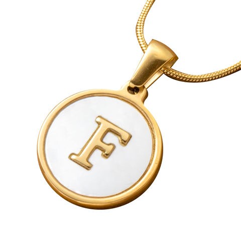 スクエア×あずきチェーンとラウンド×スネークチェーンの2タイプから選べる、シェルプレートのイニシャルネックレス。錆びにくく傷に強いステンレス製です。少し長めの46cmチェーンは、襟つきシャツにもぴったり。