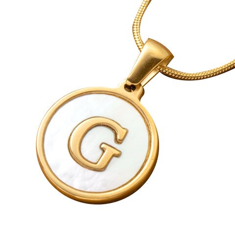 スクエア×あずきチェーンとラウンド×スネークチェーンの2タイプから選べる、シェルプレートのイニシャルネックレス。錆びにくく傷に強いステンレス製です。少し長めの46cmチェーンは、襟つきシャツにもぴったり。