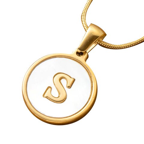 スクエア×あずきチェーンとラウンド×スネークチェーンの2タイプから選べる、シェルプレートのイニシャルネックレス。錆びにくく傷に強いステンレス製です。少し長めの46cmチェーンは、襟つきシャツにもぴったり。