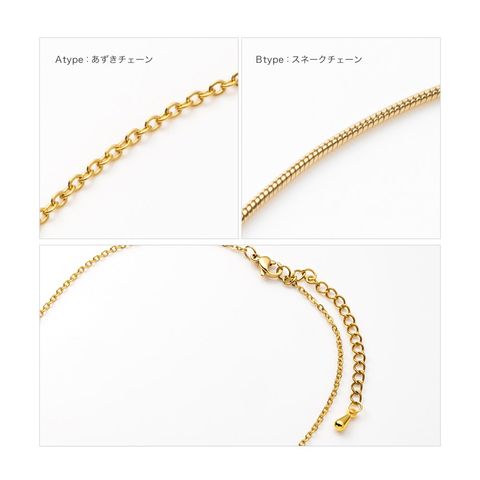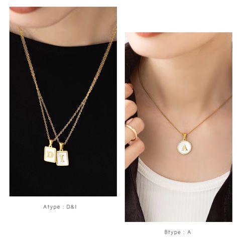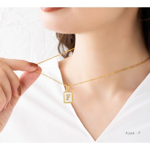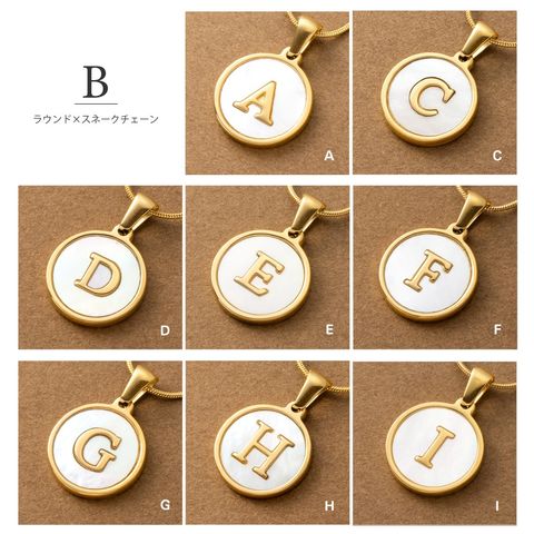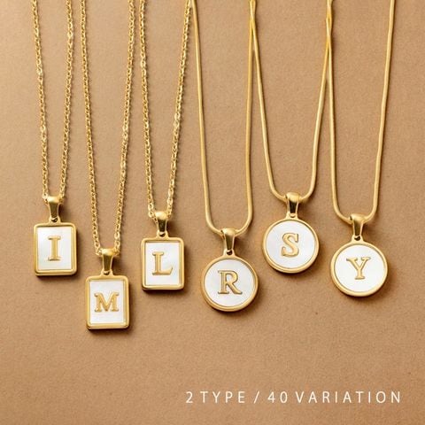 スクエア×あずきチェーンとラウンド×スネークチェーンの2タイプから選べる、シェルプレートのイニシャルネックレス。錆びにくく傷に強いステンレス製です。少し長めの46cmチェーンは、襟つきシャツにもぴったり。