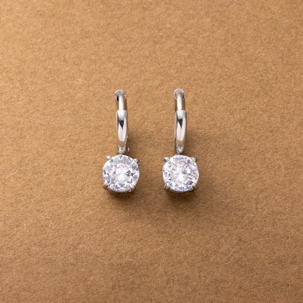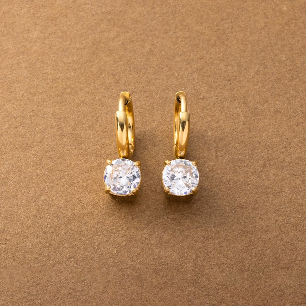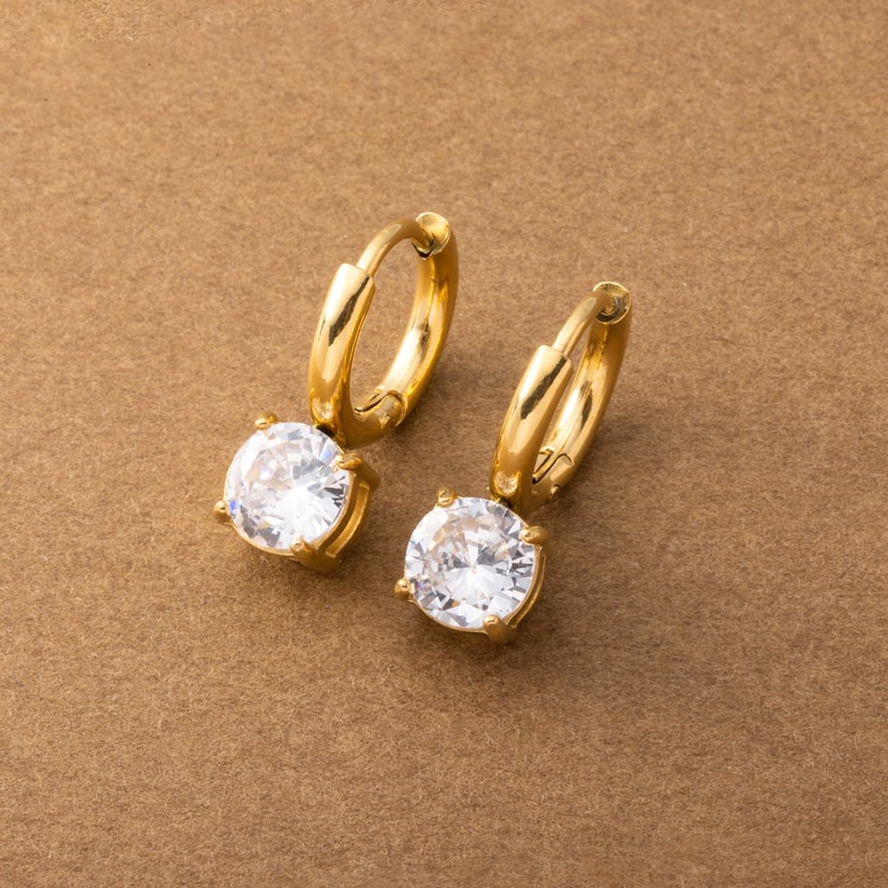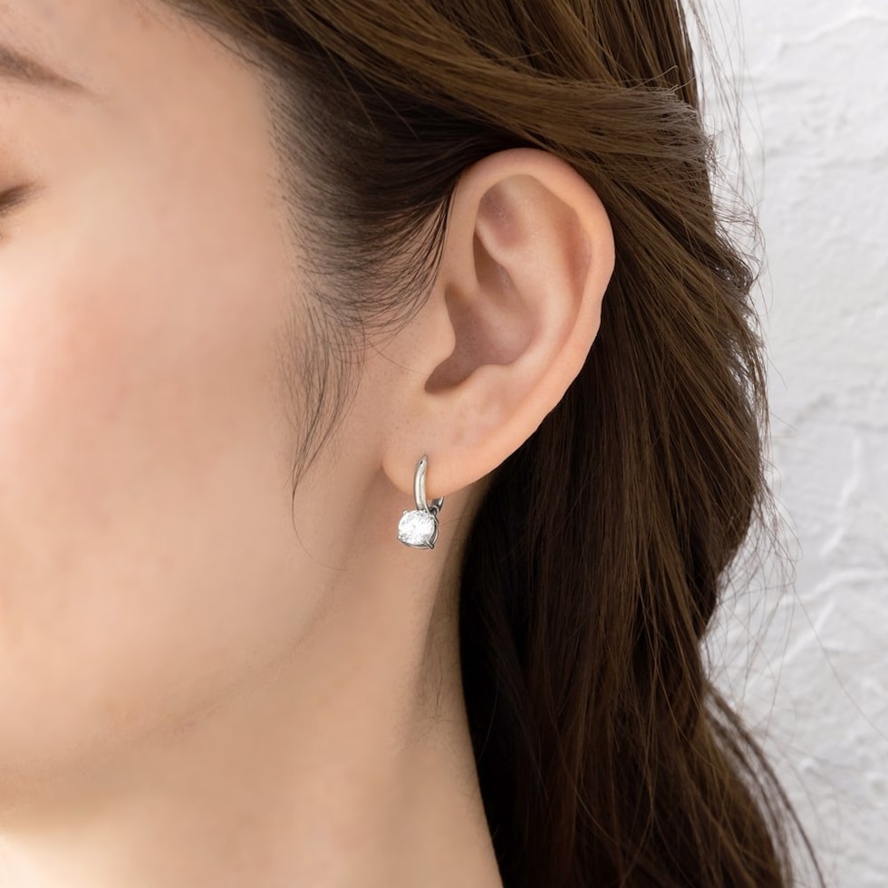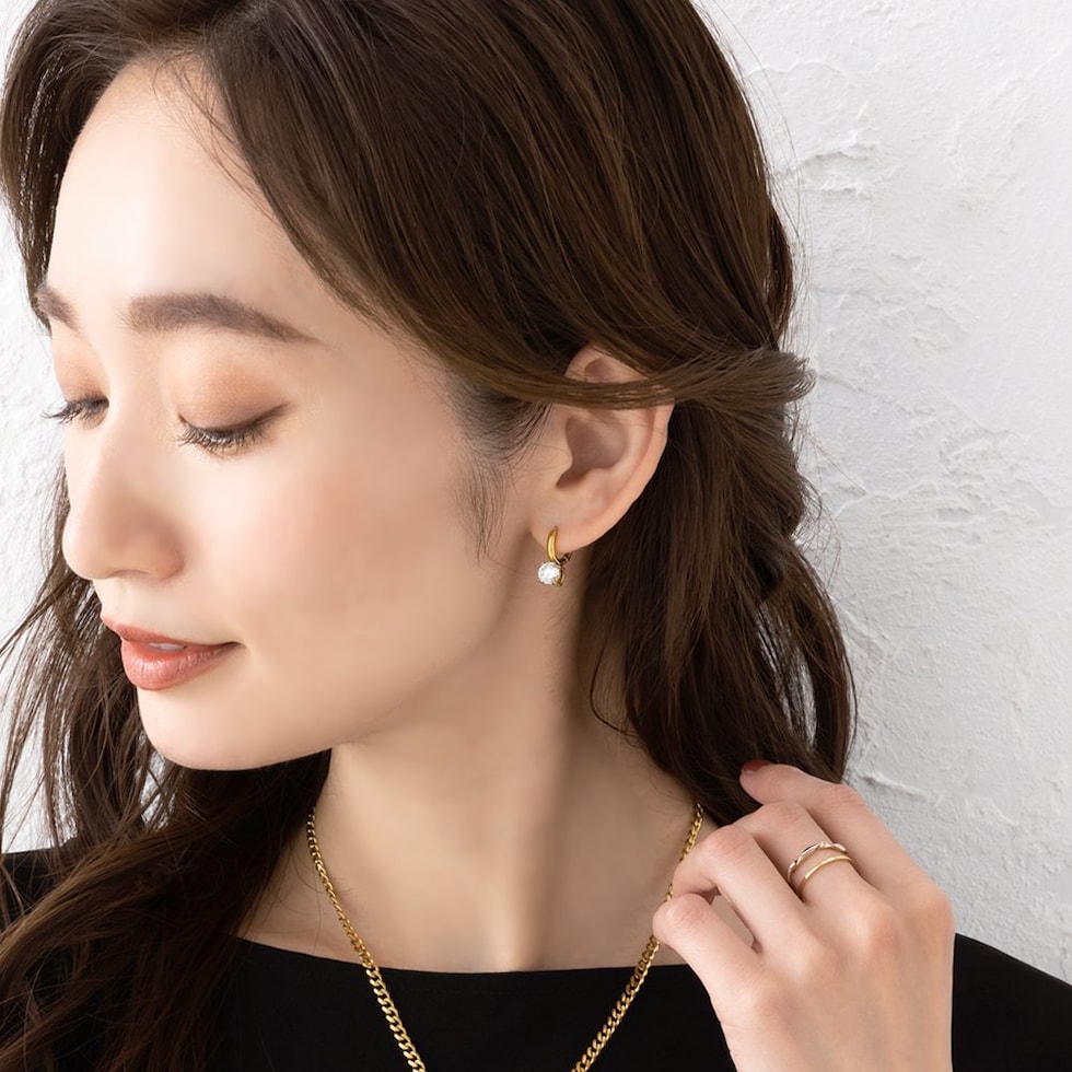 一粒ビジューが程よい存在感を放つキャッチレスフープピアス。シンプルだけど女性らしさを演出してくれるアイテムです。錆びにくいステンレス製でデイリーに活躍するひと品。