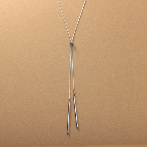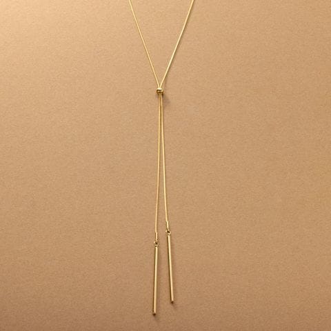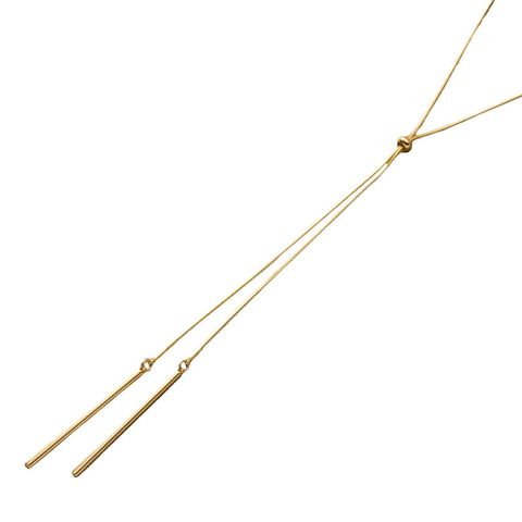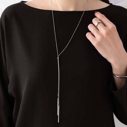 2つのメタルバーが揺れるY字ラリエットのロングネックレス。立体感のあるバーと、艶感のあるスネークチェーンが洗練された大人な雰囲気に仕上げてくれます。きれいめにもカジュアルにも合わせやすく、錆びにくいステンレス製でデイリーに活躍しそう。
