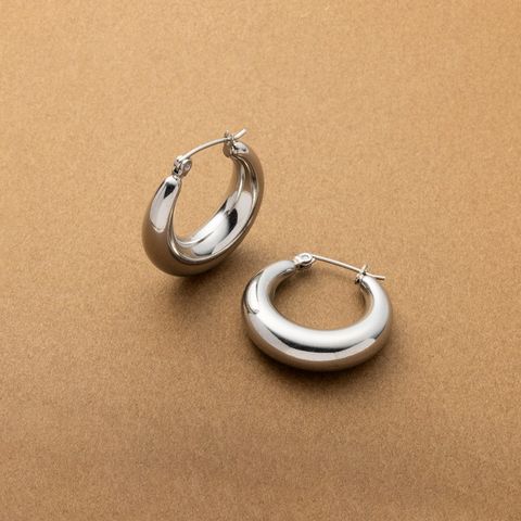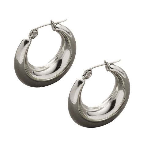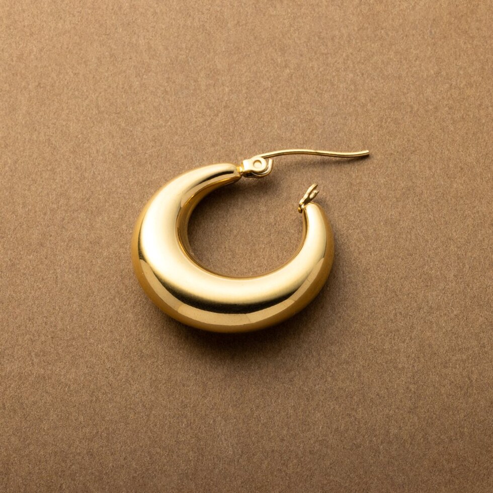 メタルドロップが艶めくキャッチレスフープピアス。シンプルで重厚感のあるシルエットがモードな雰囲気演出します。見た目より軽い着け心地と錆びにくいステンレス製でデイリーに活躍するひと品。