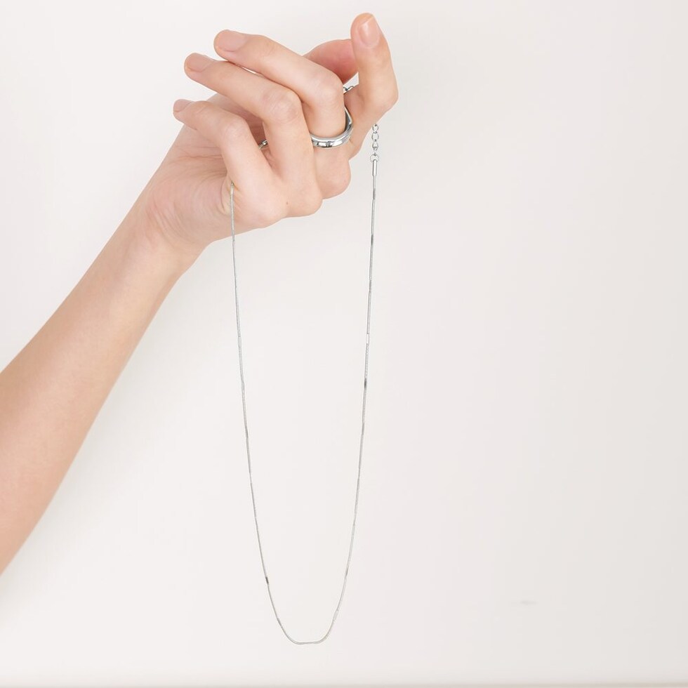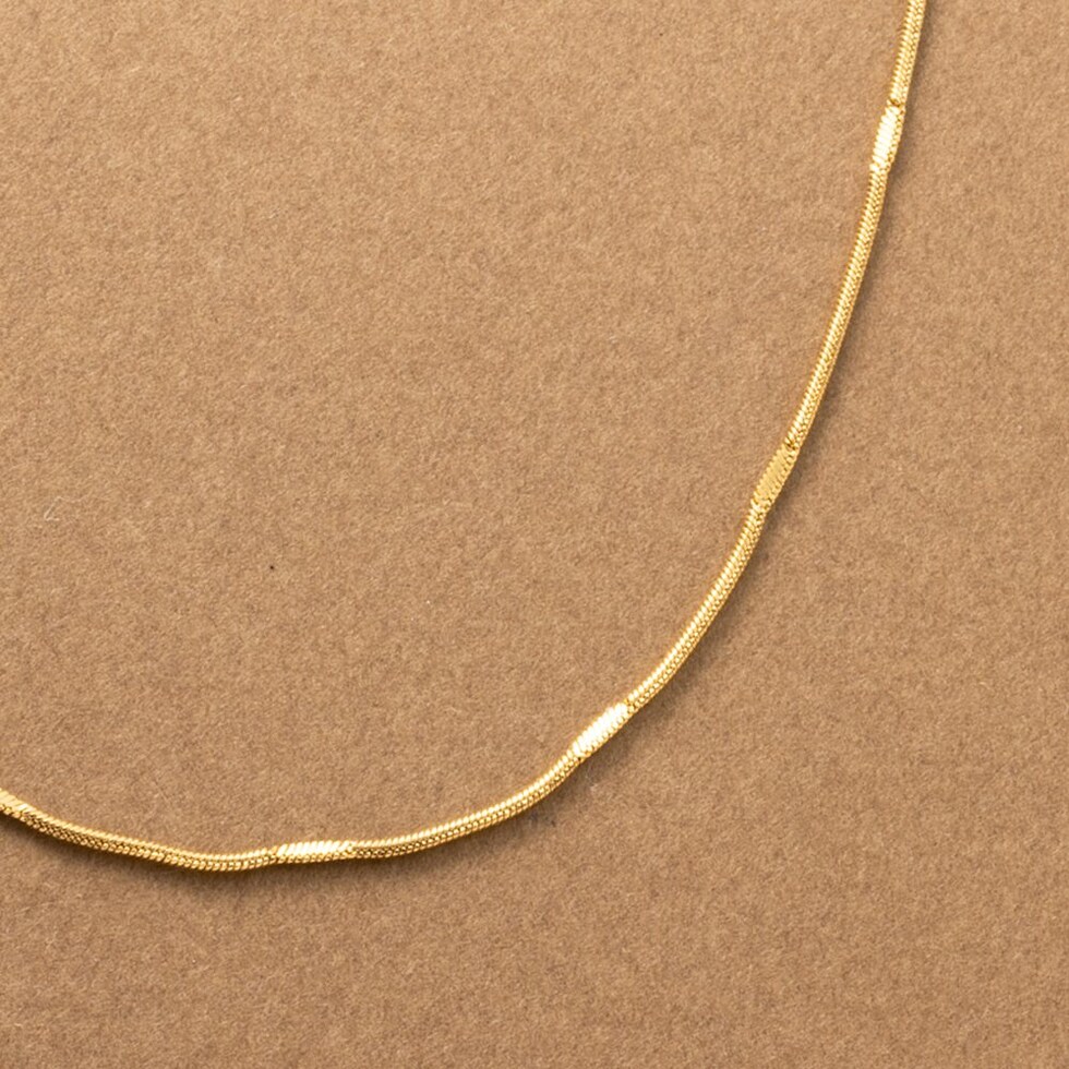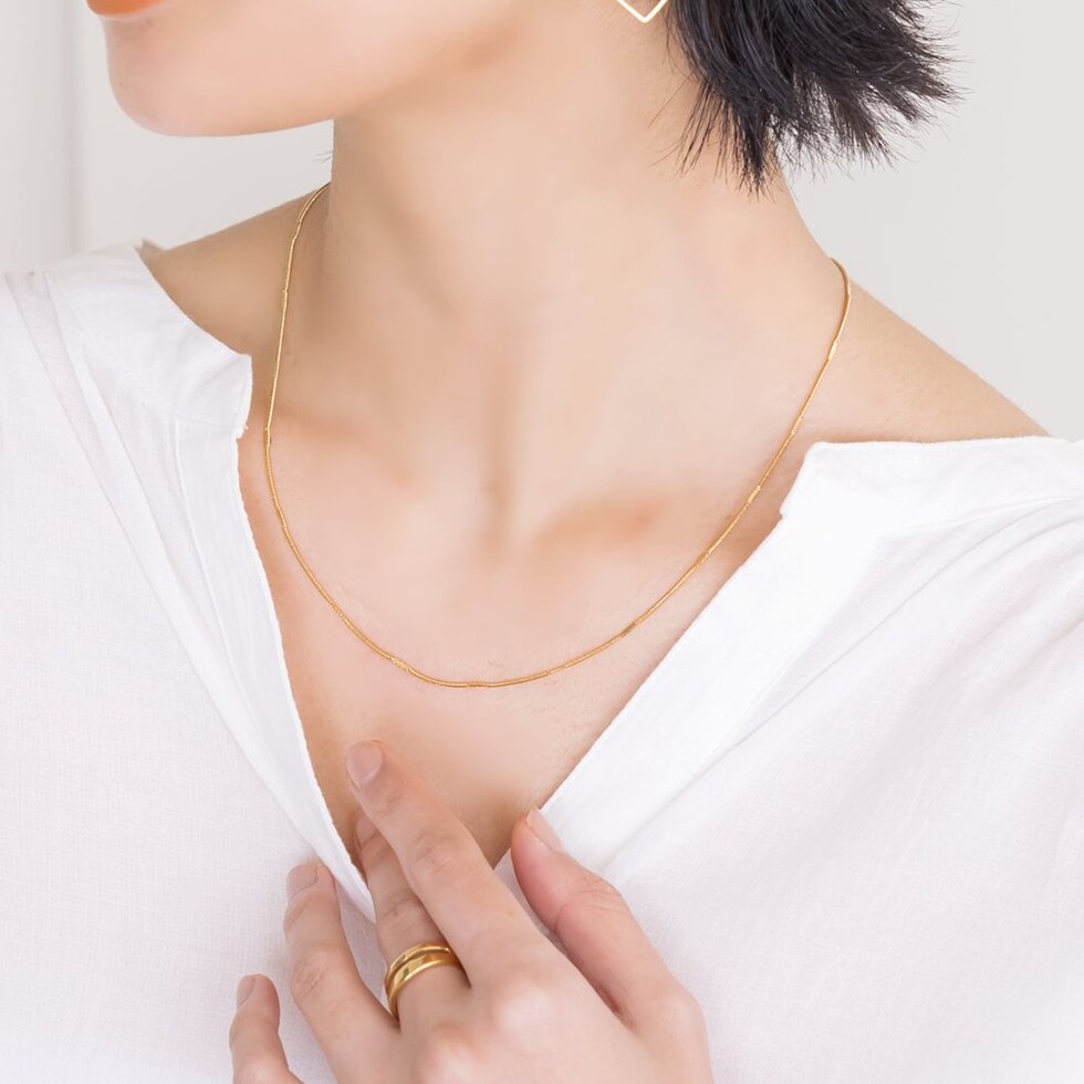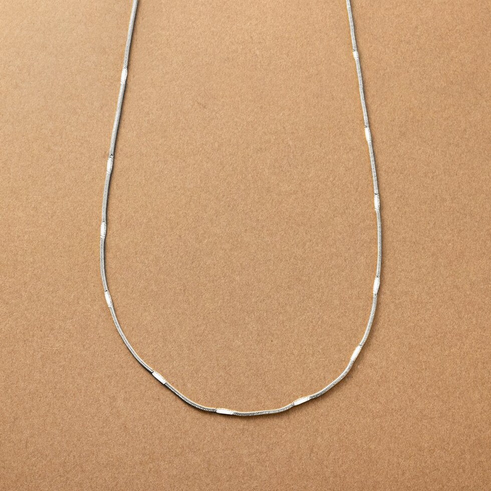 大人っぽいミニマルデザインの華奢ネックレス。しなやかなスネークチェーンに、さりげなくたたき加工を施してアクセントづけ。単品はもちろん、お手持ちのネックレスと重ねづけしたりとマルチに使い回せるアイテムです。錆びにくく傷に強いステンレス製でデイリーに活躍間違いナシ◎