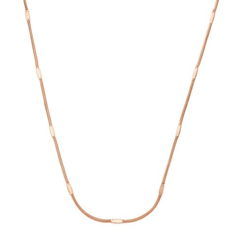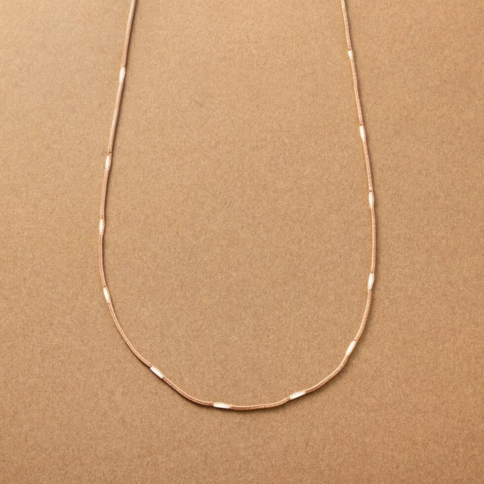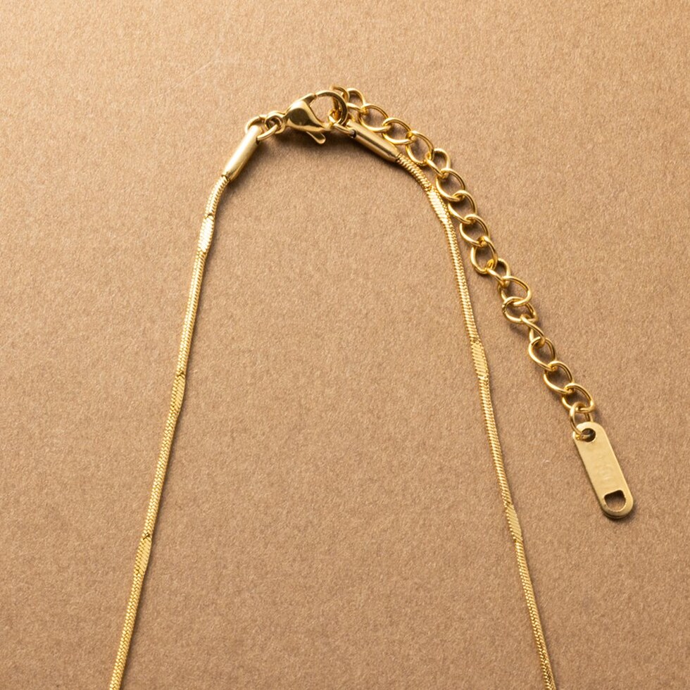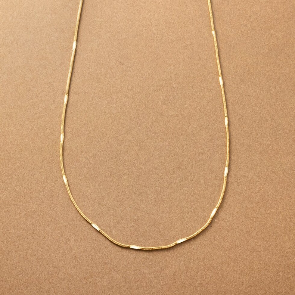大人っぽいミニマルデザインの華奢ネックレス。しなやかなスネークチェーンに、さりげなくたたき加工を施してアクセントづけ。単品はもちろん、お手持ちのネックレスと重ねづけしたりとマルチに使い回せるアイテムです。錆びにくく傷に強いステンレス製でデイリーに活躍間違いナシ◎