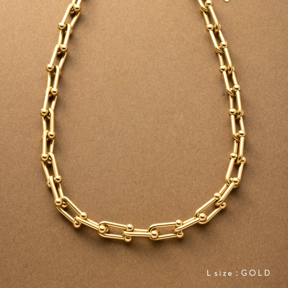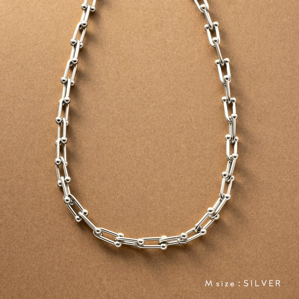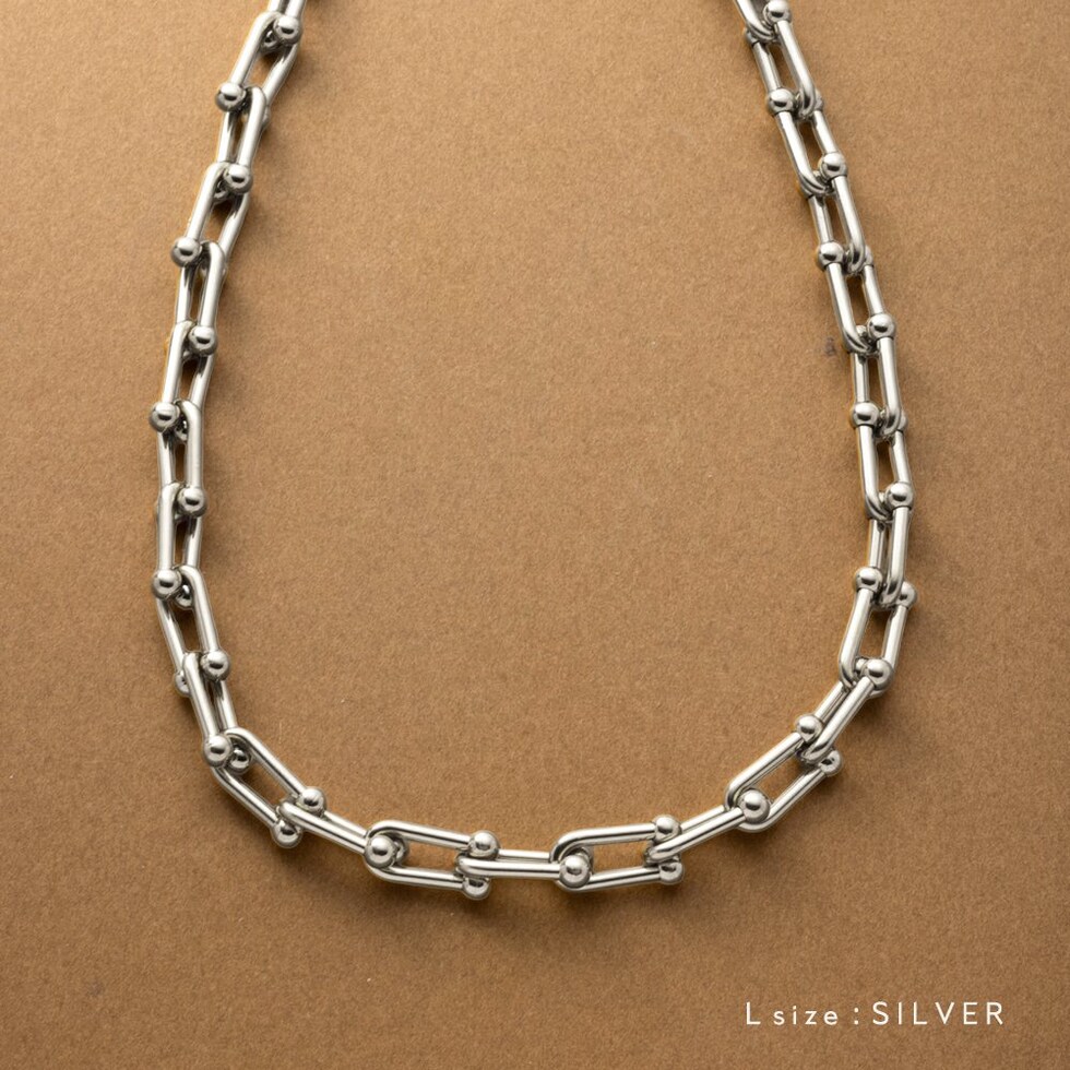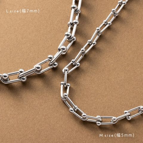 太さが選べるリンキングチェーンのステンレス製ネックレス。スフィアとオーバルをMIXしたハードすぎないルックスで大人の抜け感を演出します。錆びにくいステンレス製でデイリーに活躍しそう◎