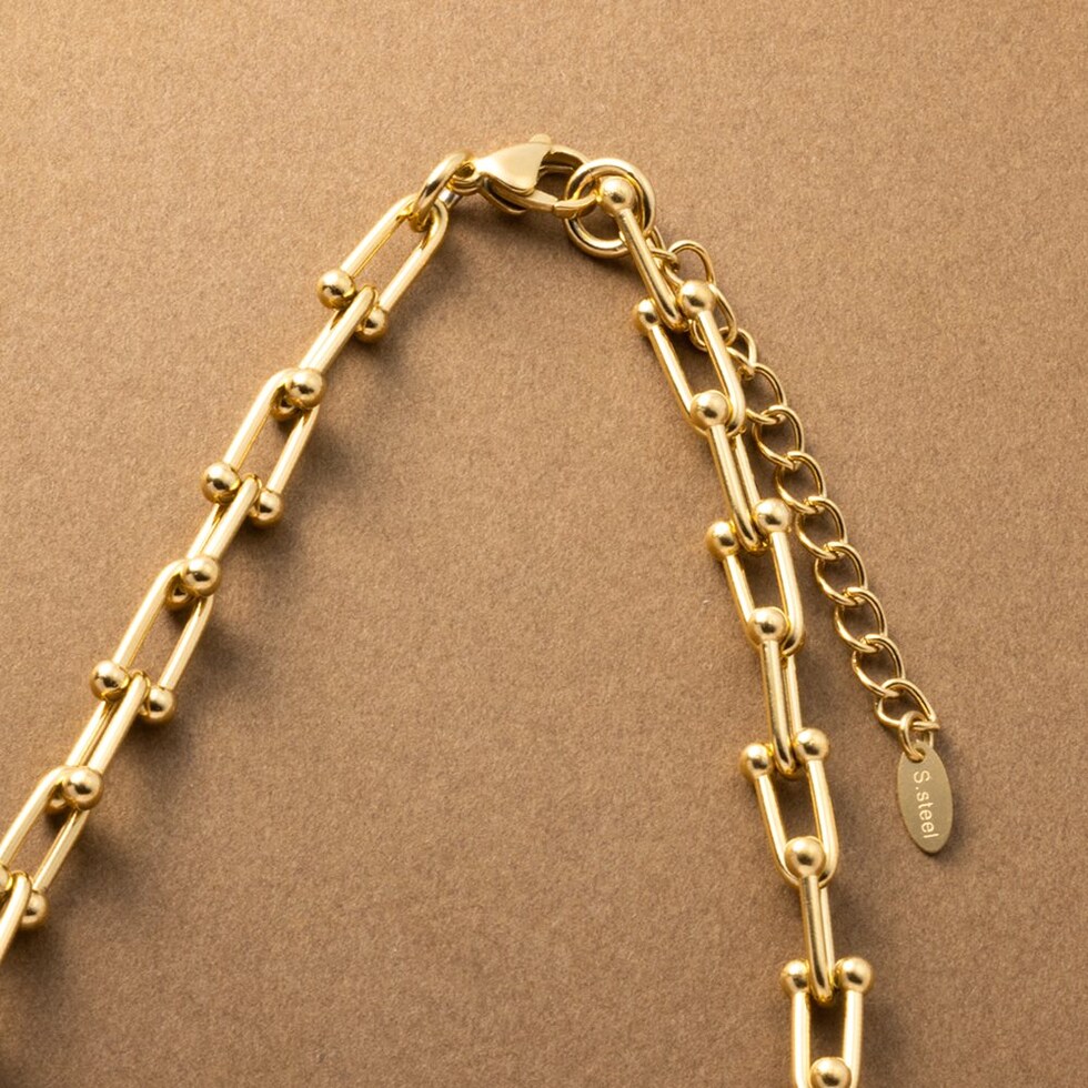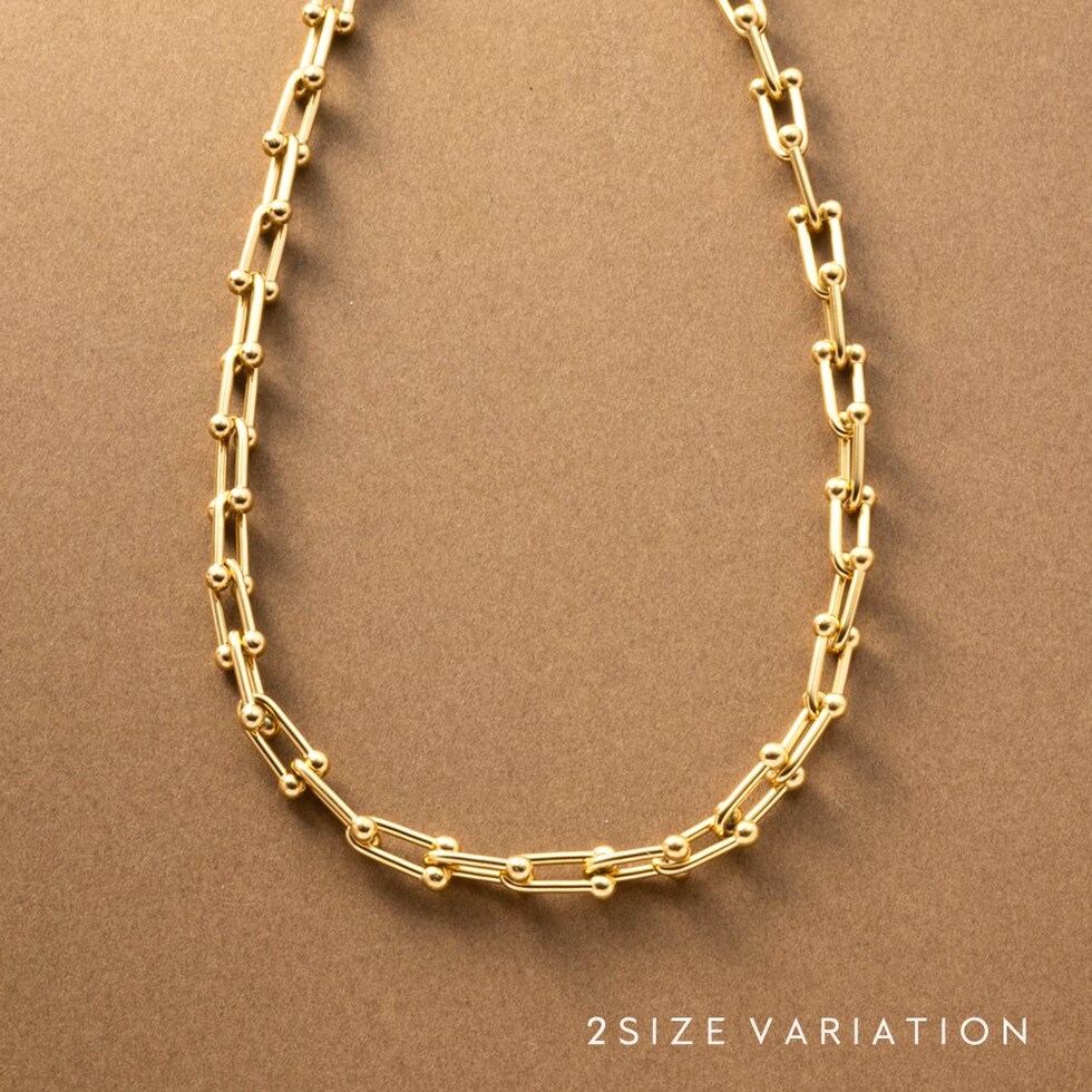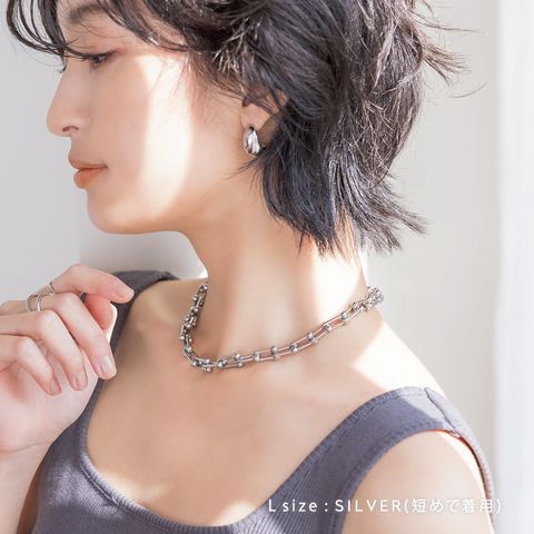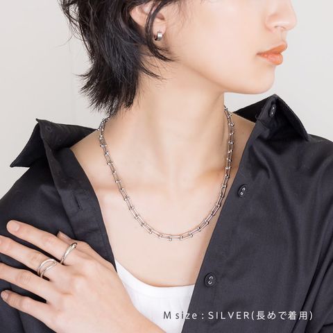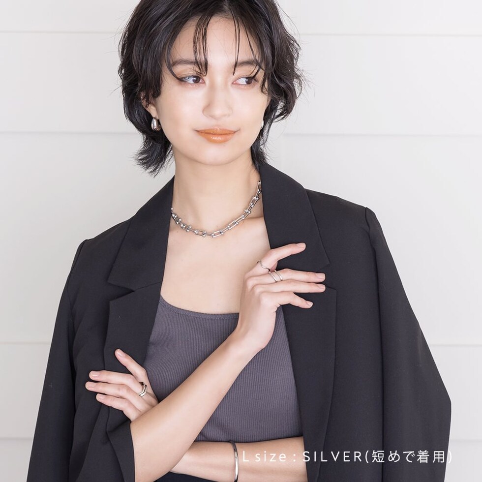 太さが選べるリンキングチェーンのステンレス製ネックレス。スフィアとオーバルをMIXしたハードすぎないルックスで大人の抜け感を演出します。錆びにくいステンレス製でデイリーに活躍しそう◎