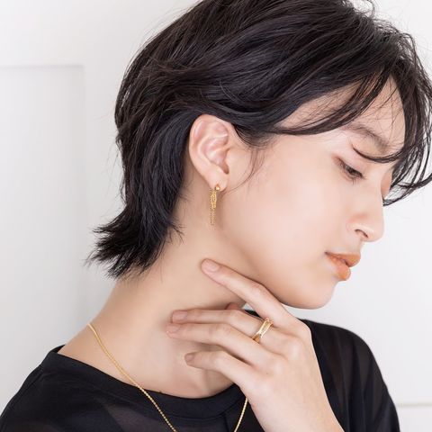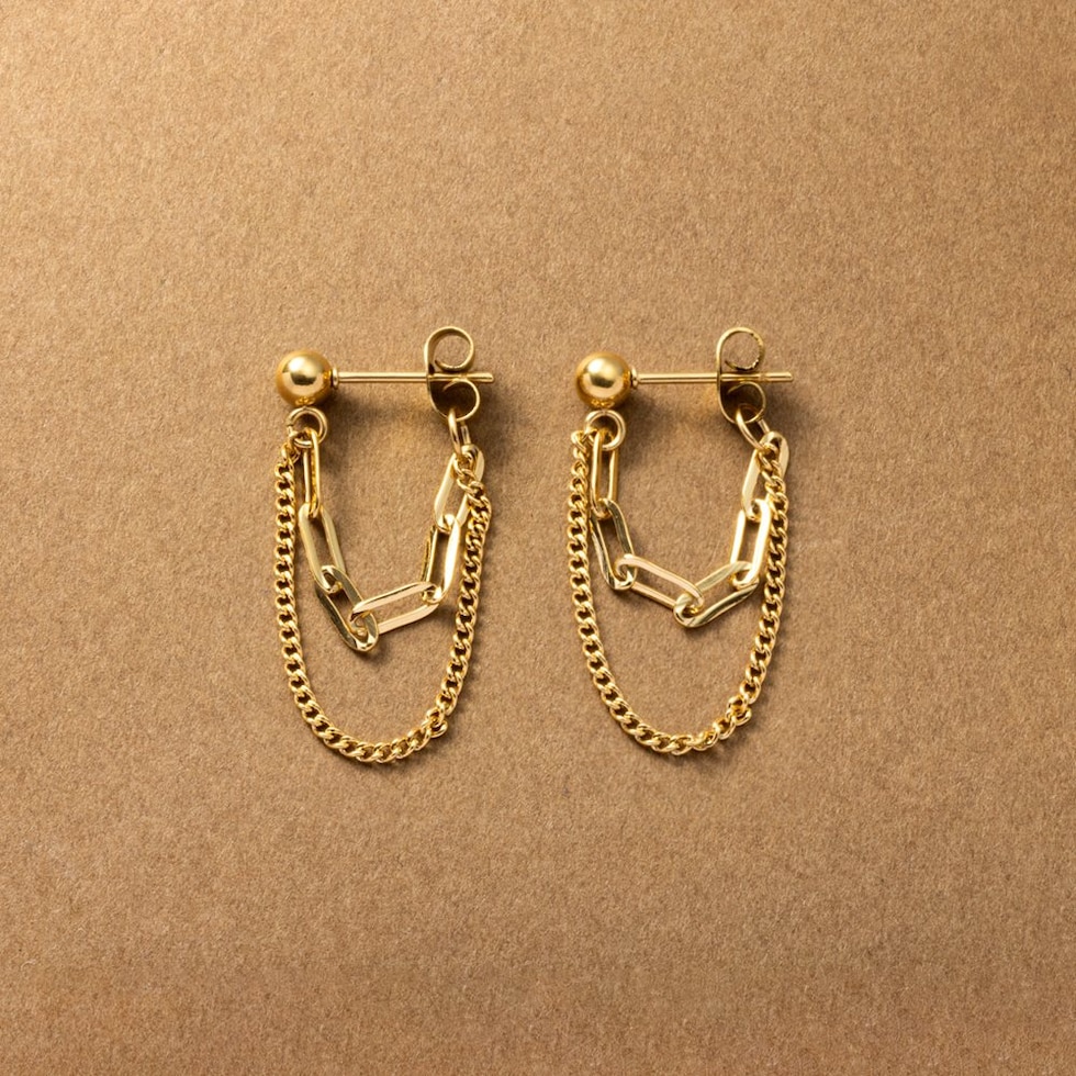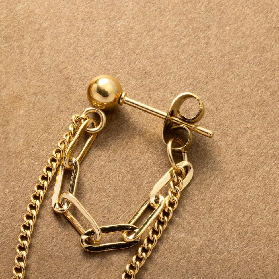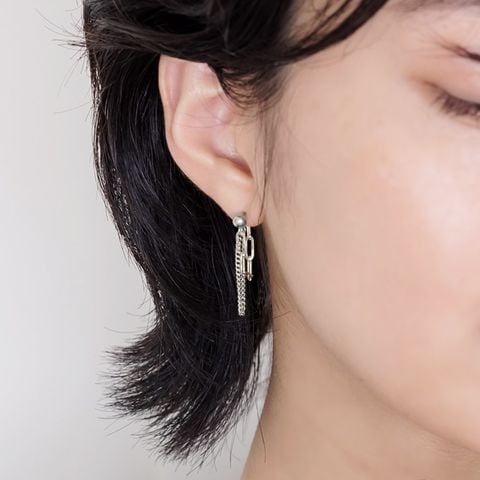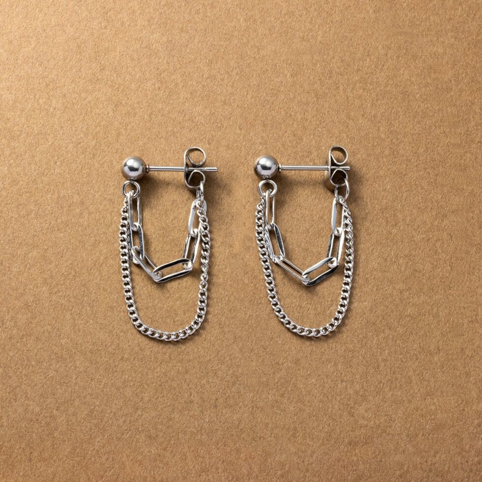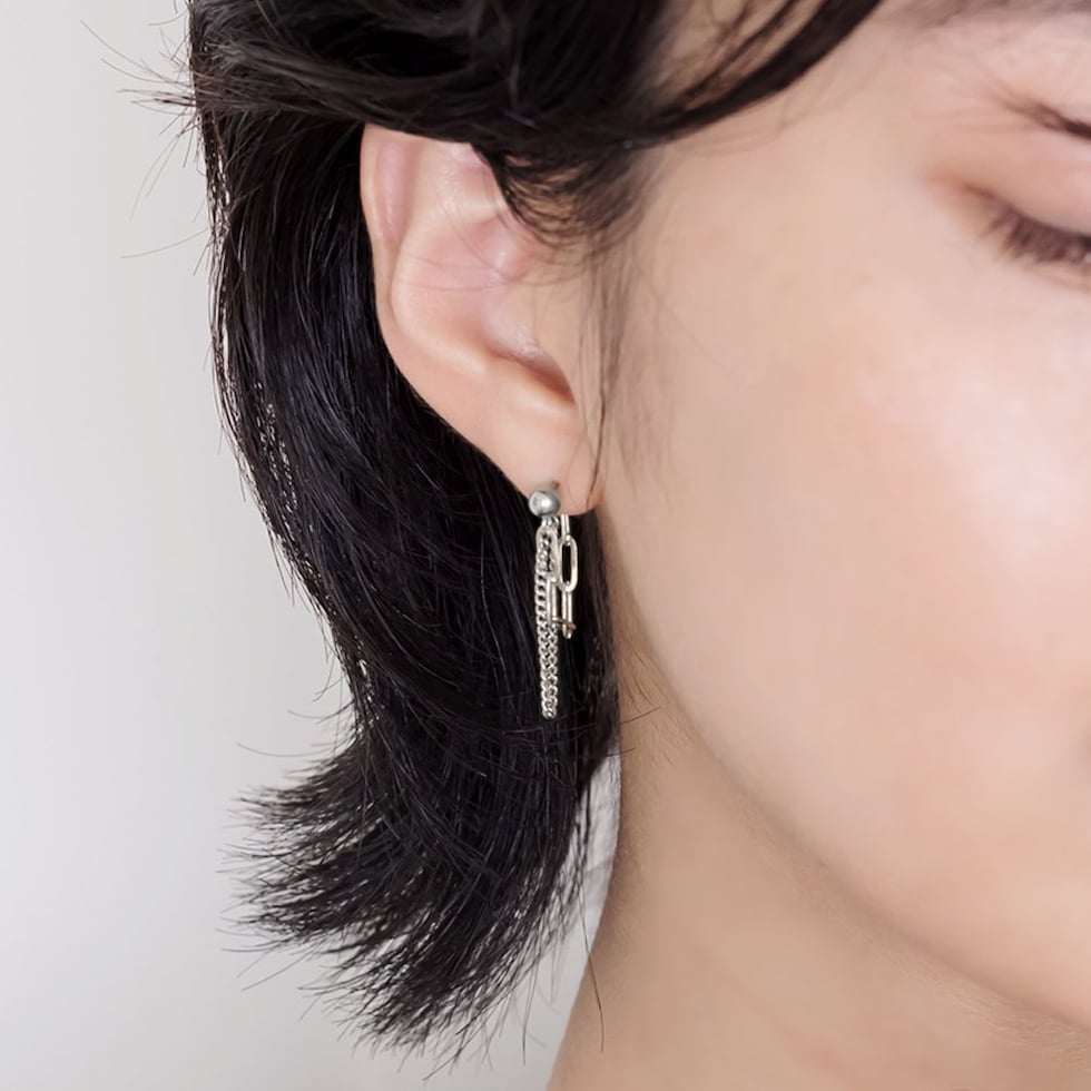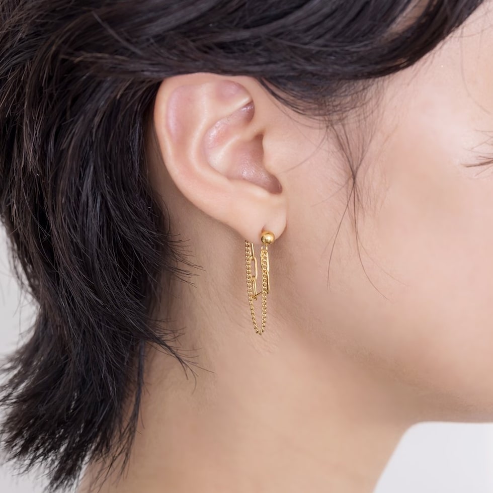 オーバル×華奢チェーンのバックキャッチピアス。2連のチェーンがさりげなく揺れる大人な雰囲気のデザイン。バックキャッチで横顔も抜け目のない仕上がりに◎程よいサイジングと錆びにくいステンレス製でデイリーに活躍するひと品です。