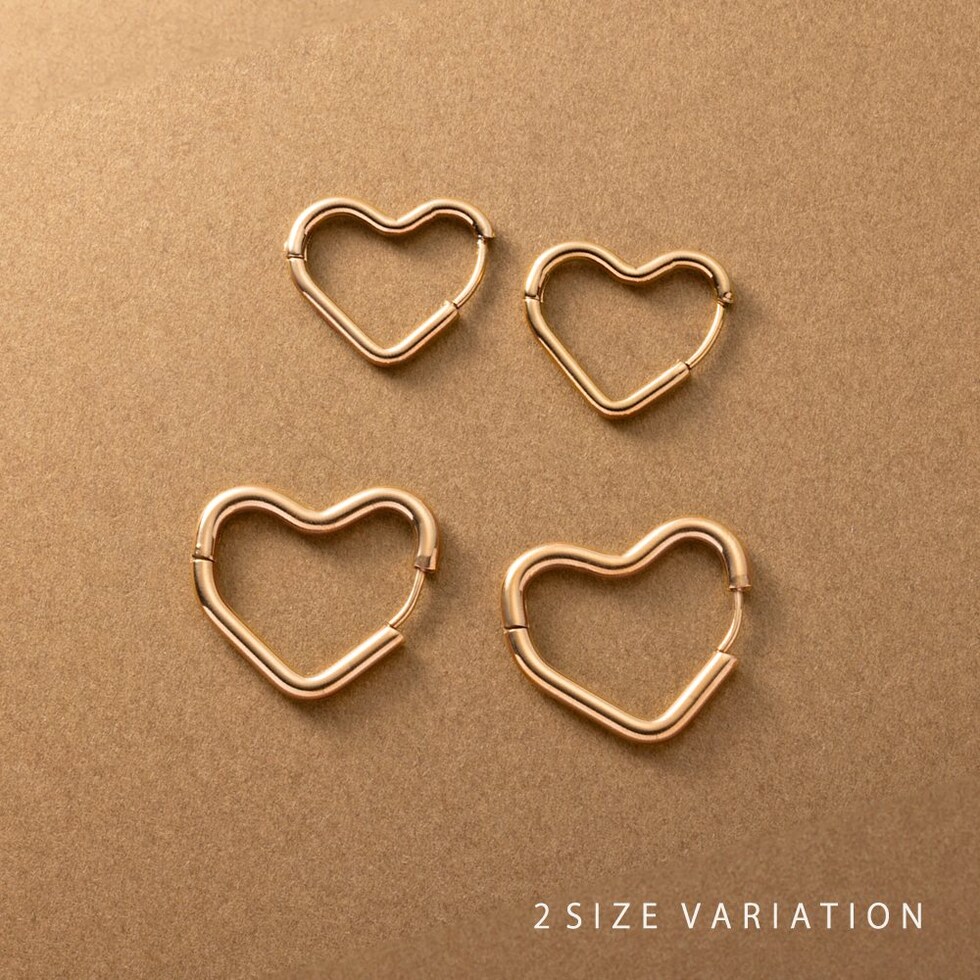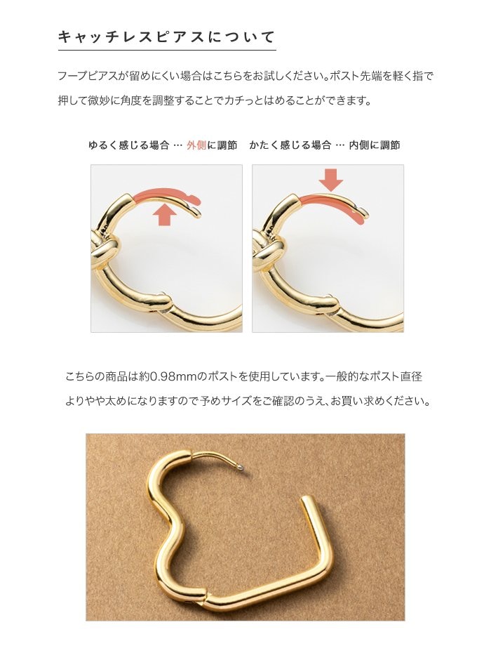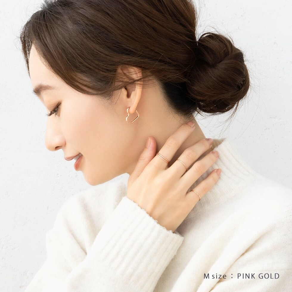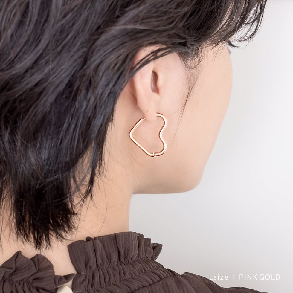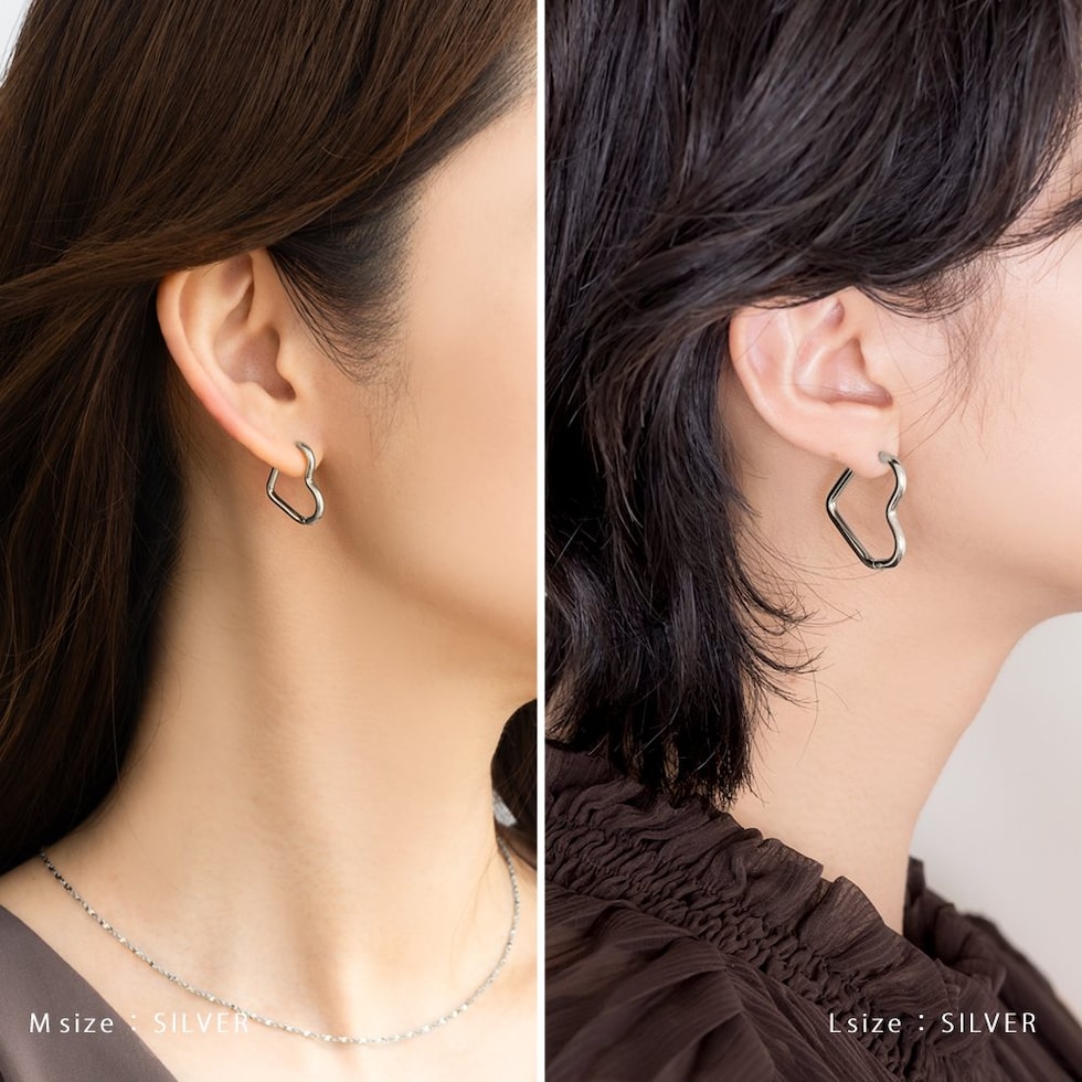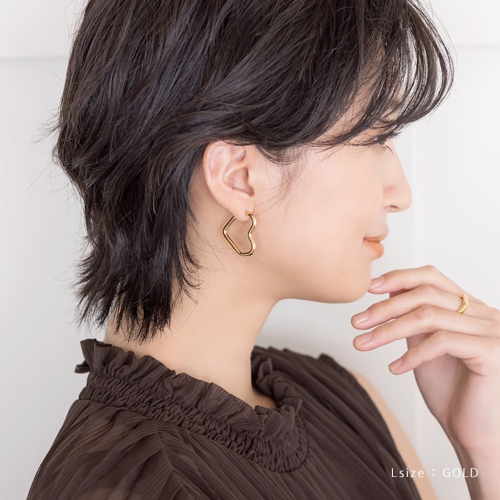 どの角度から見てもキレイに見えるハートのキャッチレスピアス。甘すぎない絶妙な可愛さをプラスします◎大人っぽく身につけられるMサイズと、アクセントにぴったりなLサイズ展開。錆びにくく傷に強いステンレス製でデイリーに活躍間違いナシのひと品です。