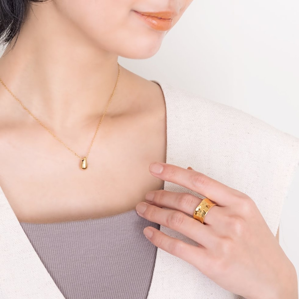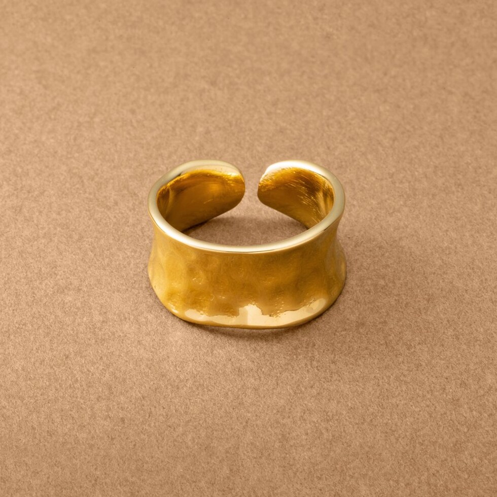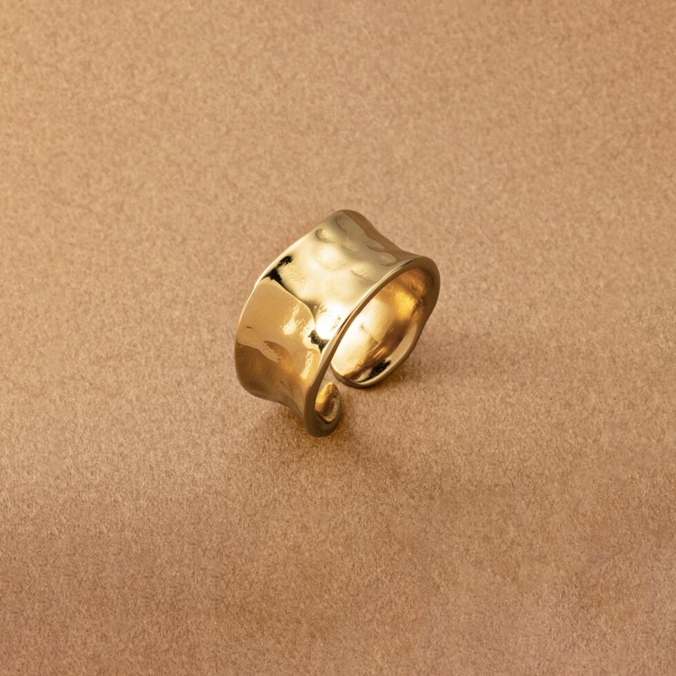 凹みたたき加工のメタルが存在感たっぷりなワイドリング。艶感ある上品なモチーフと重厚感あるデザインが指先をモードな雰囲気に仕上げます。大人コーデのアクセントにもオススメで錆びにくいステンレス製だからデイリーに活躍しそう◎