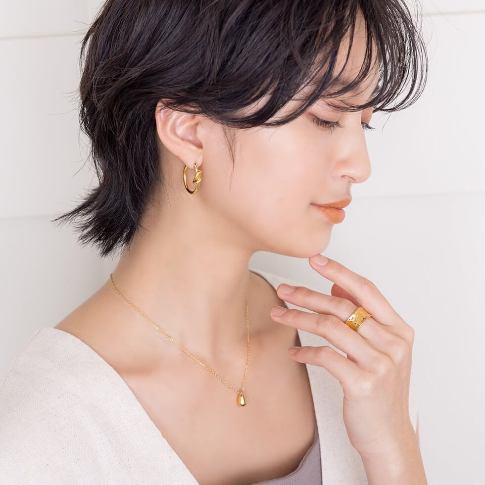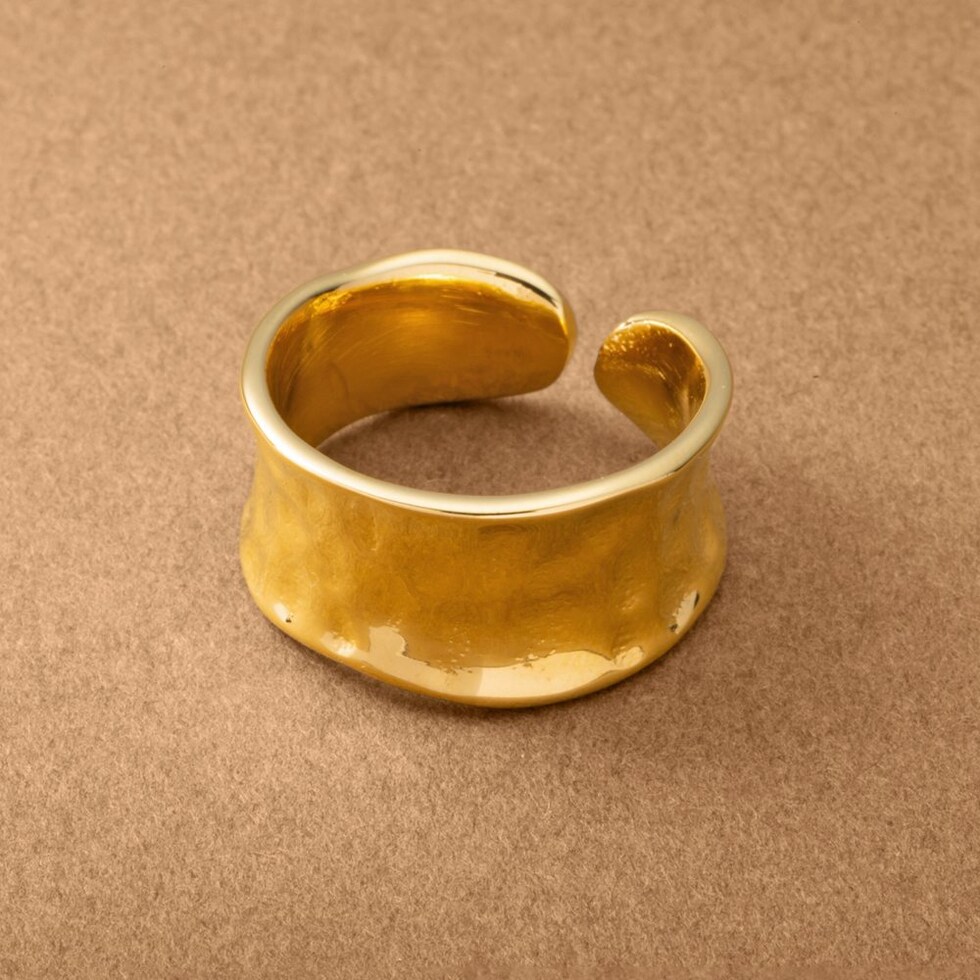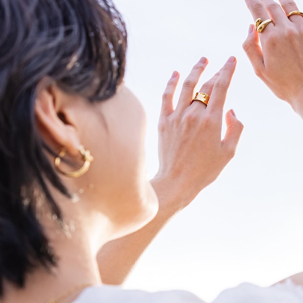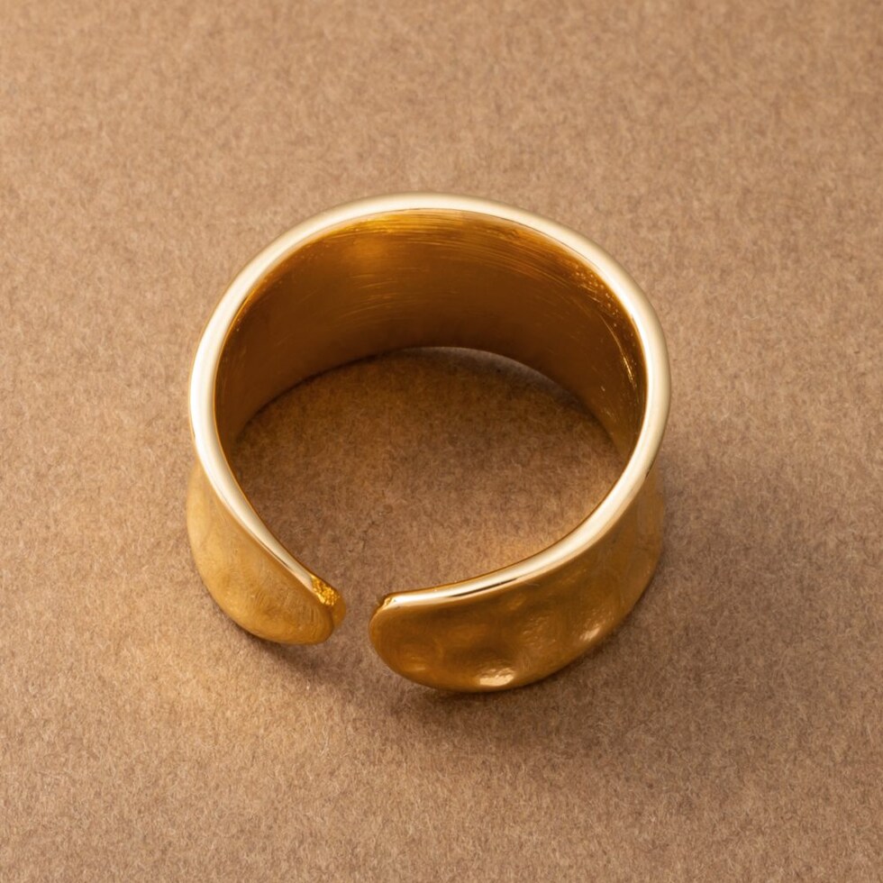 凹みたたき加工のメタルが存在感たっぷりなワイドリング。艶感ある上品なモチーフと重厚感あるデザインが指先をモードな雰囲気に仕上げます。大人コーデのアクセントにもオススメで錆びにくいステンレス製だからデイリーに活躍しそう◎