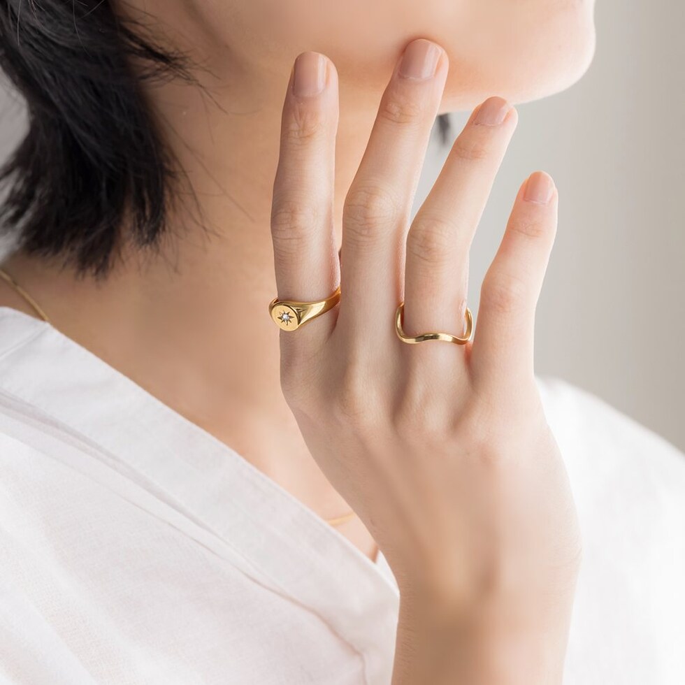 フラットトップに一粒のビジューが煌くリング。ボリュームがありつつ、どこか繊細な雰囲気で大人の手元コーデの主役にぴったり。錆びにくいステンレス製でデイリーに活躍しそう。