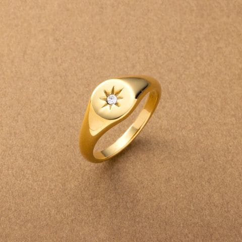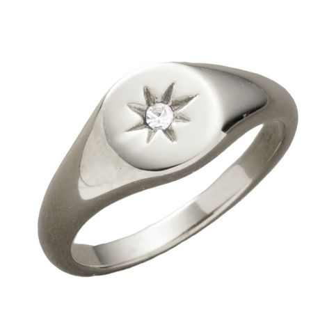 フラットトップに一粒のビジューが煌くリング。ボリュームがありつつ、どこか繊細な雰囲気で大人の手元コーデの主役にぴったり。錆びにくいステンレス製でデイリーに活躍しそう。