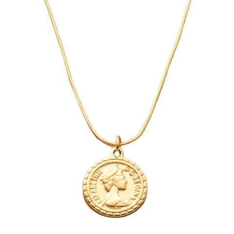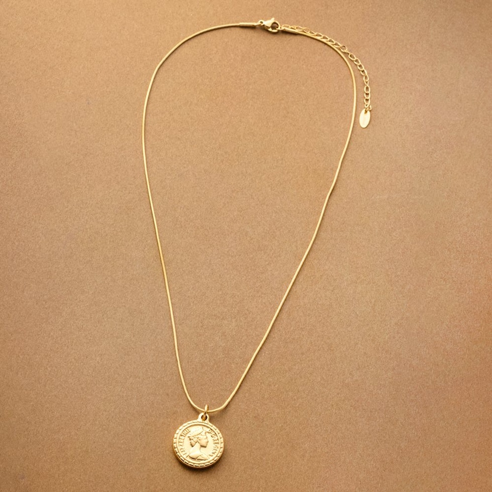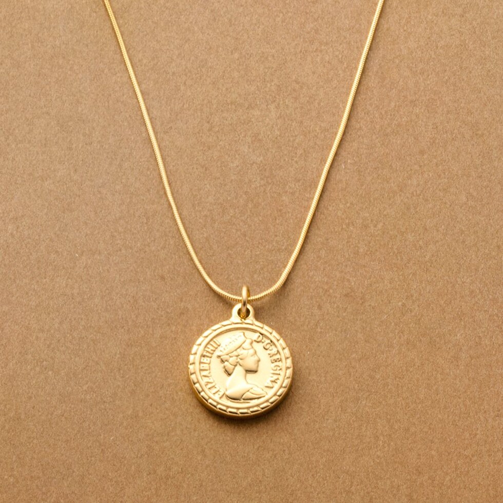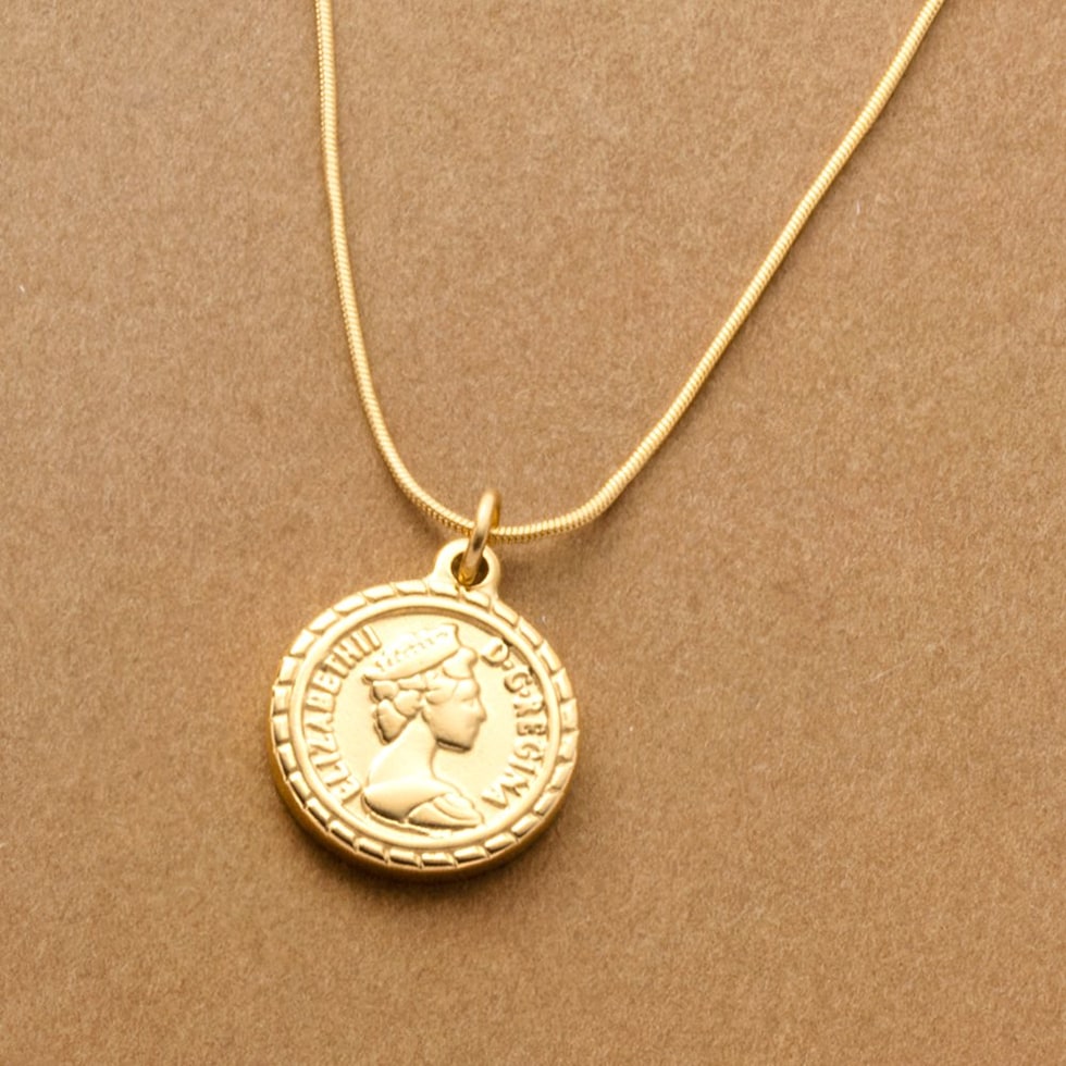 エリザベス2世の絵柄がモチーフになったネックレス。裏面は違うデザインでリバーシブルとして着用可能です。ヴィンテージ風モチーフとスネークチェーンとの組み合わせが大人コーデのアクセントに◎錆びにくく傷に強いステンレス製でデイリーに活躍間違いナシのアイテムです。