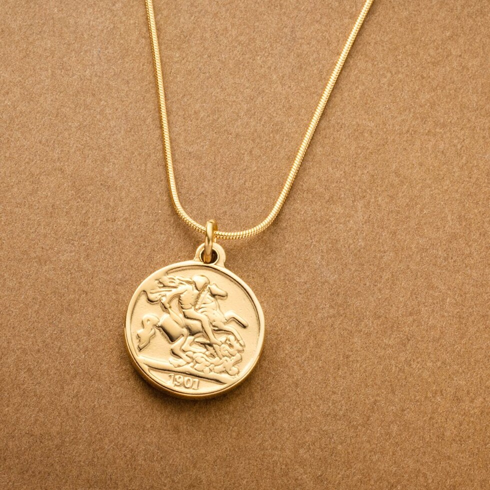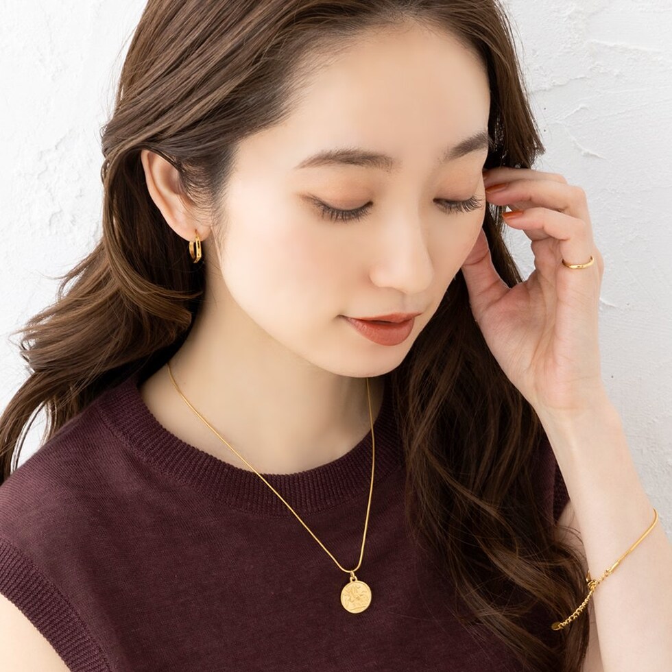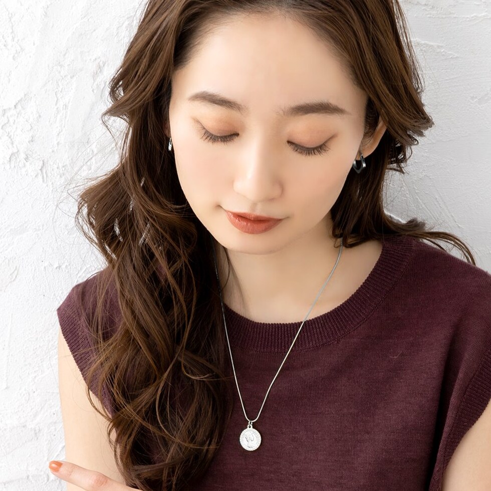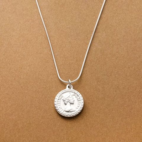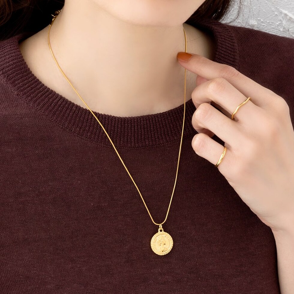 エリザベス2世の絵柄がモチーフになったネックレス。裏面は違うデザインでリバーシブルとして着用可能です。ヴィンテージ風モチーフとスネークチェーンとの組み合わせが大人コーデのアクセントに◎錆びにくく傷に強いステンレス製でデイリーに活躍間違いナシのアイテムです。