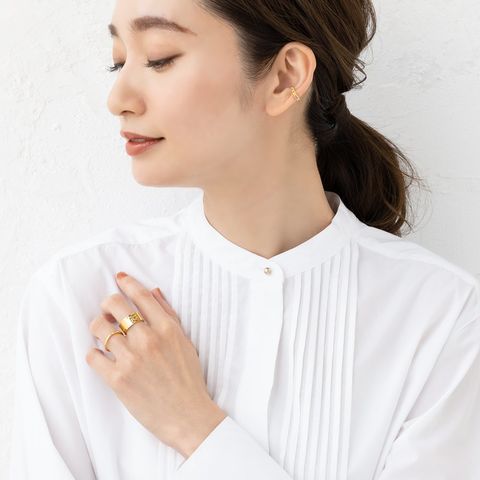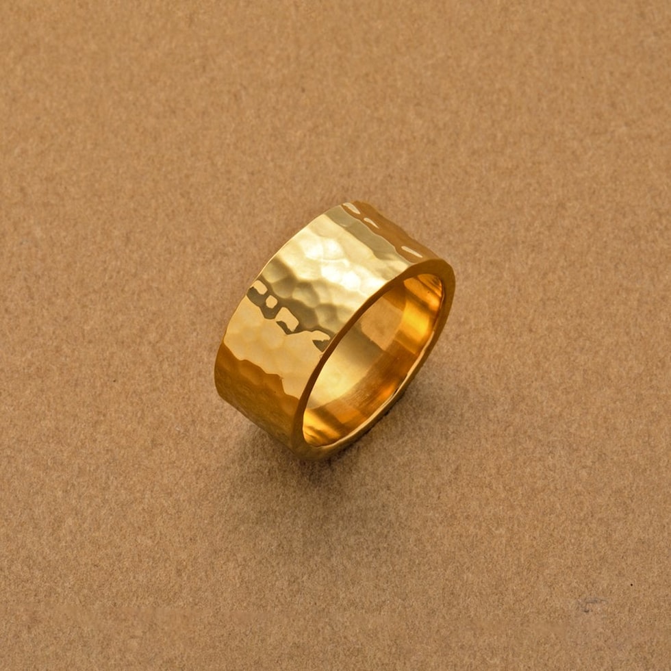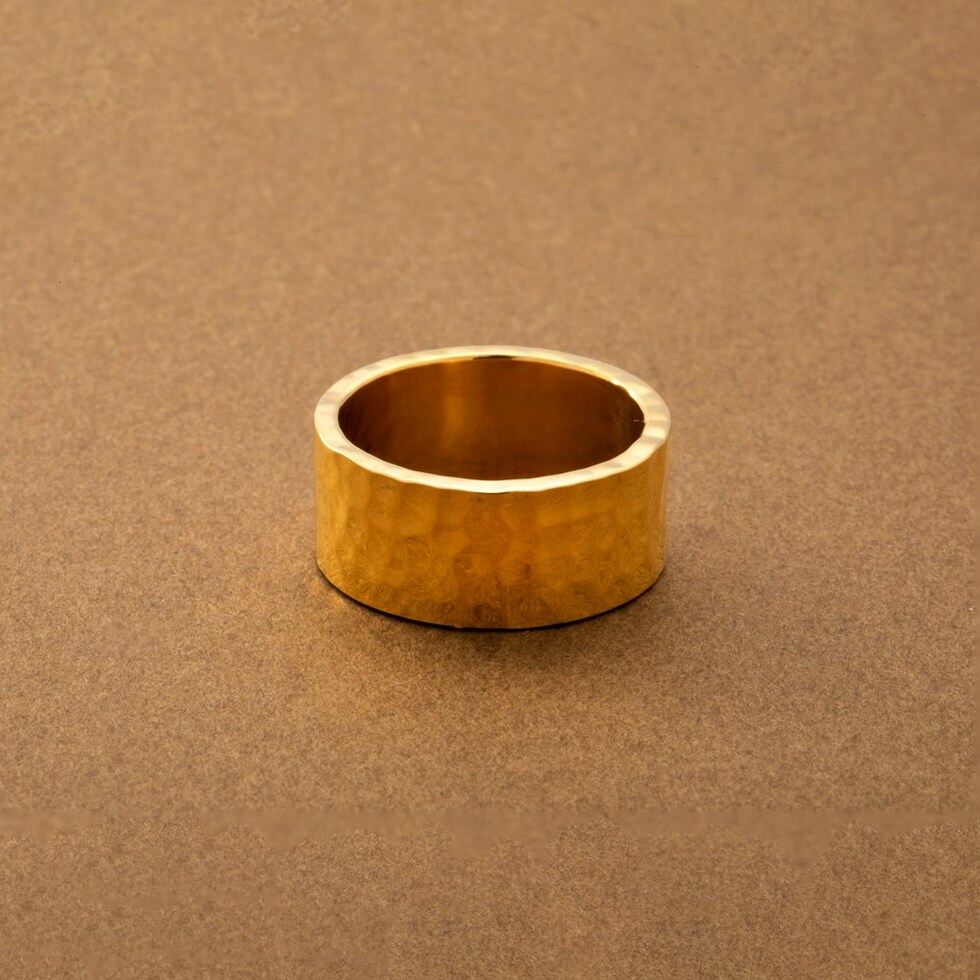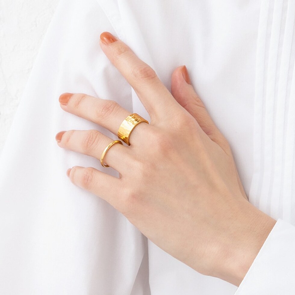 たたき加工のメタルが存在感たっぷりなワイドフォルムリング。重厚感のあるデザインが指先をモードな雰囲気に仕上げます。錆びにくいステンレス製でデイリーに活躍するひと品。