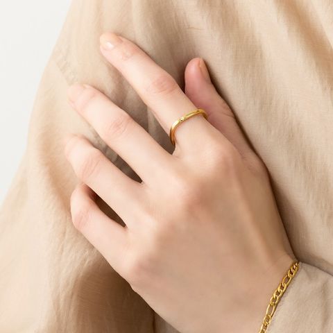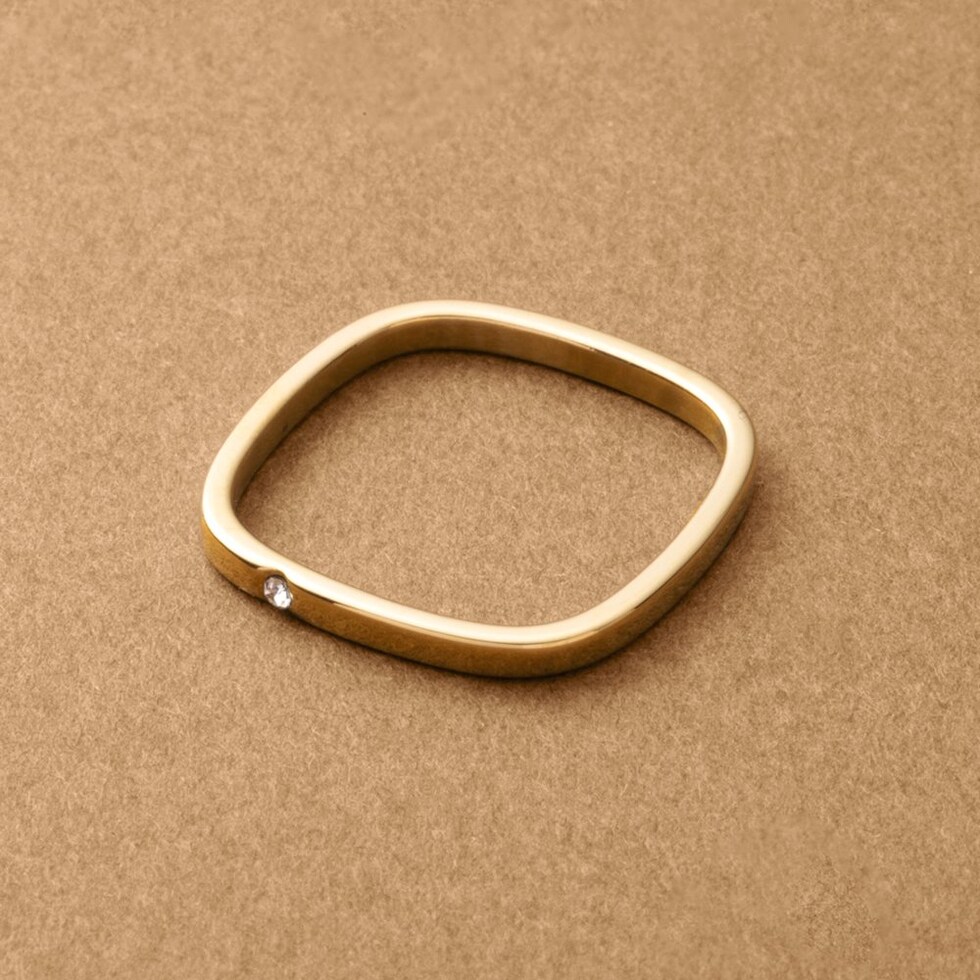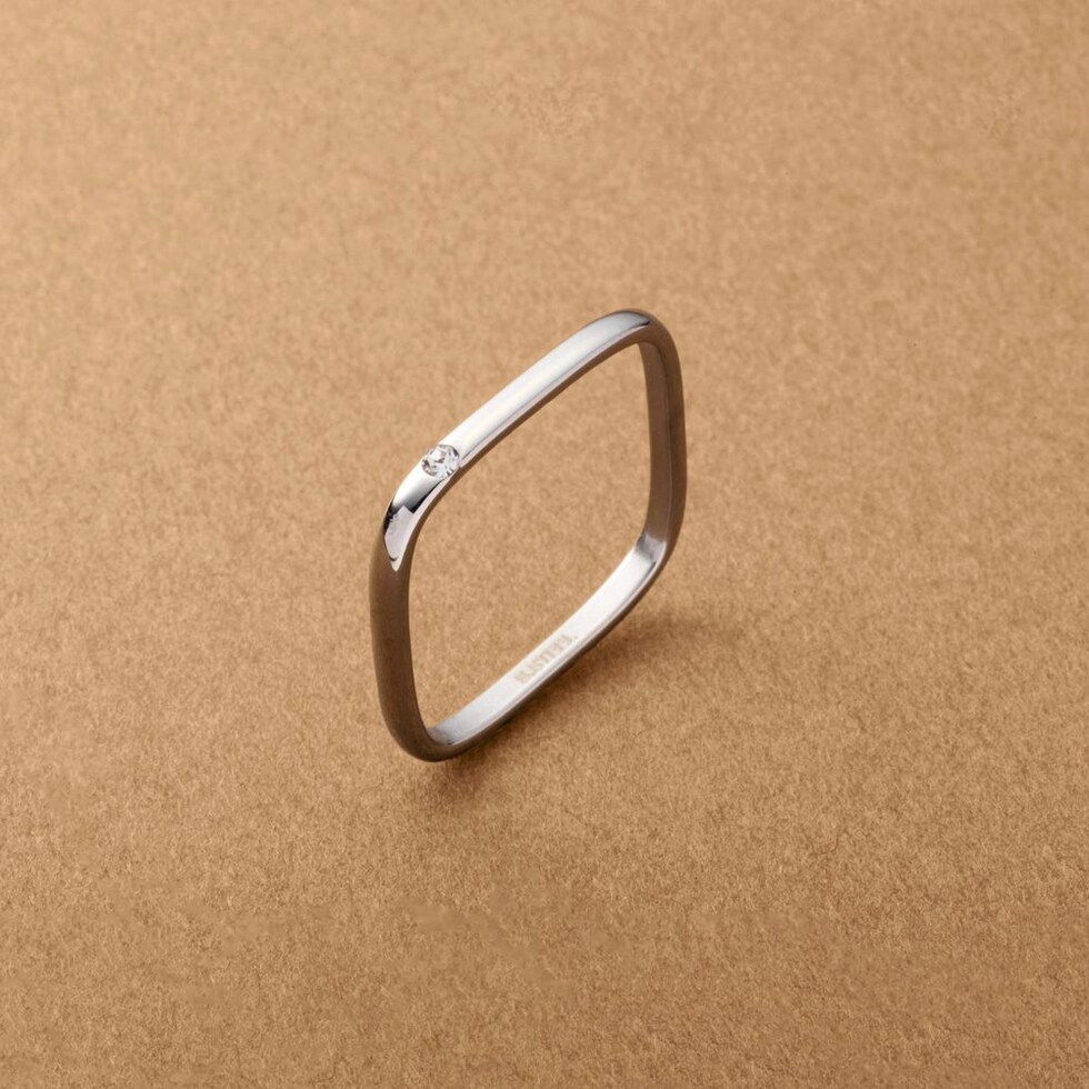 角丸のスクエアラインに一粒ビジューが煌めくリング。ミニマルだからお手持ちのリングとの重ねづけもオススメです◎錆びにくいステンレス製&さりげなく個性の光るデザインで大人の手元コーデに活躍しそう。