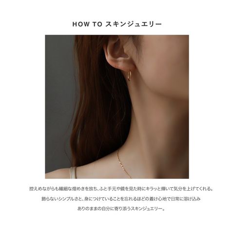 着けていることを忘れるくらい素肌に馴染む軽やかさ。お風呂や寝る時にもつけっぱなしOK!ボディとキャッチが一体になっているため、引っ掛かりの心配もありません。