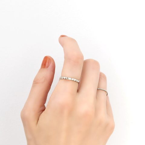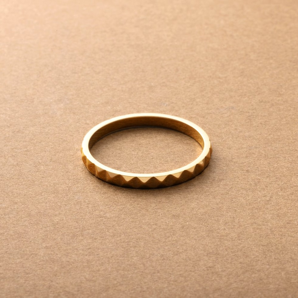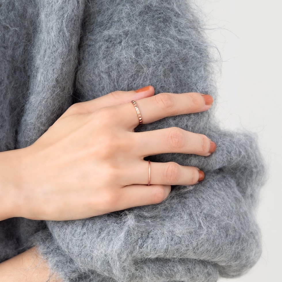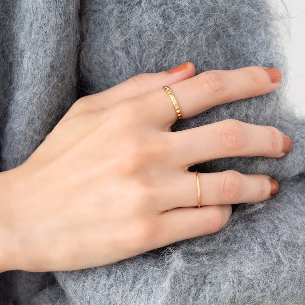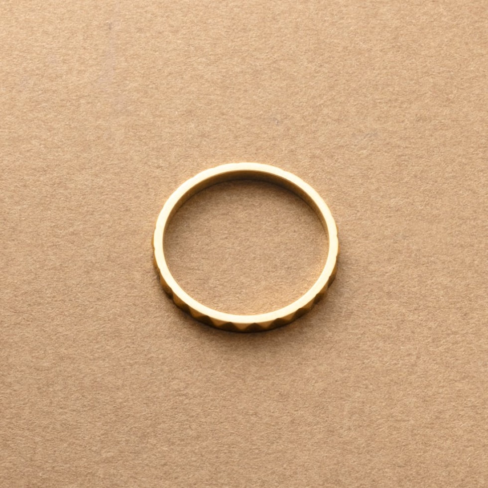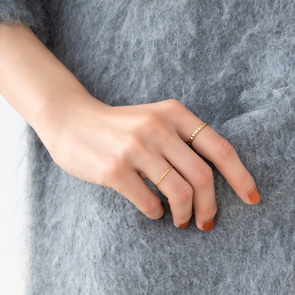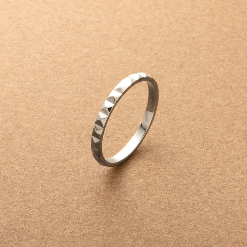 スタッズを一周に施したエッジをきかせながらも上品なリング。カットされた面がどこから見ても品よく煌めき、洗練された大人の指先を演出。程よいボリューム感と錆びにくいステンレス製でデイリーに活躍しそう。