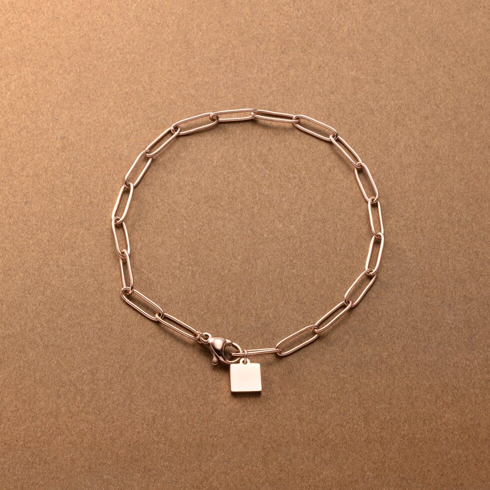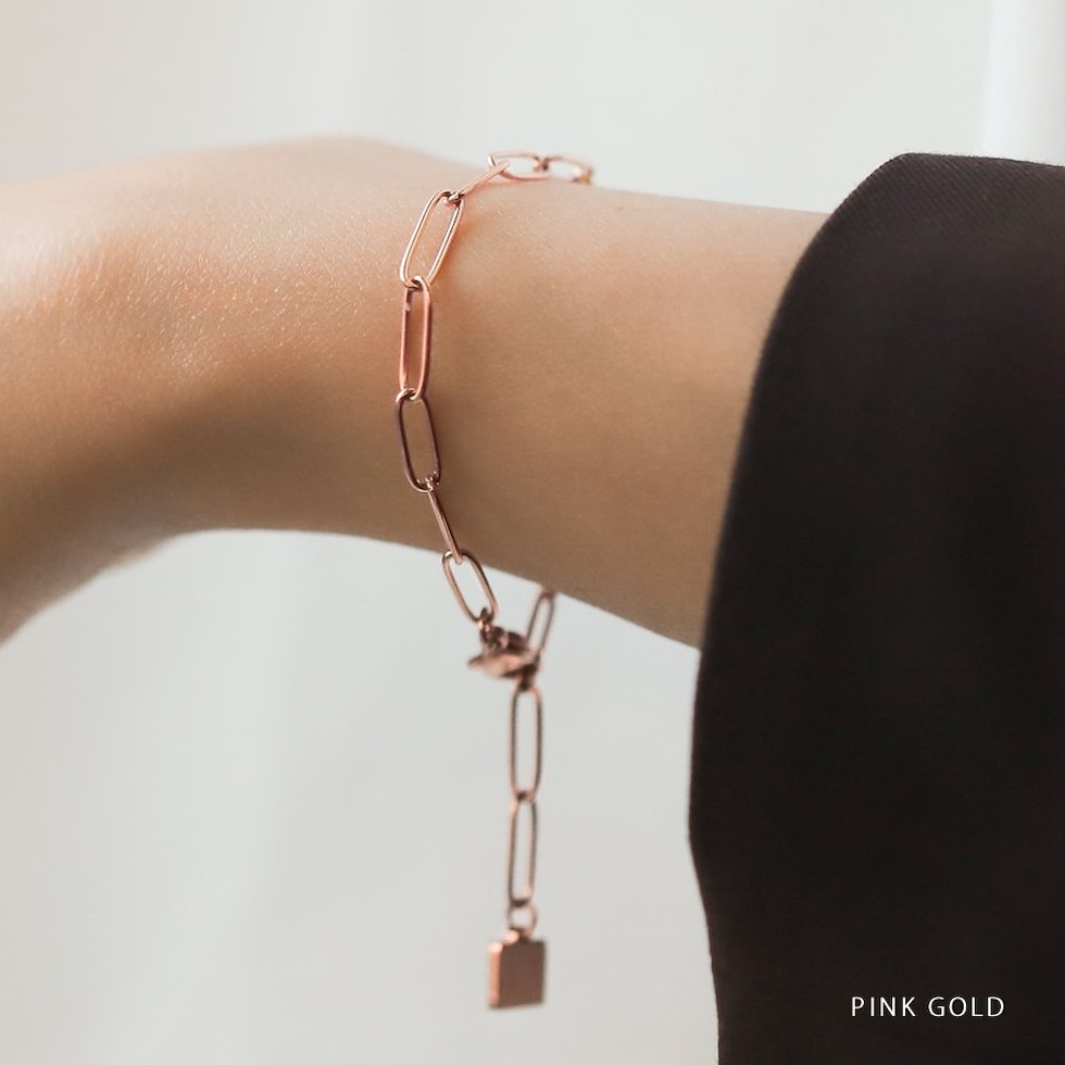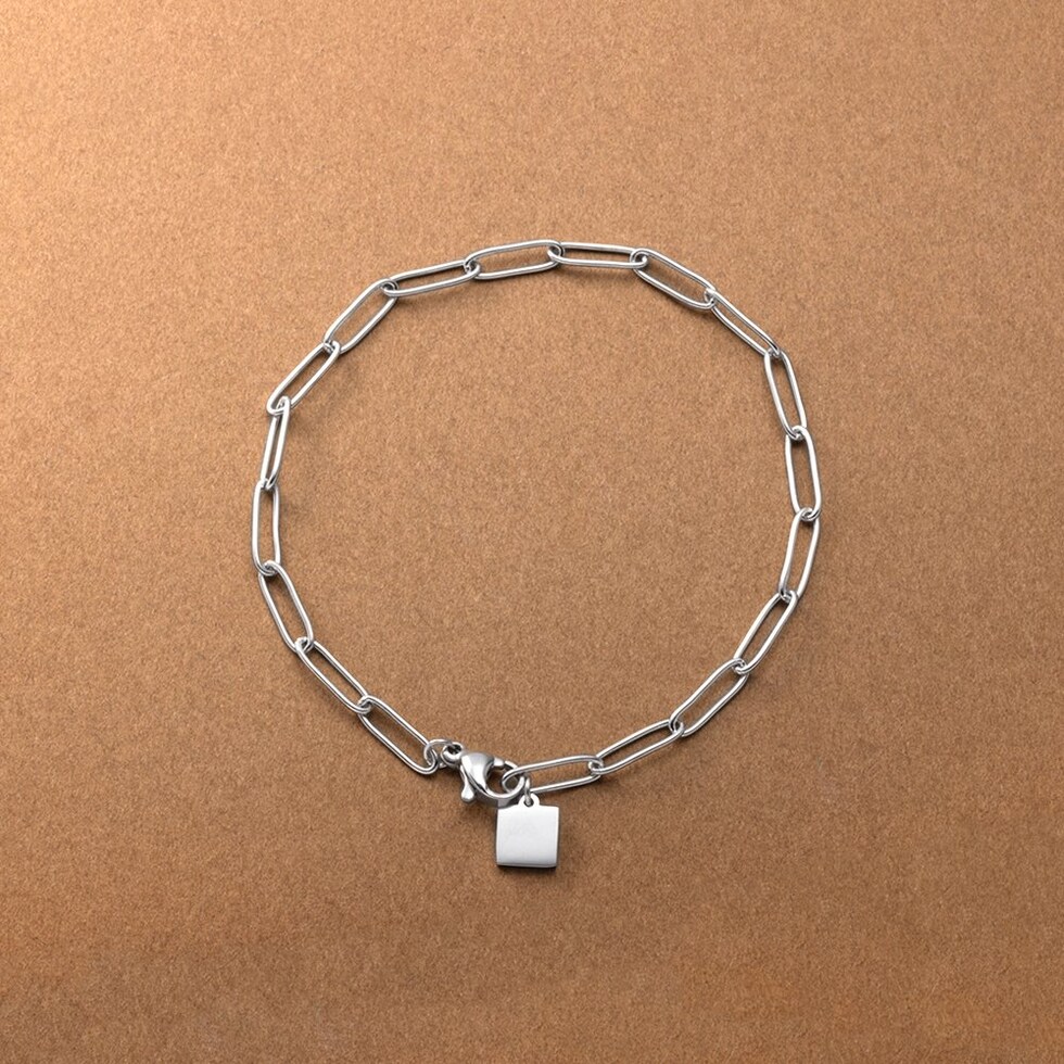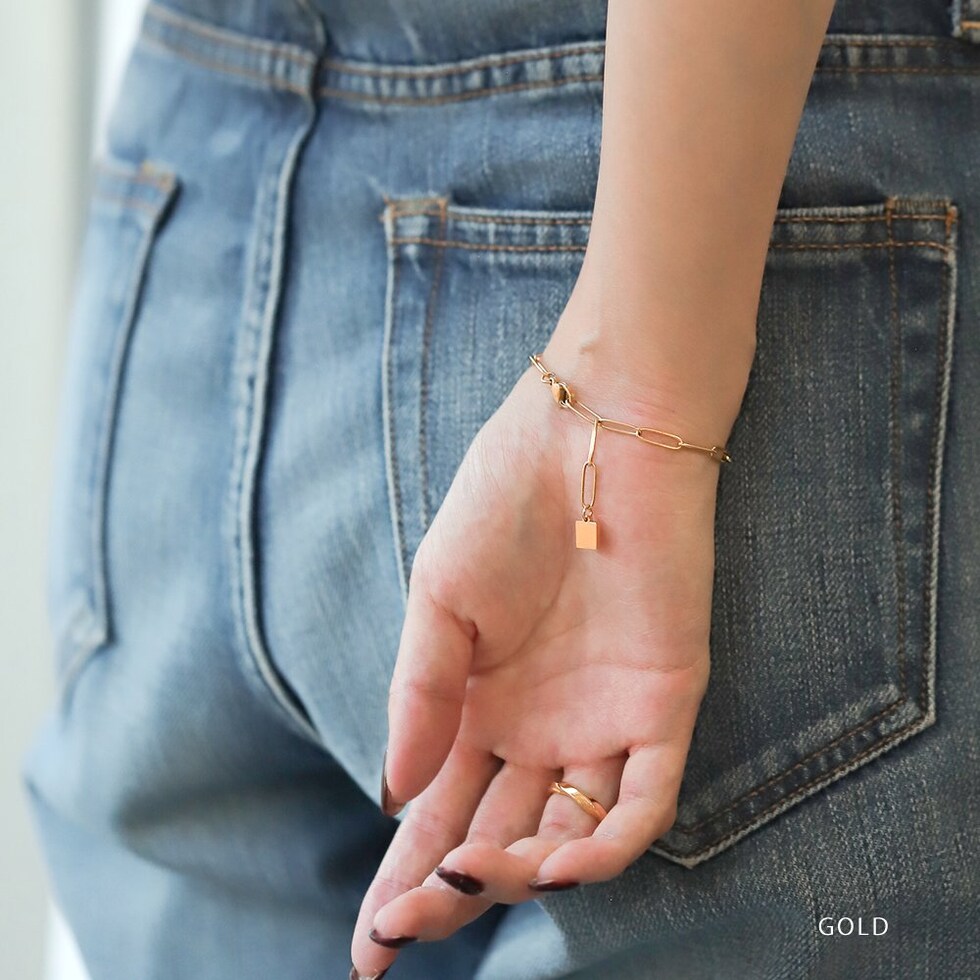 トレンドのオーバルチェーンにスクエアメタルプレートを合わせたブレスレット。シンプルなプレートが手元で揺らめいて、さりげないアクセントに◎錆びにくく傷に強いステンレス製で、デイリーに活躍してくれるアイテムです。