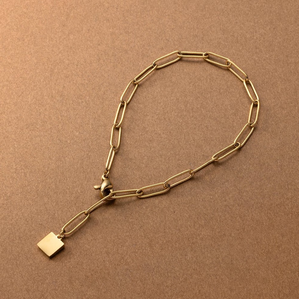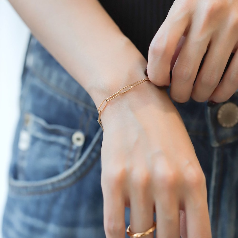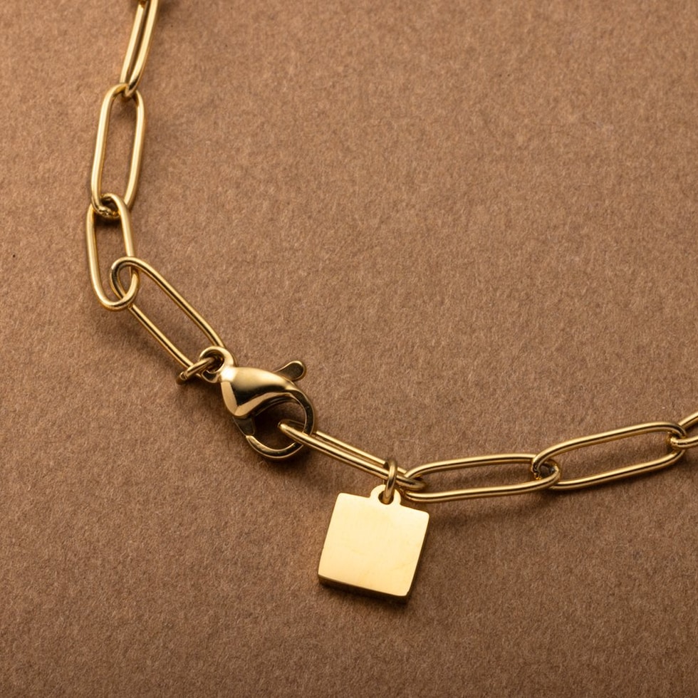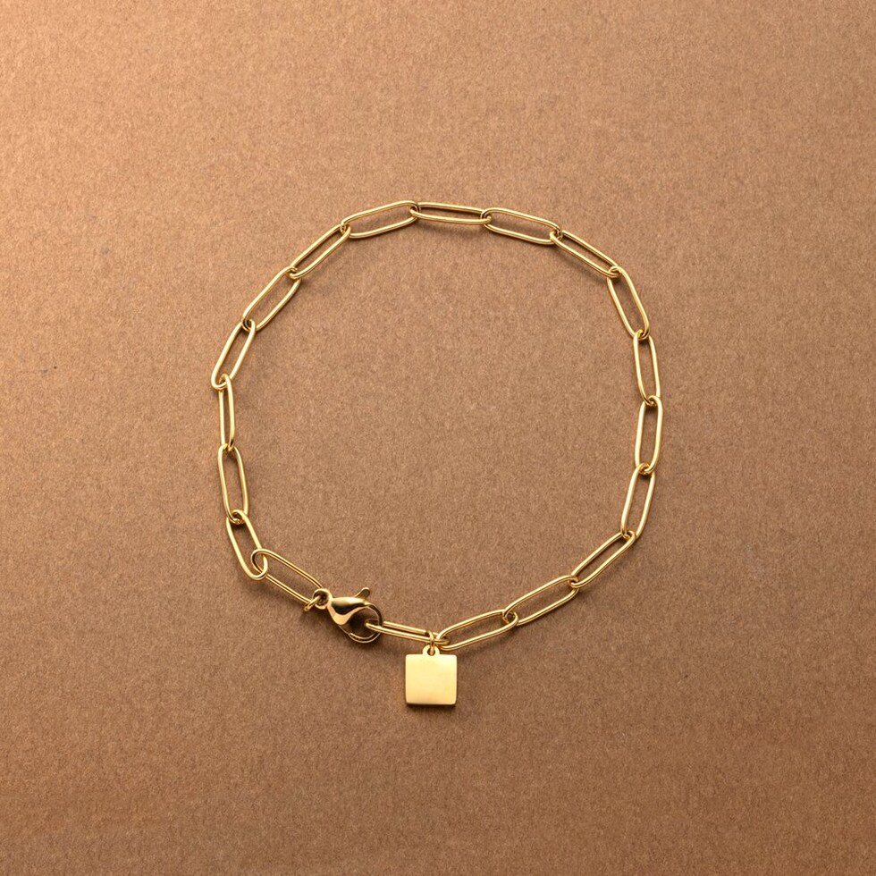 トレンドのオーバルチェーンにスクエアメタルプレートを合わせたブレスレット。シンプルなプレートが手元で揺らめいて、さりげないアクセントに◎錆びにくく傷に強いステンレス製で、デイリーに活躍してくれるアイテムです。