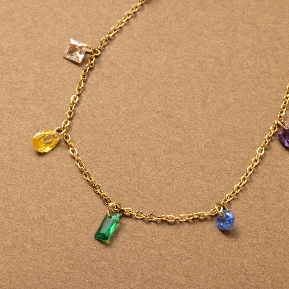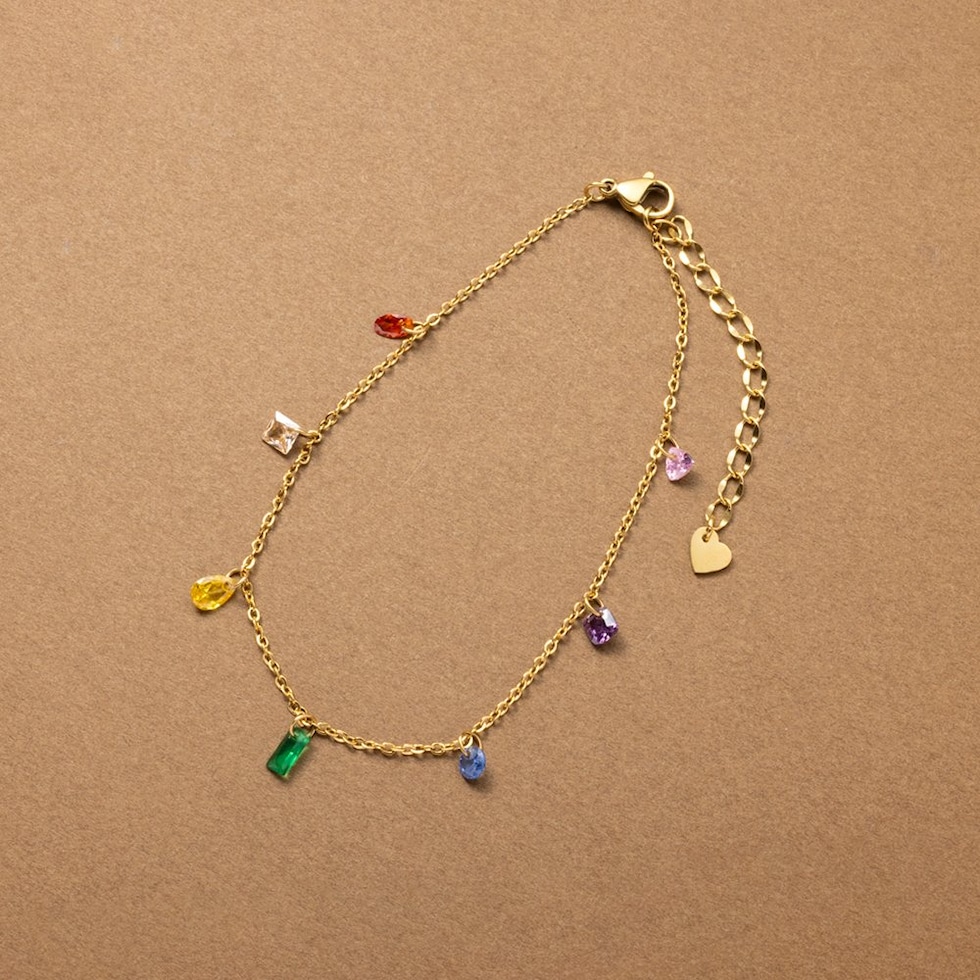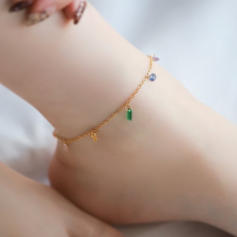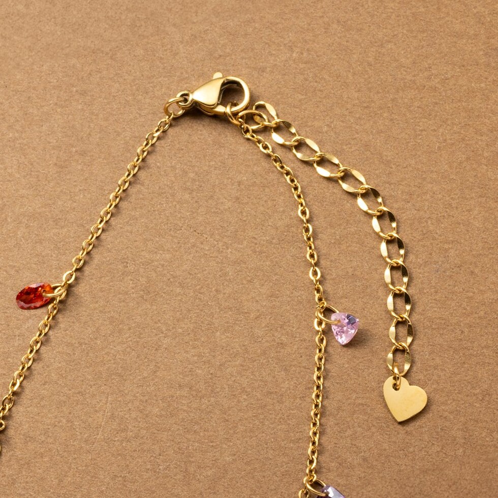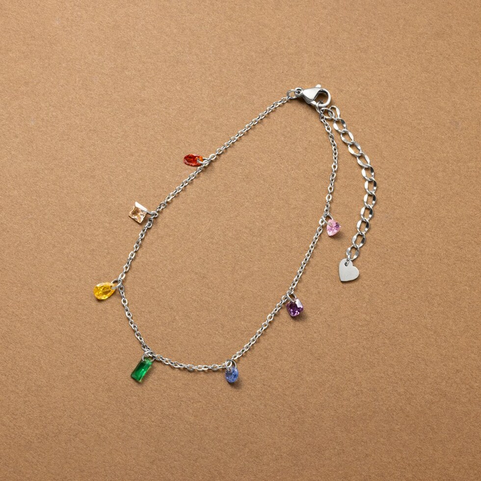 マルチカラーのビジューが足元を彩るアンクレット。ひとつひとつデザインの異なるビジューと、アジャスターエンドのハートモチーフが気分を上げてくれるひと品◎錆びにくいステンレス製でデイリーに活躍するアイテムです。