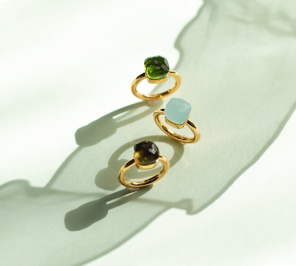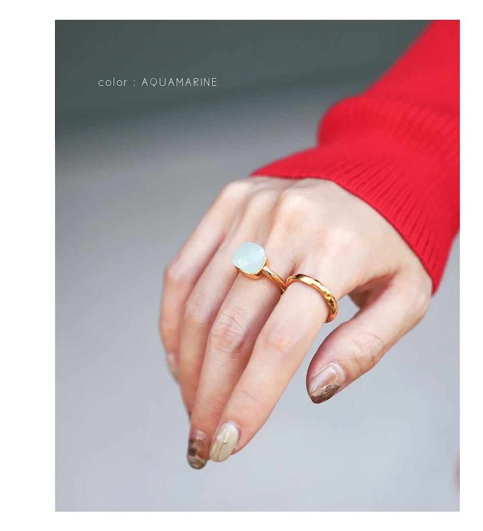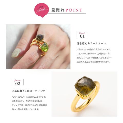 フラットカットを施したカラーストーンは、ニュアンスのあるカラーで女性らしい雰囲気に。ゴールドの台座と丸みのあるアームが大人上品な手元に魅せてくれます。