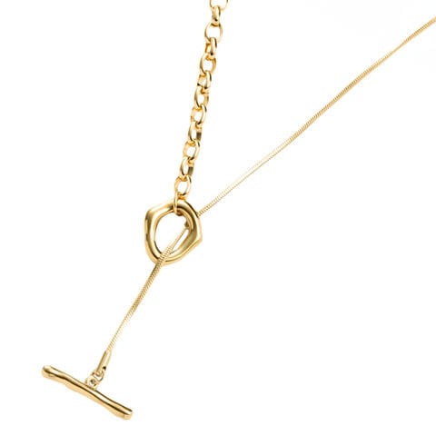 しなやかなスネークチェーンと存在感のあるサークルチェーンを組み合わせたY字ロングネックレス。クラフト感のあるエンドパーツとマンテルが大人モダンな印象に仕上げてくれます。2連にしてもお使いいただけるので、スタイリングに合わせて楽しめます。錆びにくいステンレス製だからデイリー使いにぴったりの一品です。