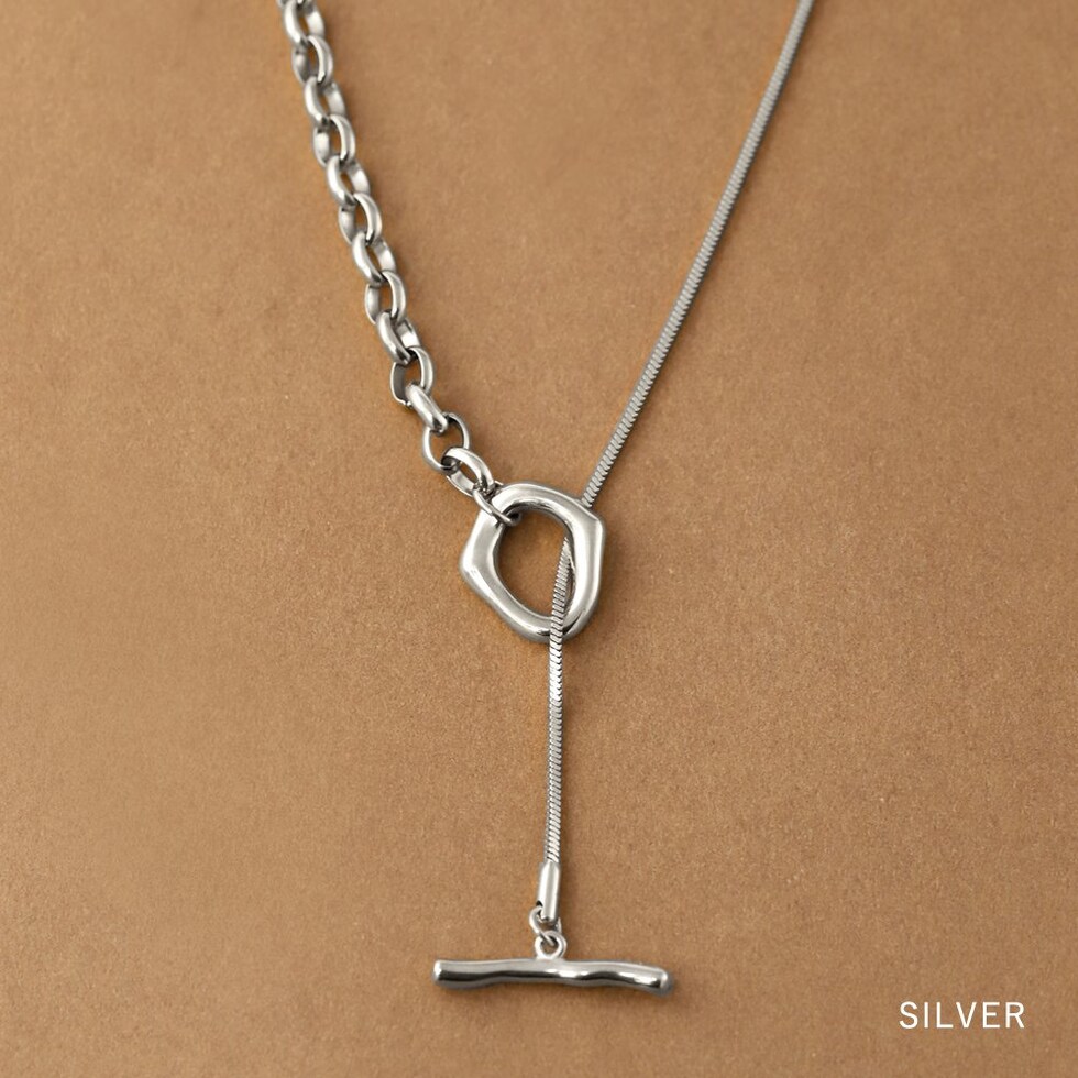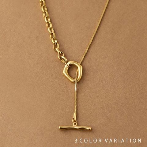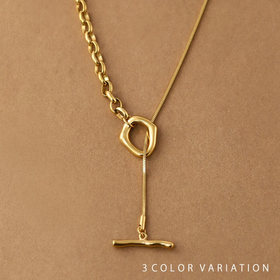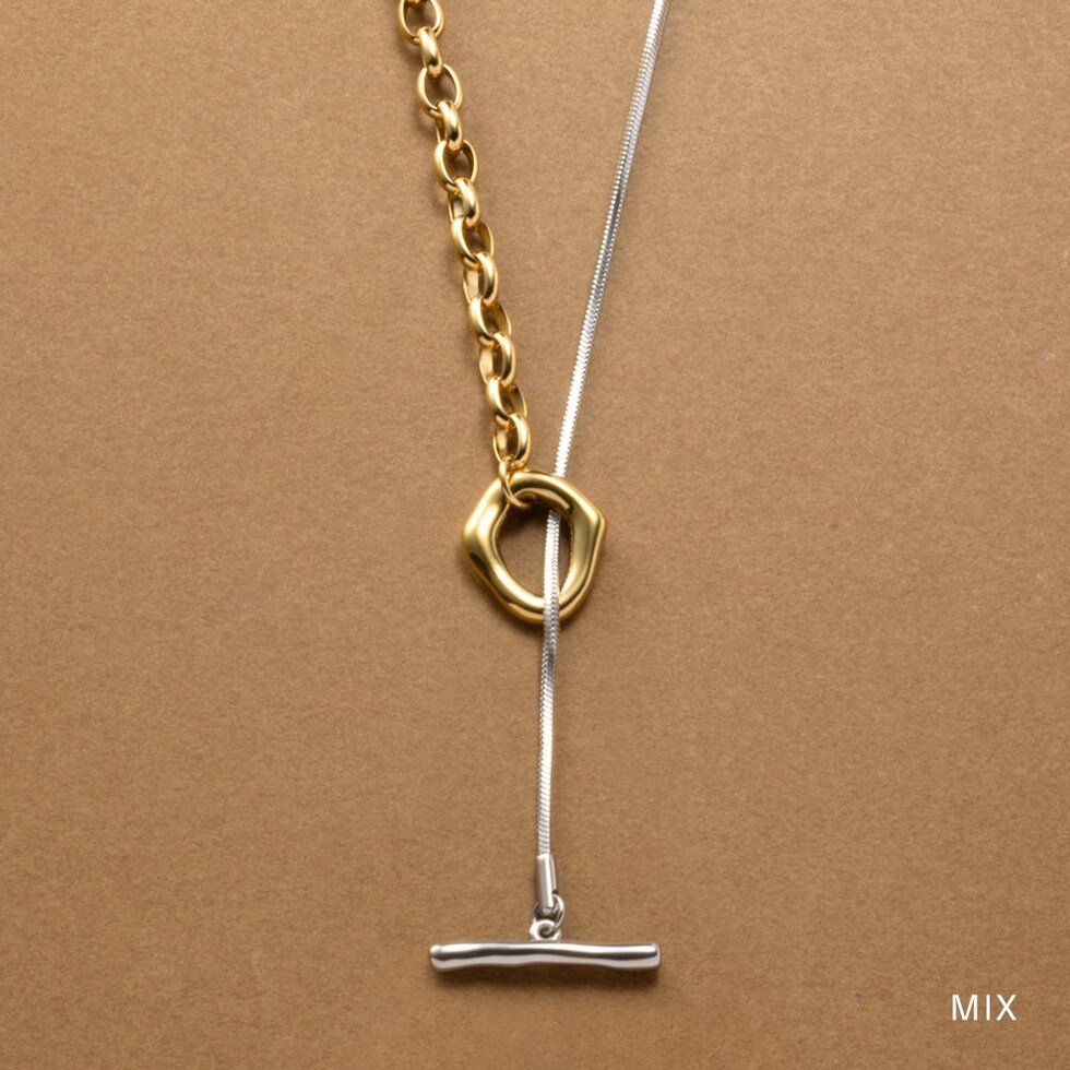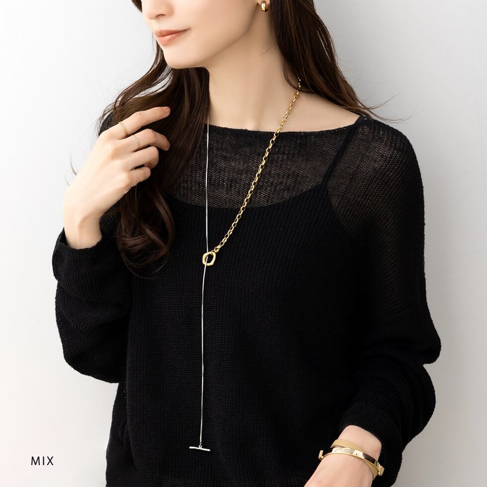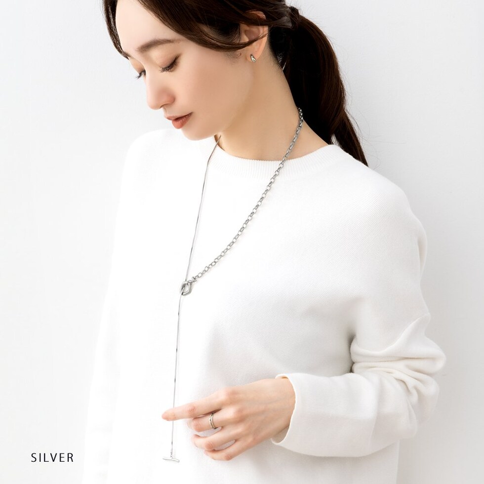 しなやかなスネークチェーンと存在感のあるサークルチェーンを組み合わせたY字ロングネックレス。クラフト感のあるエンドパーツとマンテルが大人モダンな印象に仕上げてくれます。2連にしてもお使いいただけるので、スタイリングに合わせて楽しめます。錆びにくいステンレス製だからデイリー使いにぴったりの一品です。