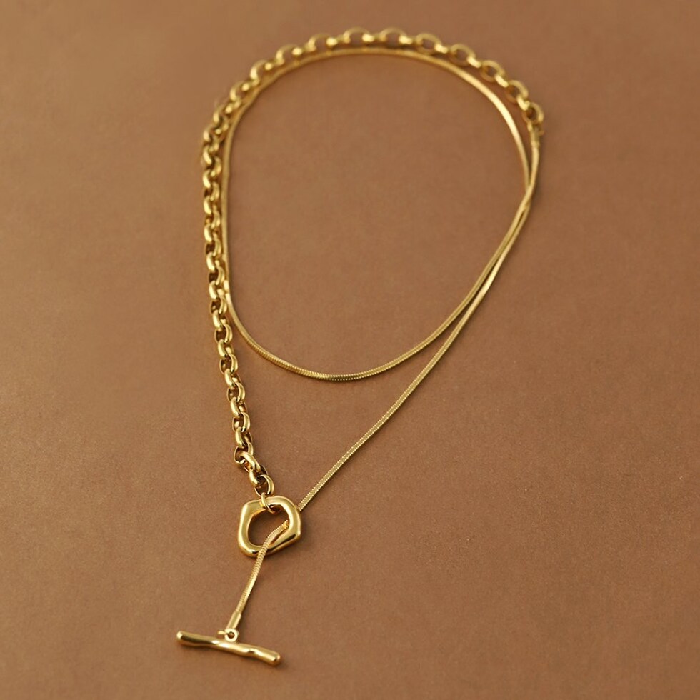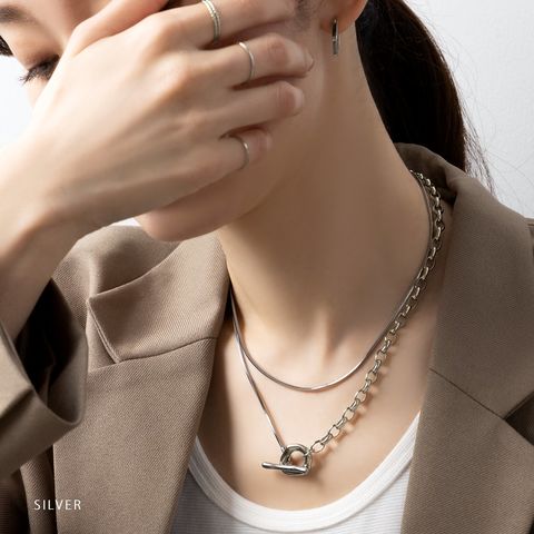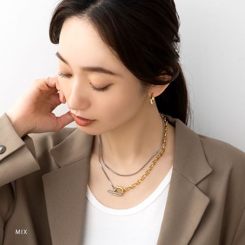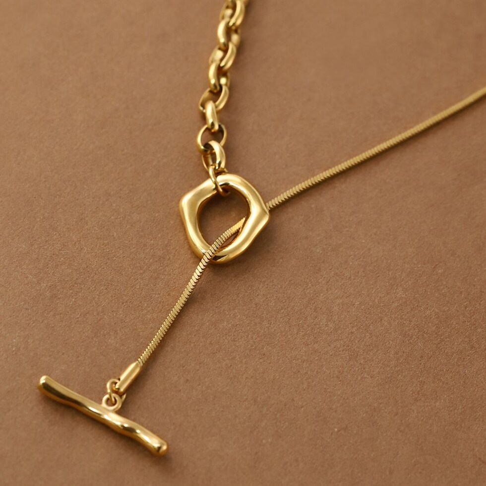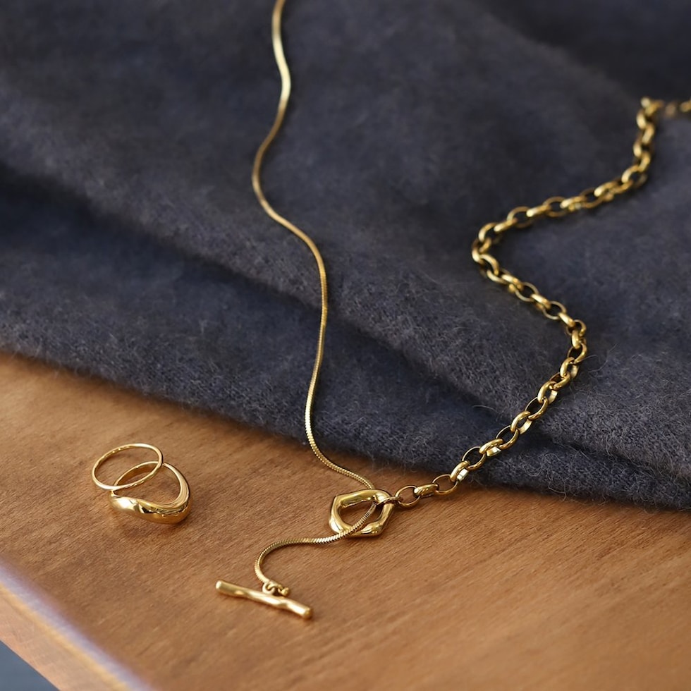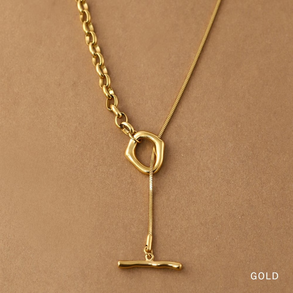 しなやかなスネークチェーンと存在感のあるサークルチェーンを組み合わせたY字ロングネックレス。クラフト感のあるエンドパーツとマンテルが大人モダンな印象に仕上げてくれます。2連にしてもお使いいただけるので、スタイリングに合わせて楽しめます。錆びにくいステンレス製だからデイリー使いにぴったりの一品です。