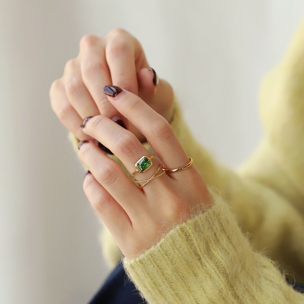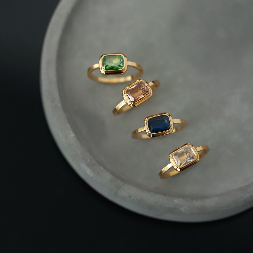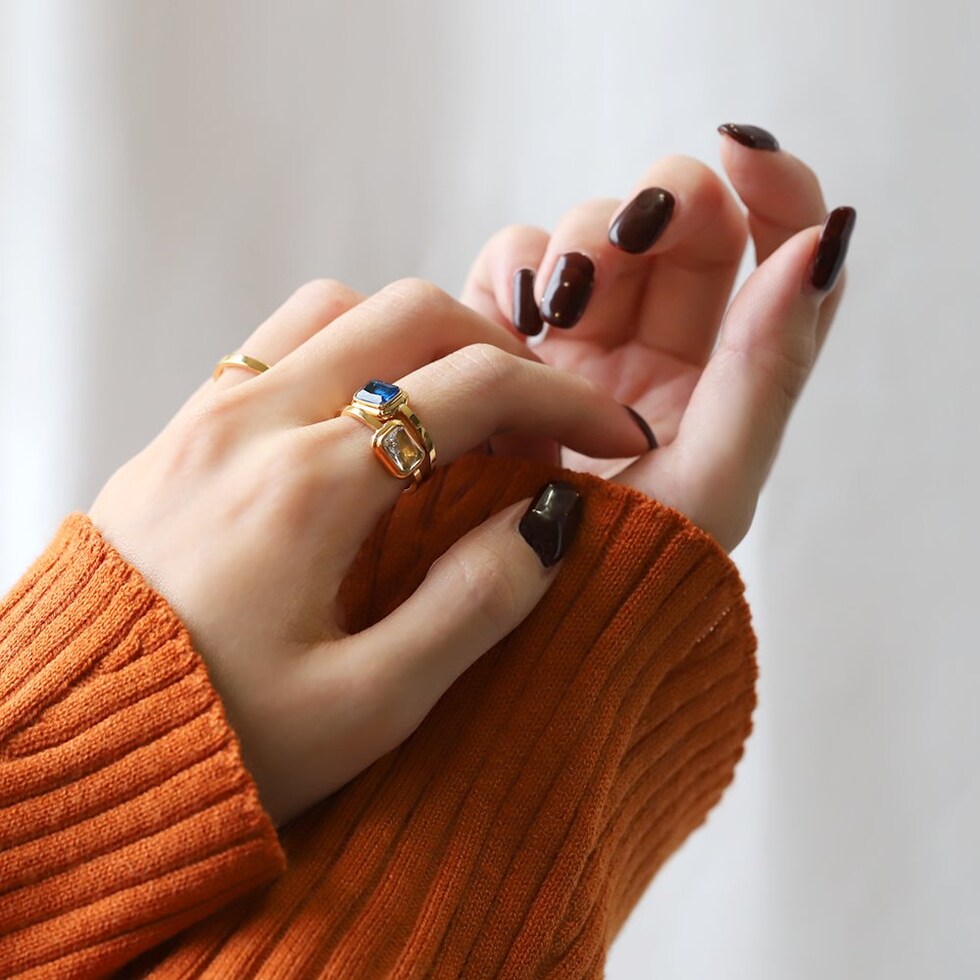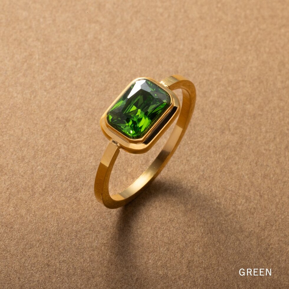 フラットカットを施したスクエアビジューがシャープに煌くリング。お洒落な色石アイテムは手元コーデの主役として大活躍間違いナシ◎色違いで重ねづけすればよりトレンド感がアップします。錆びにくいステンレス製でデイリーに活躍しそう。