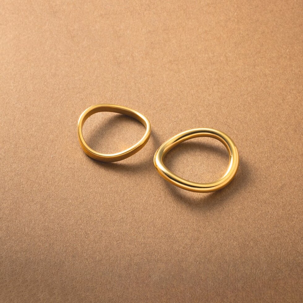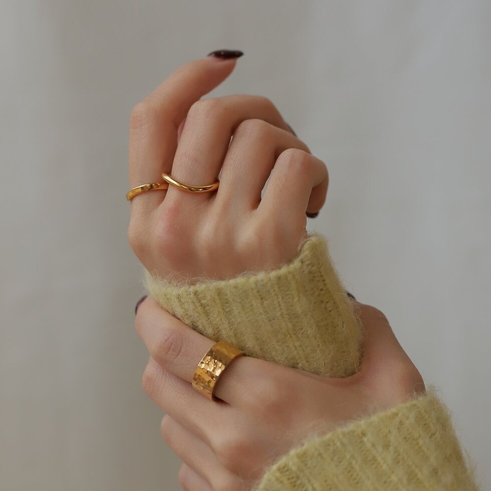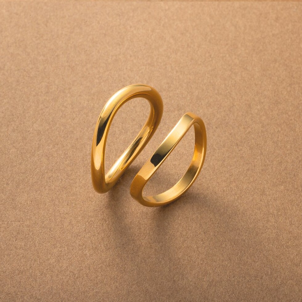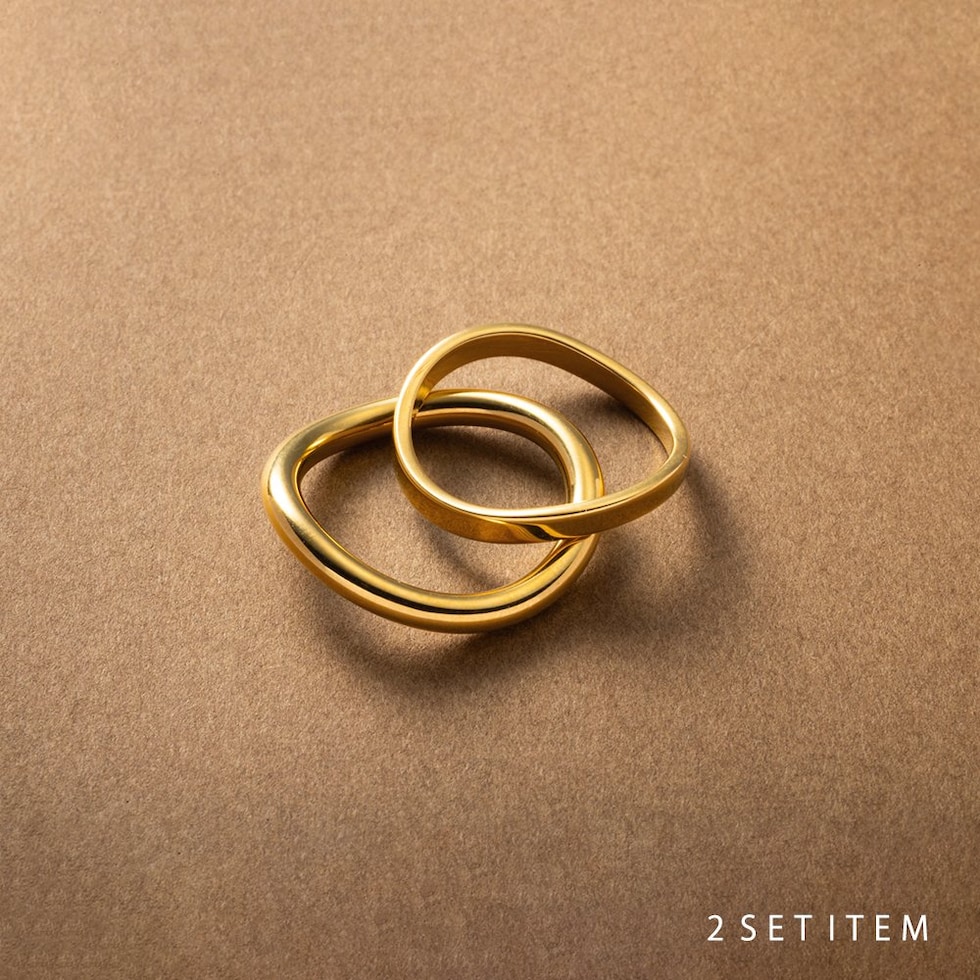 緩やかなカーブをかけた絶妙なシルエットが女性らしくニュアンスのある仕上がりの2setリング。幅広いスタイルにマッチし、長時間の着用にもオススメなステンレス製。重ね着けはもちろん単品使いにも◎