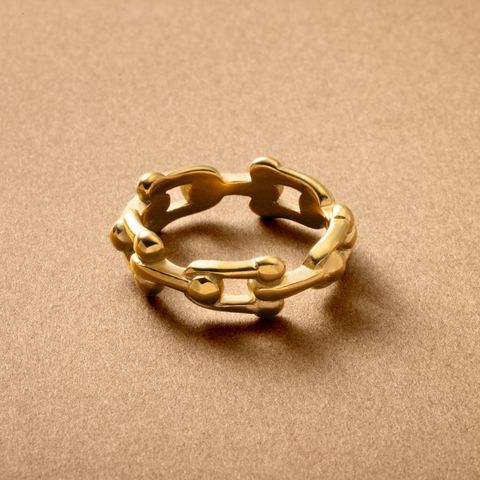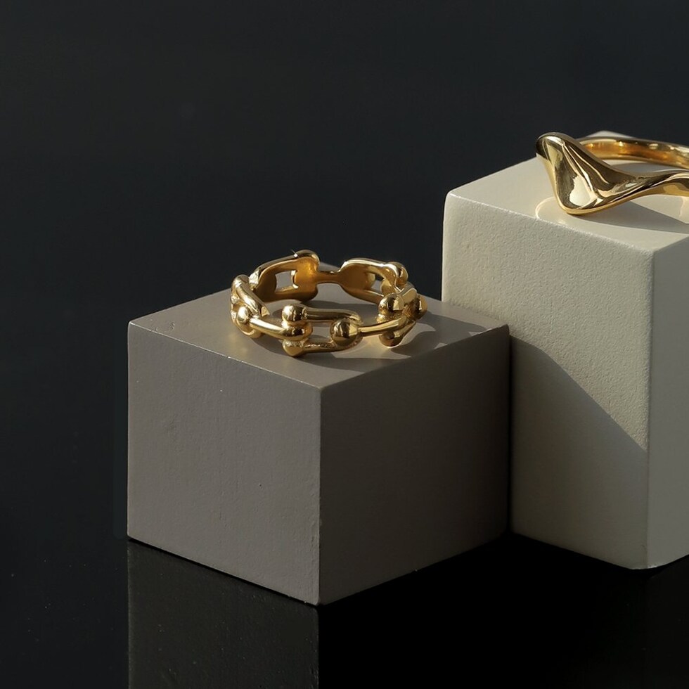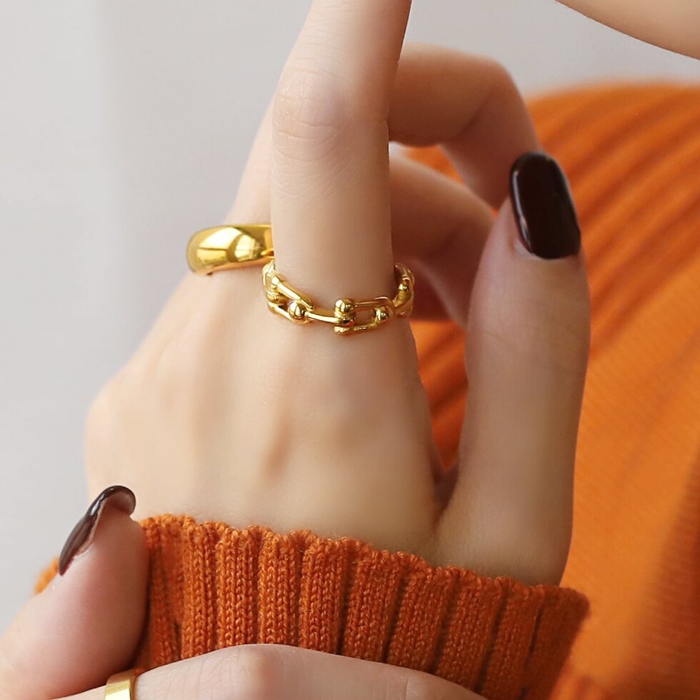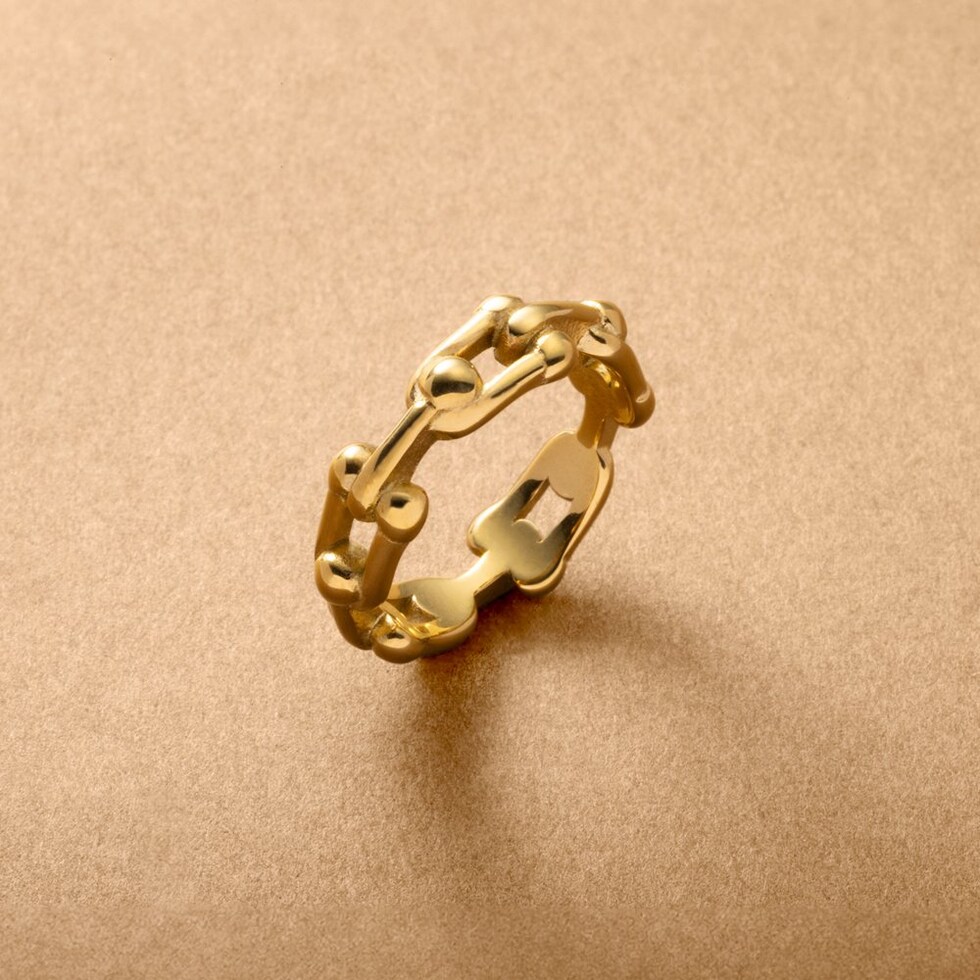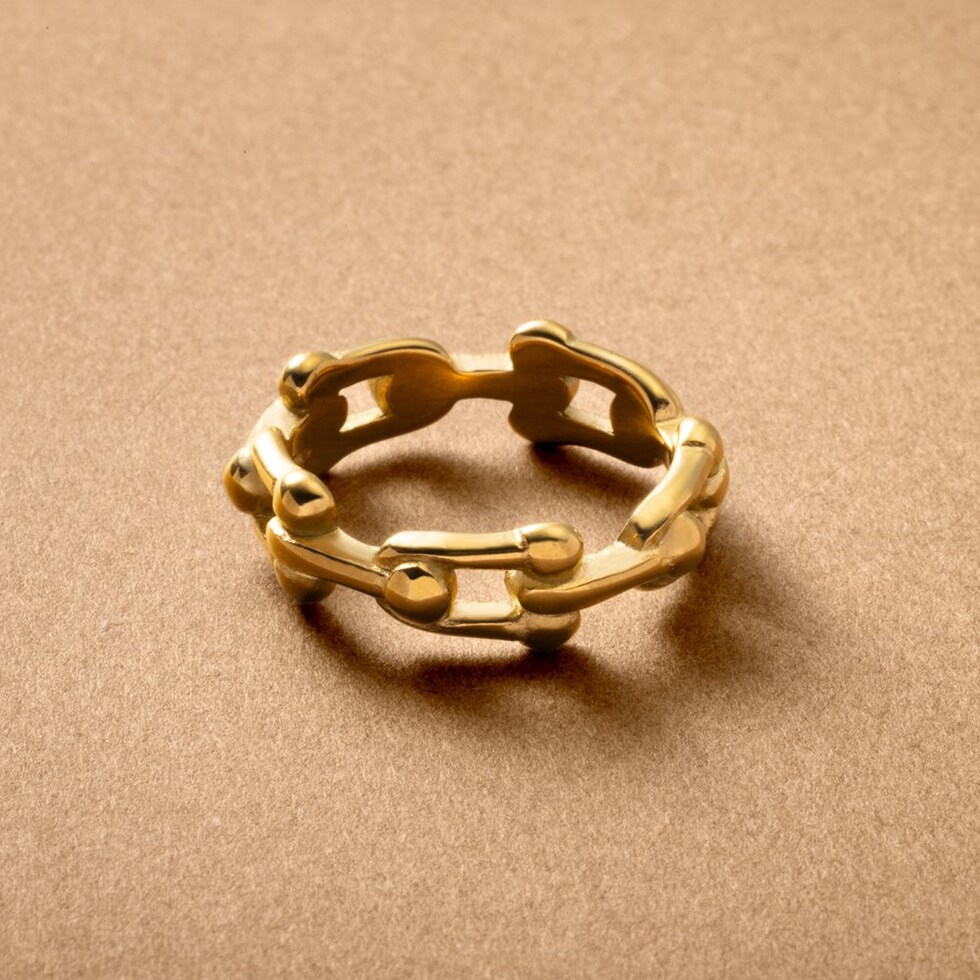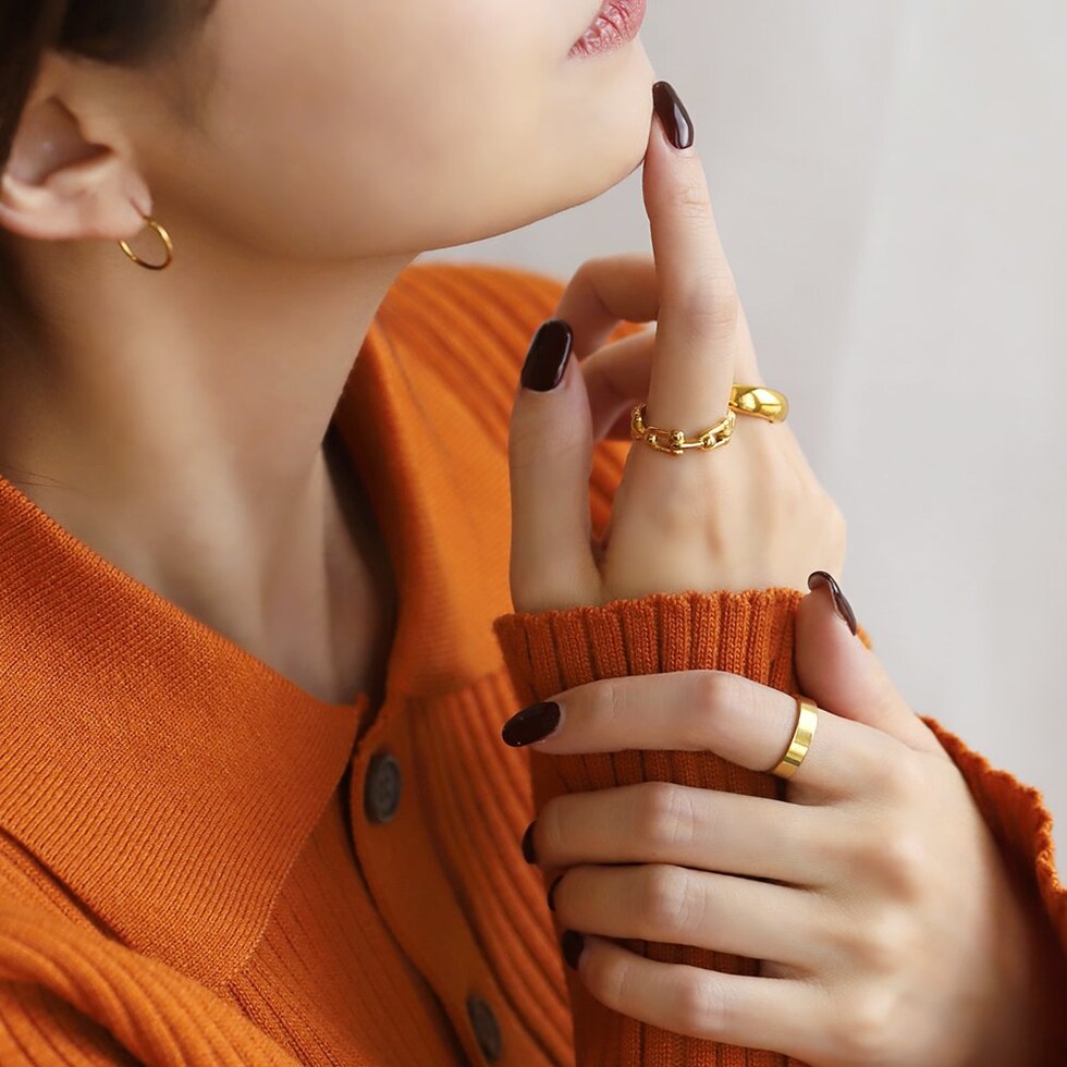 リンキングがモダンな存在感をプラスしてくるチェーンリング。個性の効いたデザインがひと味違った洗練された手元を演出してくれます。程よい存在感と錆びにくいステンレス製だからデイリーに活躍しそう。