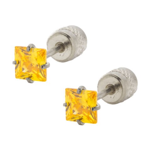 ピアス ステンレス 金属アレルギー サージカルステンレス レディース 80種類 つけっぱなし 限定色 一粒ビジュー ネジ式 カラーストーン 両耳用 スクエア 四角 cream dot ゆうパケット [シルバー×イエロー_4mm]
