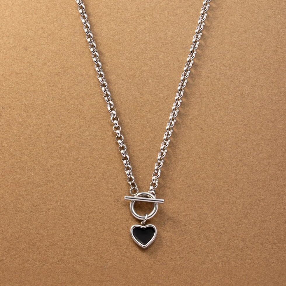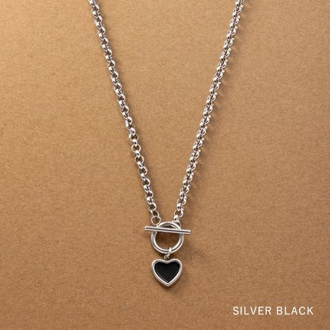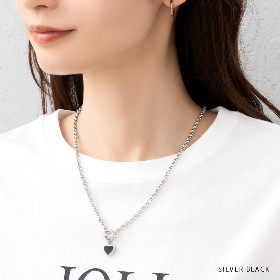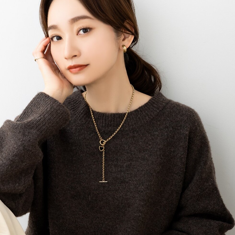 重厚感のあるチェーンとハートモチーフのステンレス製マンテルネックレス。女性らしい遊び心あるモチーフと辛口なチェーンがひと味違う今っぽいスタイルを完成させます。程よいボリュームと錆びにくいステンレス製でデイリーに活躍するひと品。