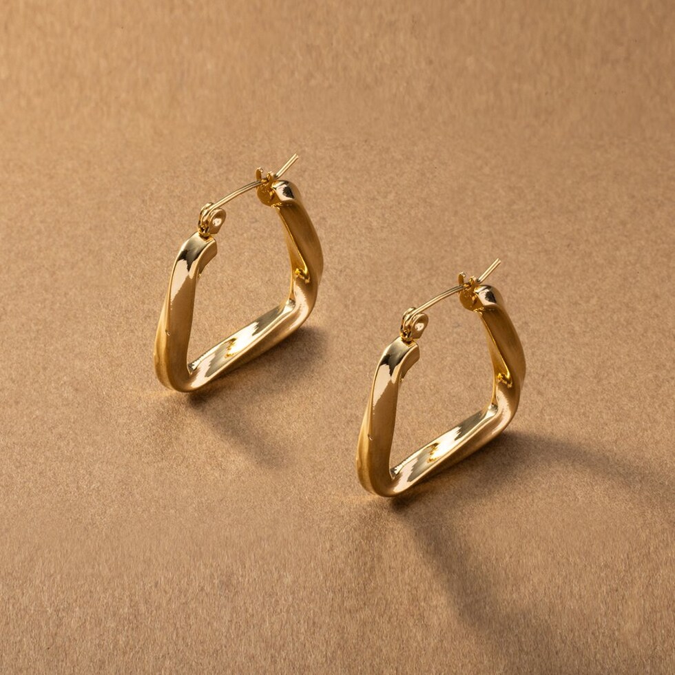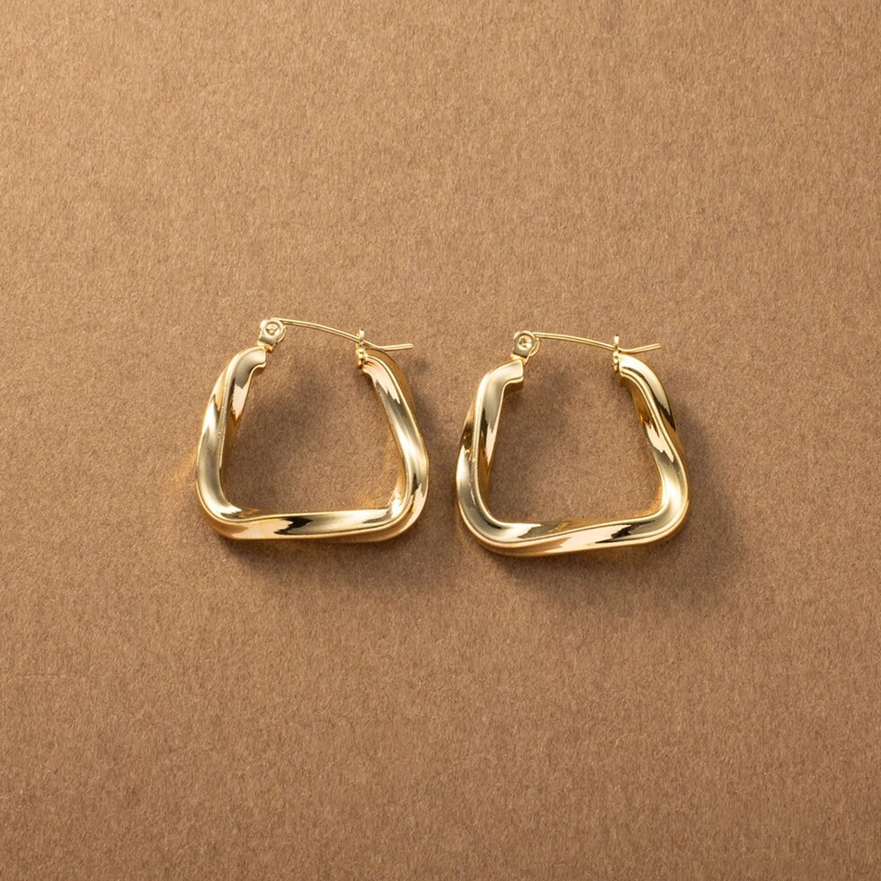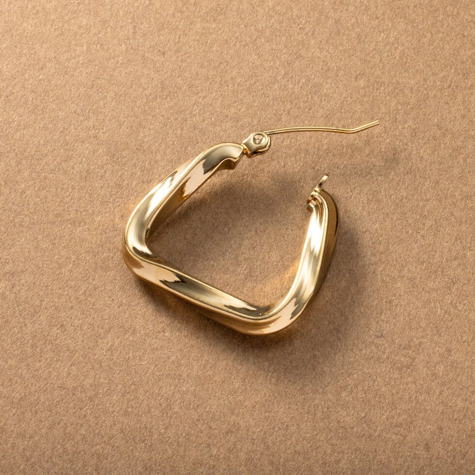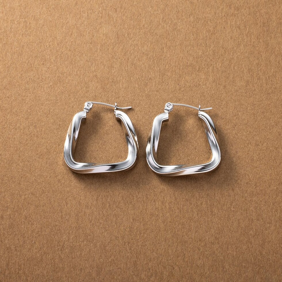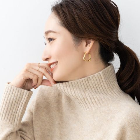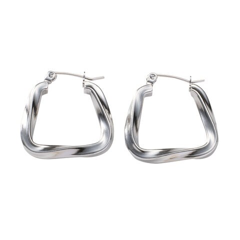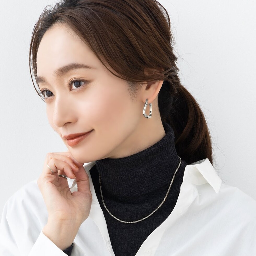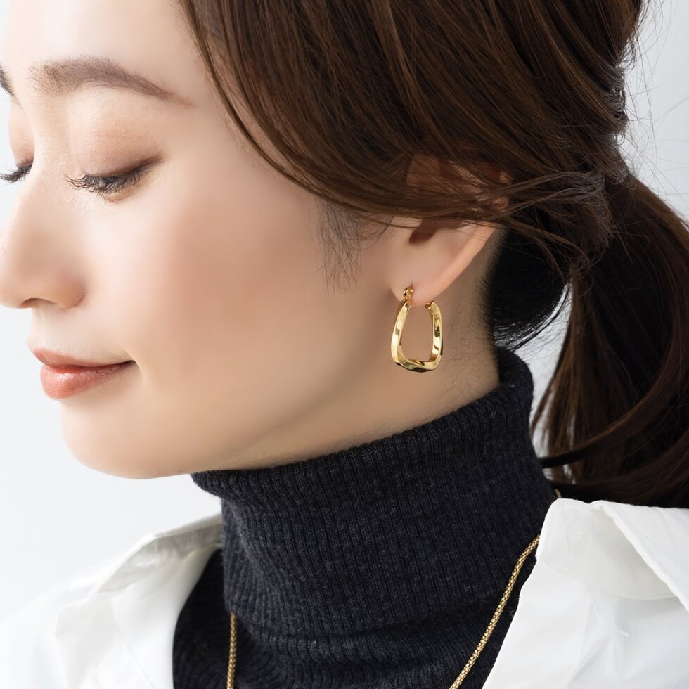 ひねりを効かせたツイストラインが優美なフープピアス。シンプルだけど動きのある上品なフォルムが洗練されたオトナの耳元へと導きます。着脱が楽ちんなキャッチレスデザインでデイリーに活躍しそう。錆びにくく傷に強いステンレス製で、長時間の着用も安心の低アレルギー素材です。