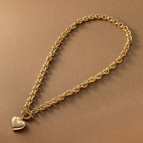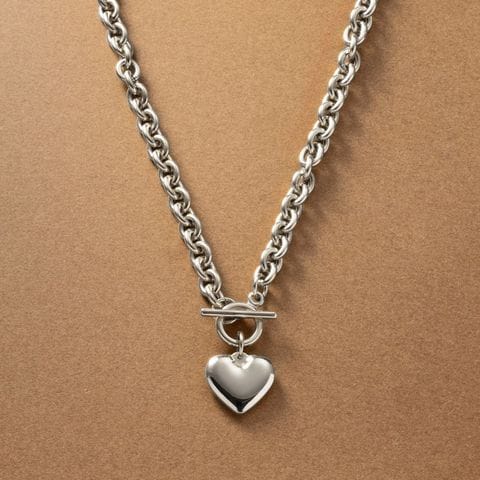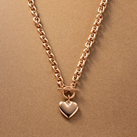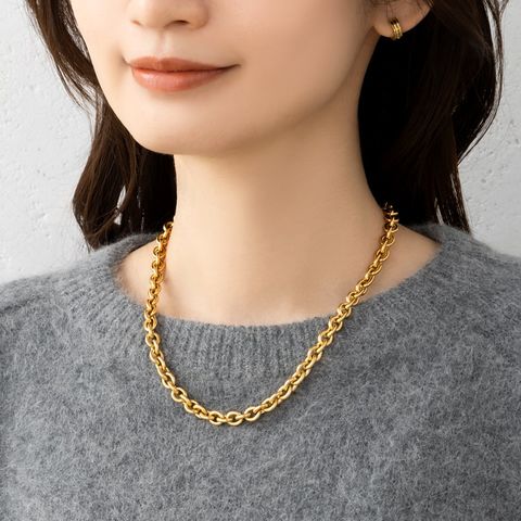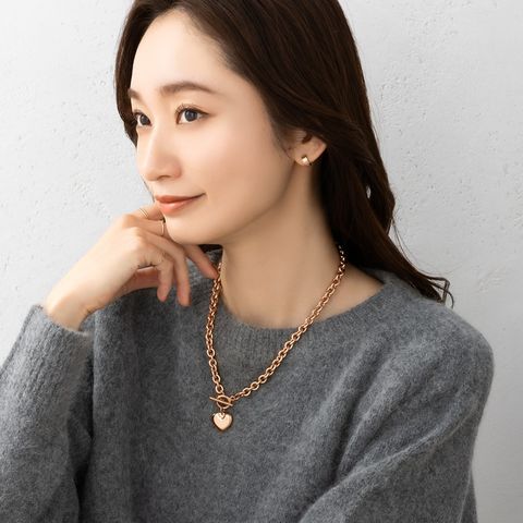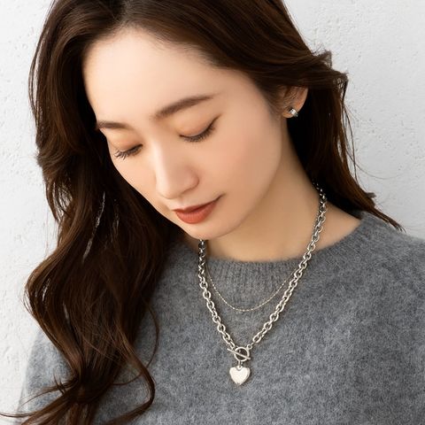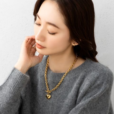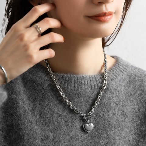 重厚感たっぷりなごつめチェーンとハートモチーフのステンレス製マンテルネックレス。女性らしい遊び心あるモチーフと辛口なチェーンがひと味違う今っぽいスタイルを完成させます。コーデに映える存在感と錆びにくいステンレス製でデイリーに活躍するひと品。