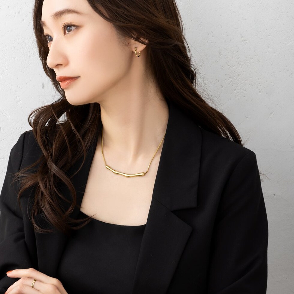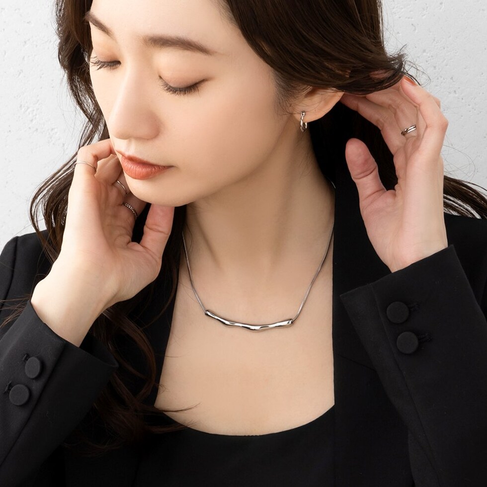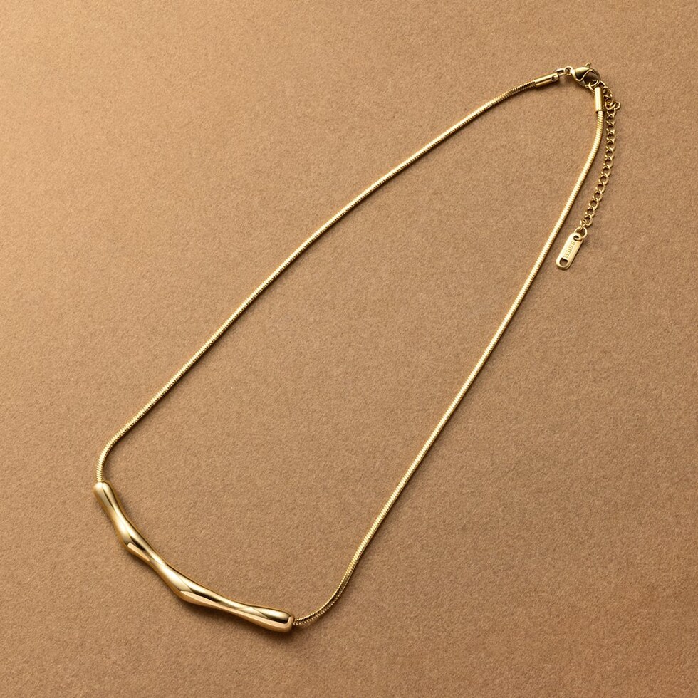 存在感のあるクラフト調のメタルが高見えなネックレス。しなやかなスネークチェーンとの組み合わせが洗練された大人な印象をプラスします。錆びにくく傷に強いステンレス製でデイリーコーデのアクセントにピッタリなひと品。