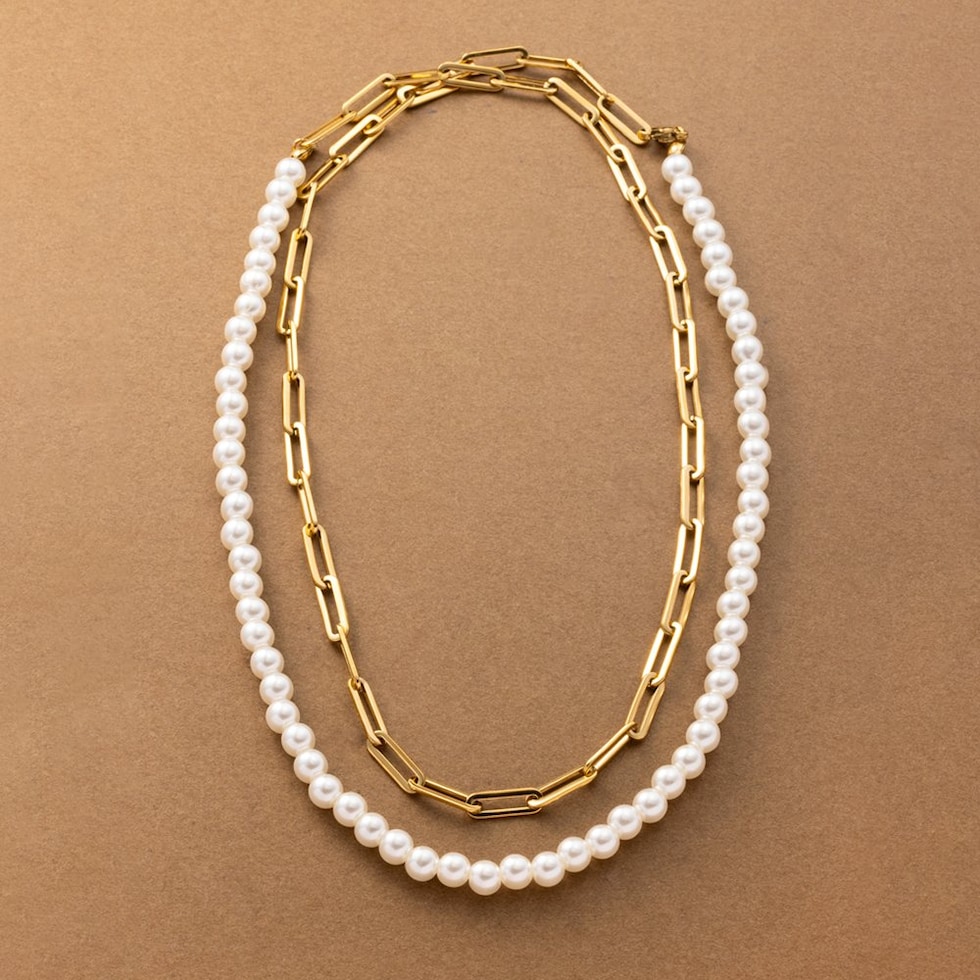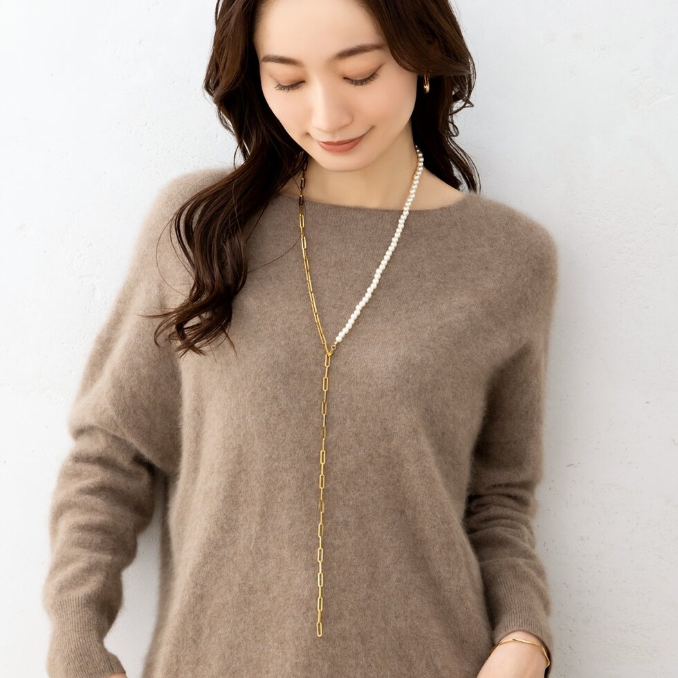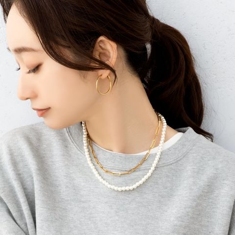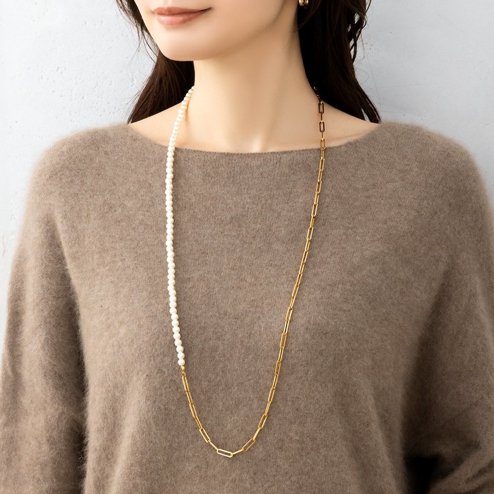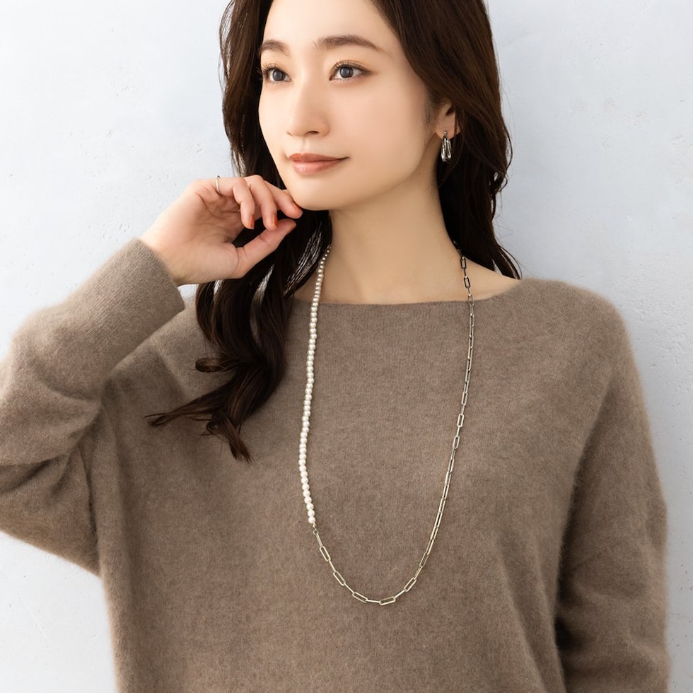 パールとオーバルチェーンが目を惹くロング丈コンビネックレス。お好みで2連にもY字にもアレンジが効く便利なアイテムです。パールとチェーンの組み合わせが大人な外しアイテムとしてコーデを格上げしてくれるひと品。