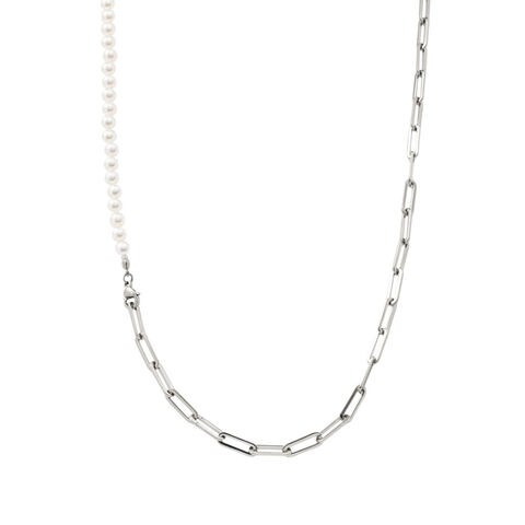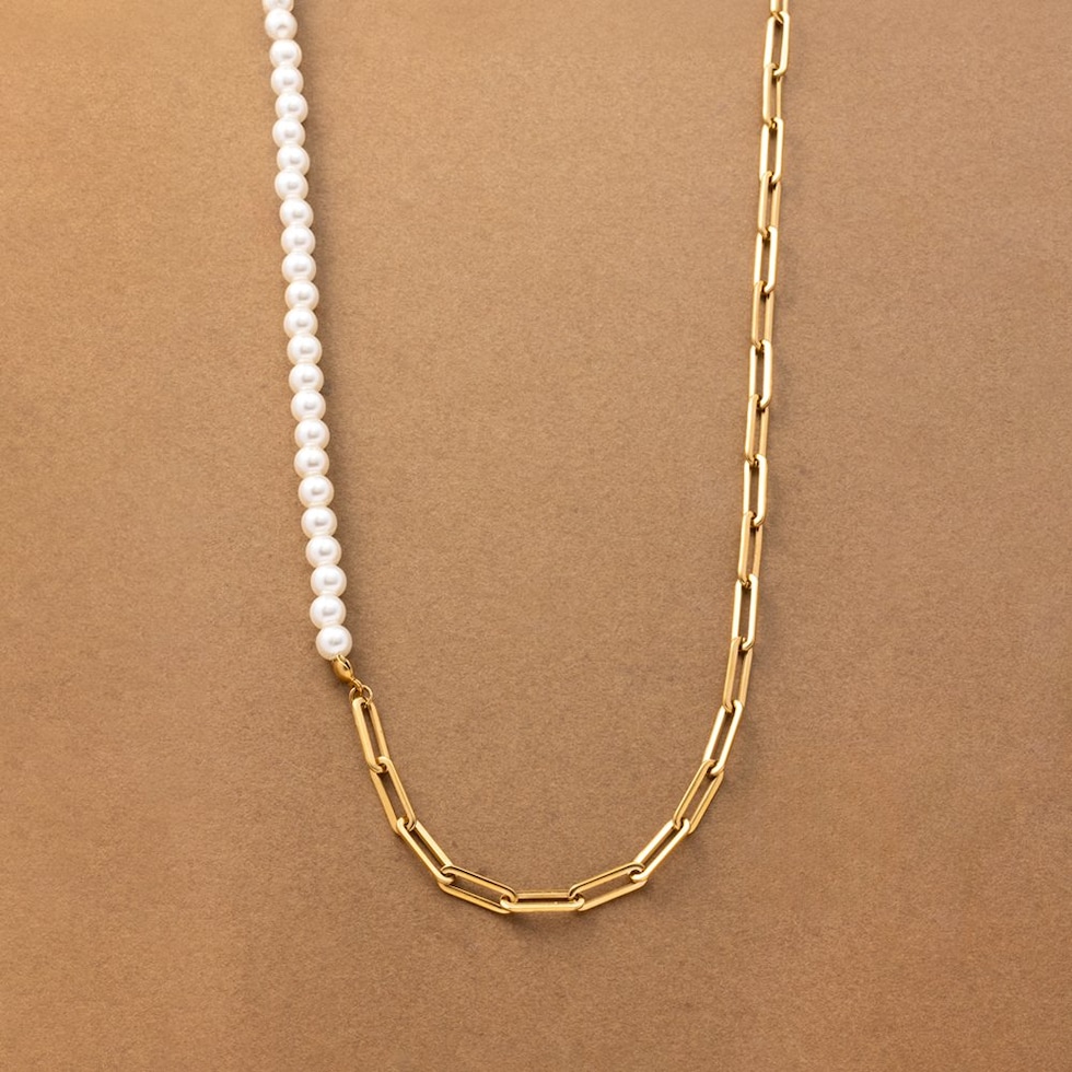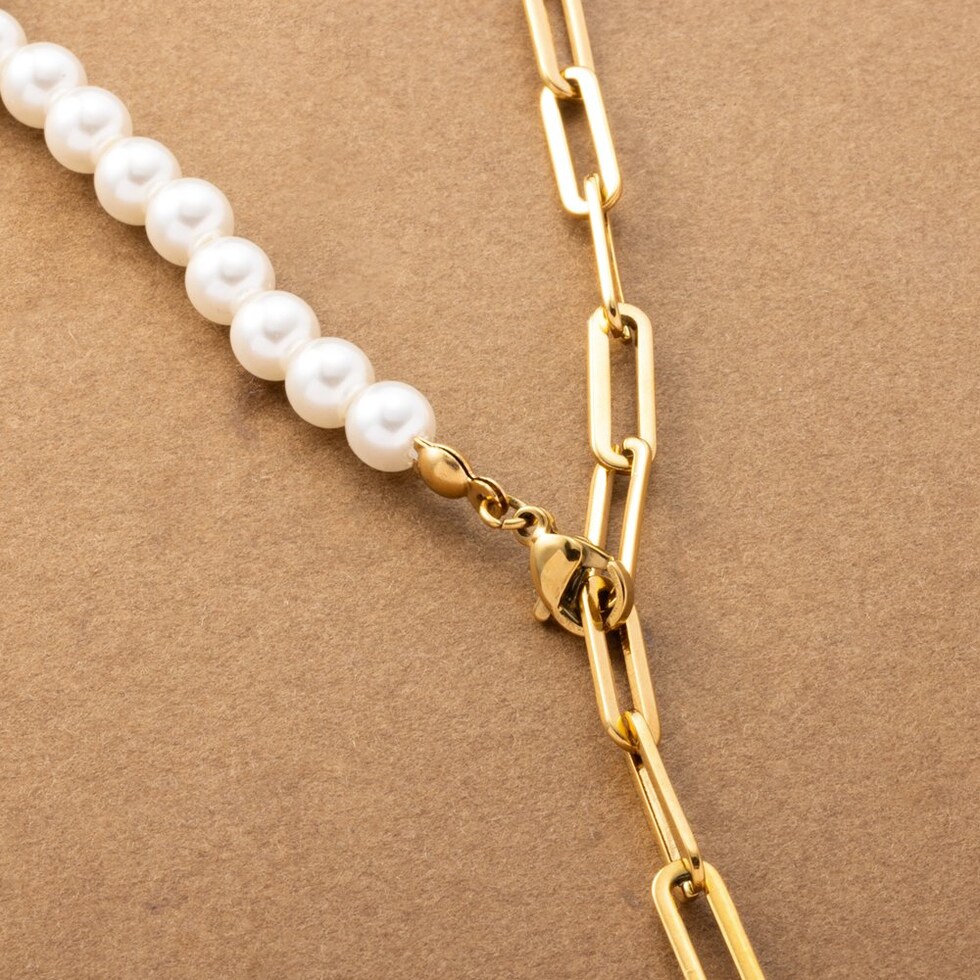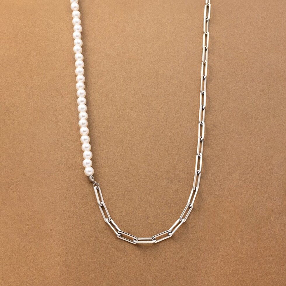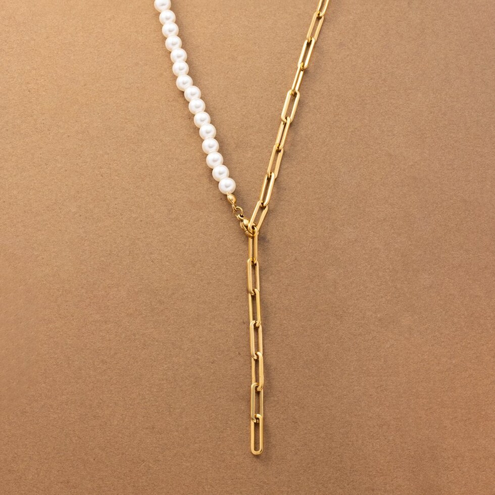 パールとオーバルチェーンが目を惹くロング丈コンビネックレス。お好みで2連にもY字にもアレンジが効く便利なアイテムです。パールとチェーンの組み合わせが大人な外しアイテムとしてコーデを格上げしてくれるひと品。